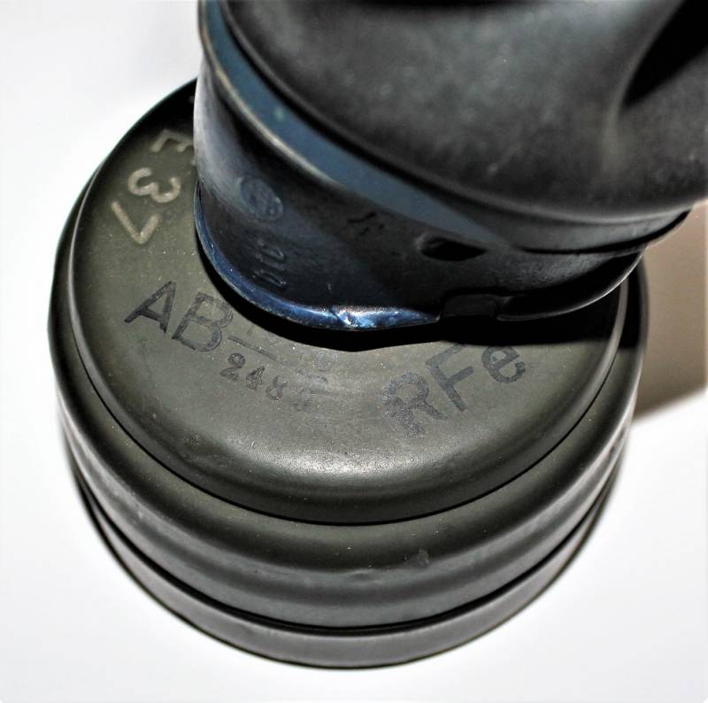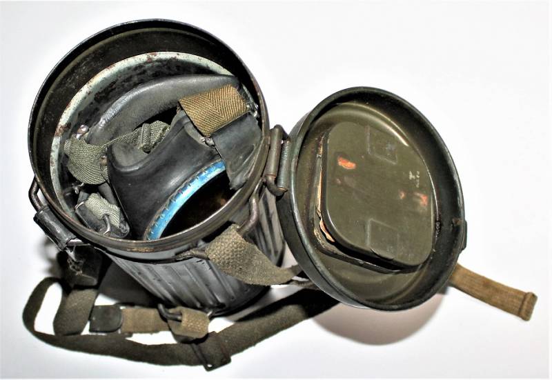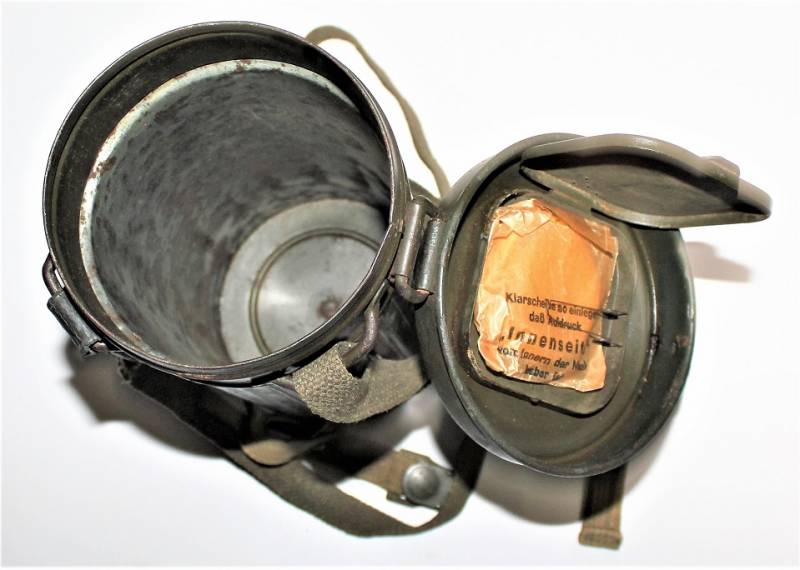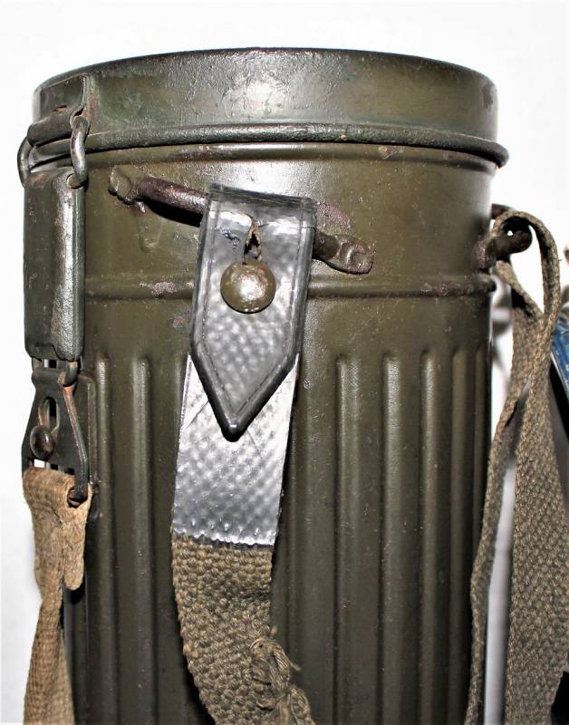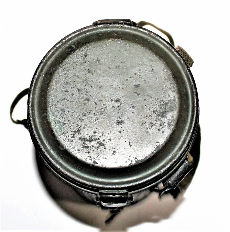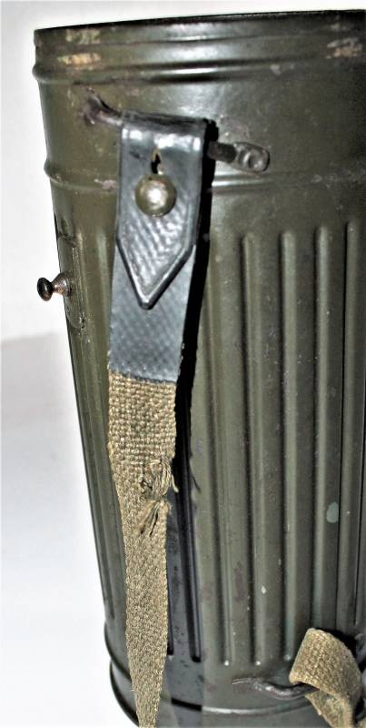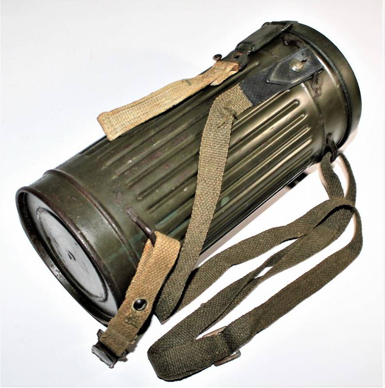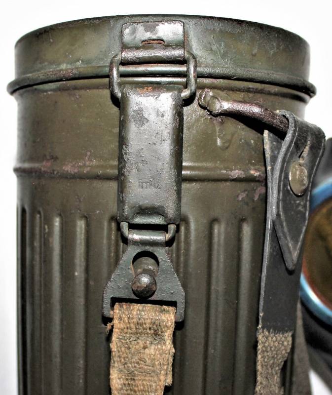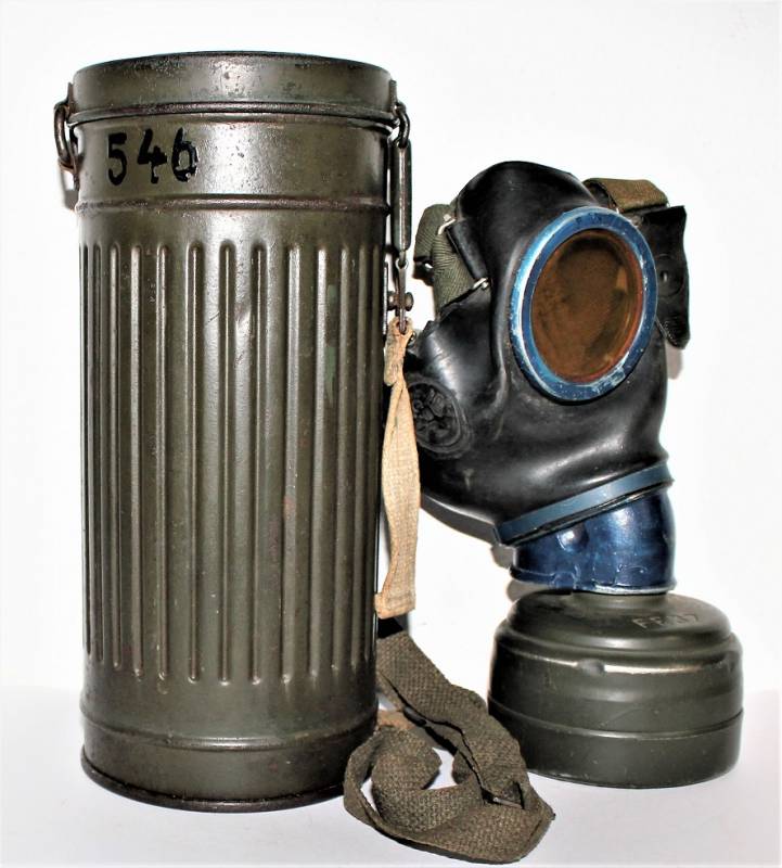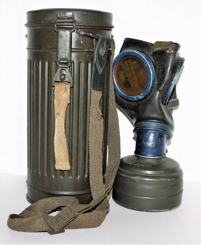 Maschera antigas nata in colorazione verde scuro al 90% in ottime condizioni, non restaurata o riparata, con leggeri segni del tempo e dellŽuso, completa in tutte le sue parti, compreso cinghiaggio in canapa e lenti di ricambio. Marcata internamente con sigla fabbricante, waffenamt e data 1943. Originale 100% WWII periodo.