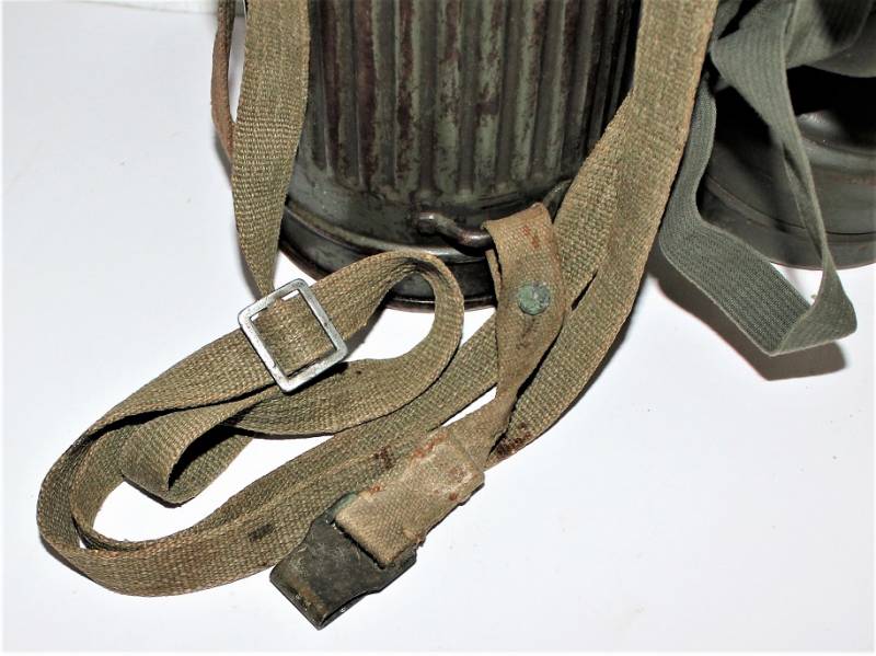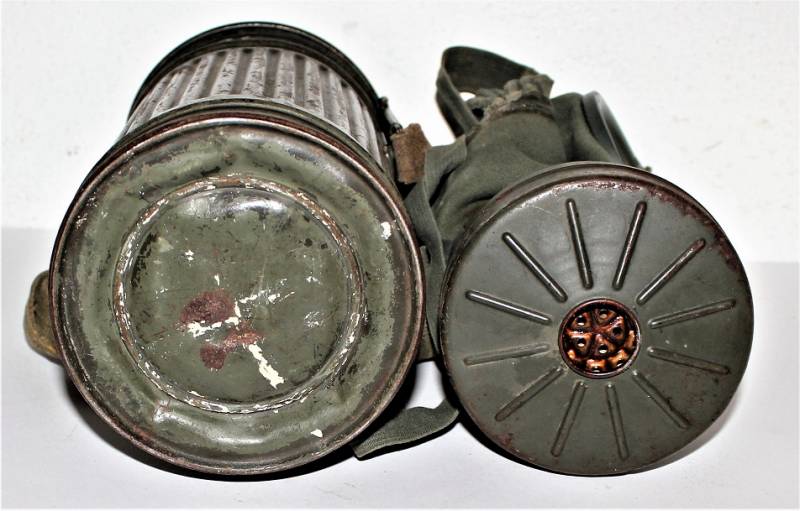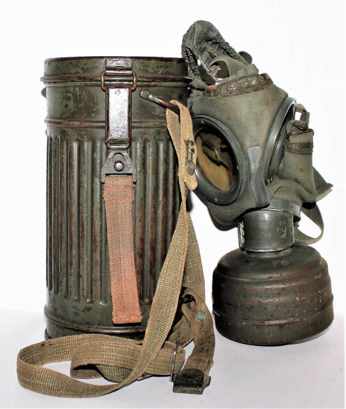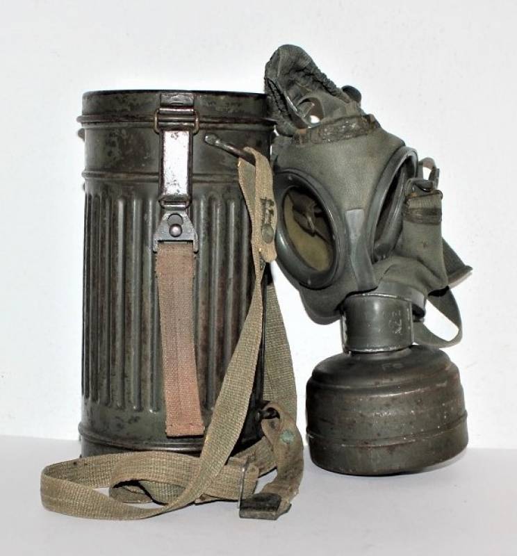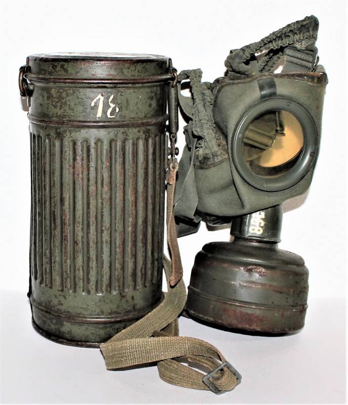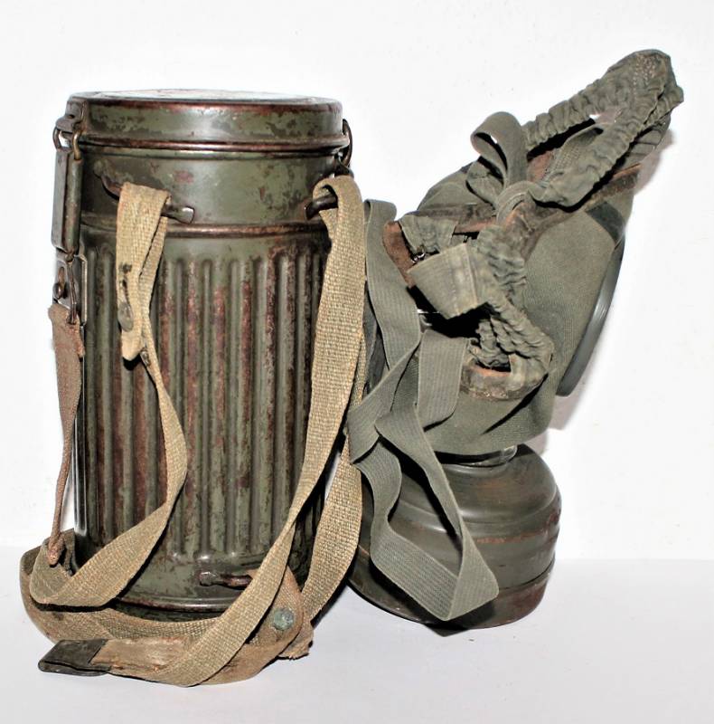 Maschera antigas di 1°modello, contenitore basso, nata in colorazione verde chiaro 1°tipo allŽ85% in ottime condizioni, non restaurata o riparata, con leggeri segni del tempo e dellŽuso, completa in tutte le sue parti, compreso cinghiaggio in canapa e lenti di ricambio. Marcata internamente con codice fabbricante e data 1937. Originale 100% WWII periodo.