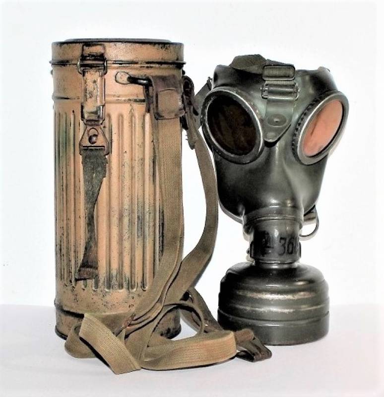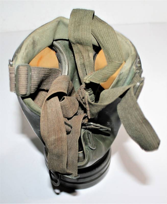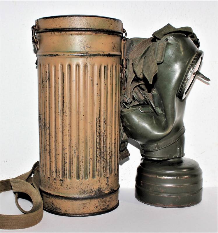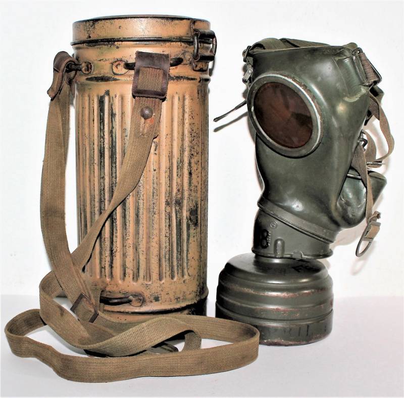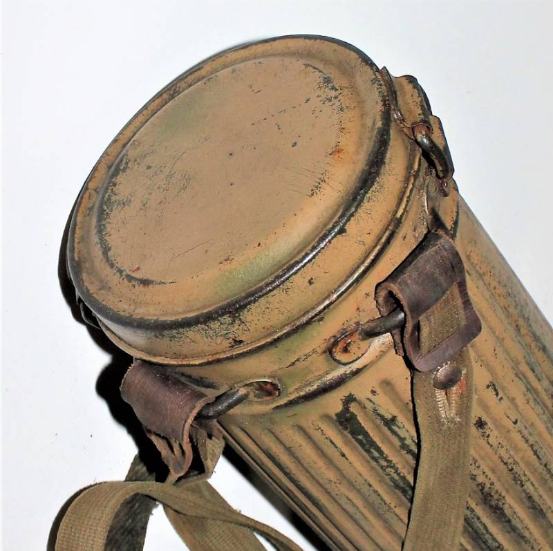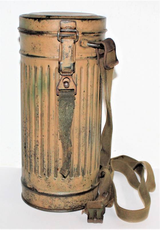 Stupenda e rara maschera antigas in colorazione mimetica gialla DAK probabile Fronte Italiano, sulla vernice gialla sono presenti delle leggere macchie di colorazione mimetica verde chiara, il mimetismo è in ottime condizioni quasi al 90%, completa delle sue cinghie in canapa con passanti in pelle, il tutto con patina del tempo e dellŽuso, non restaurata e senza riparazioni, marcata internamente con codice fabbricante e data 1943.