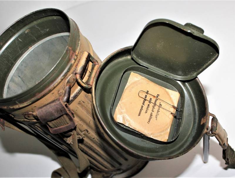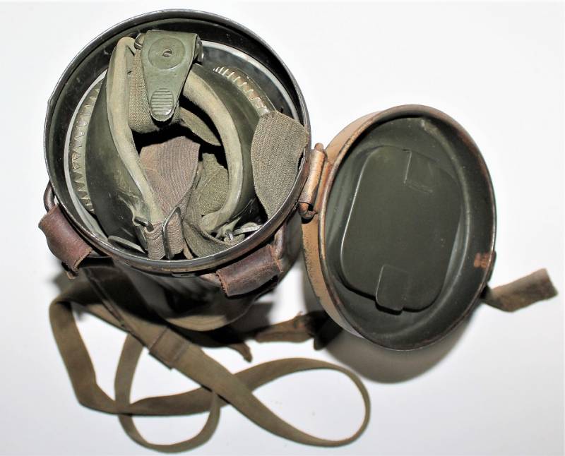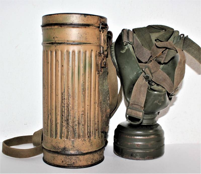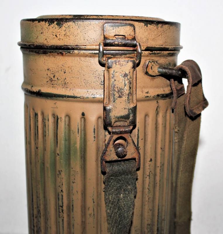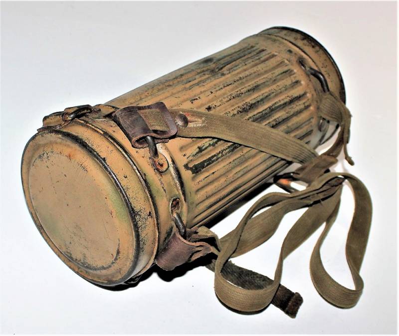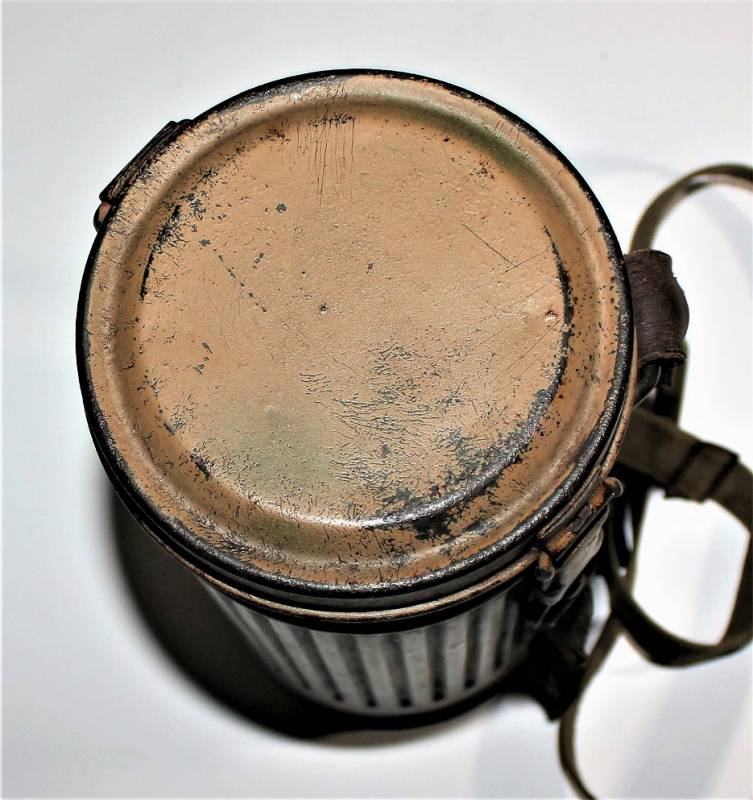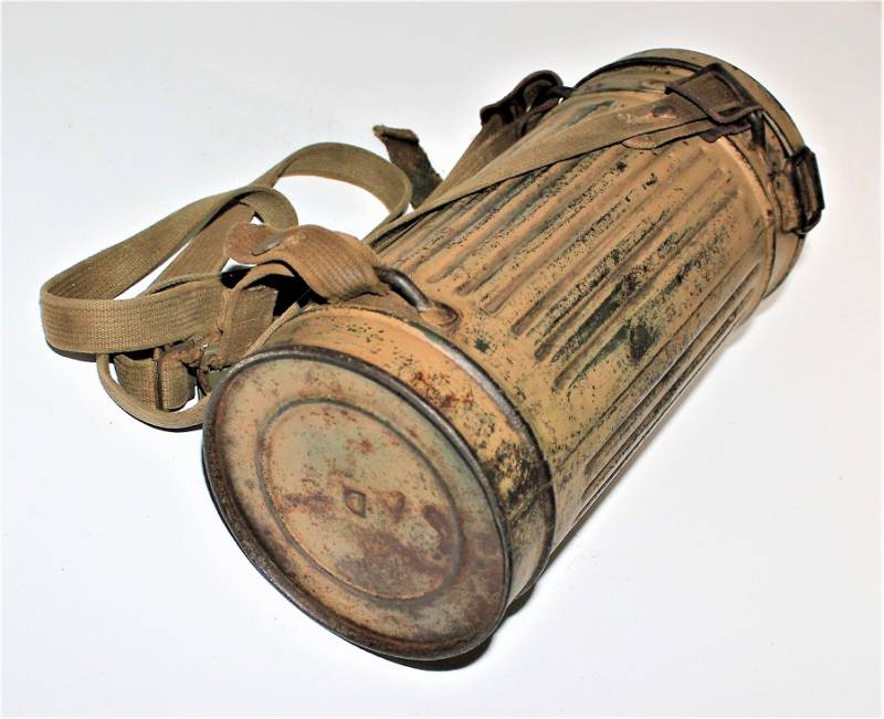 Stupenda e rara maschera antigas in colorazione mimetica gialla DAK probabile Fronte Italiano, sulla vernice gialla sono presenti delle leggere macchie di colorazione mimetica verde chiara, il mimetismo è in ottime condizioni quasi al 90%, completa delle sue cinghie in canapa con passanti in pelle, il tutto con patina del tempo e dellŽuso, non restaurata e senza riparazioni, marcata internamente con codice fabbricante e data 1943.