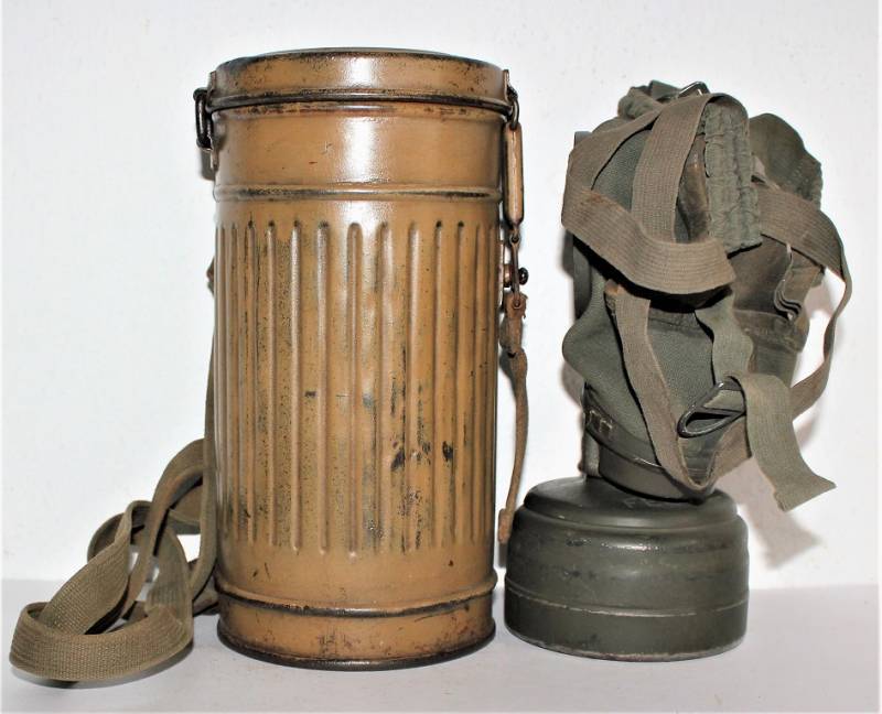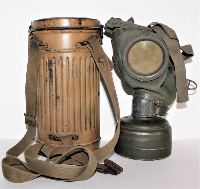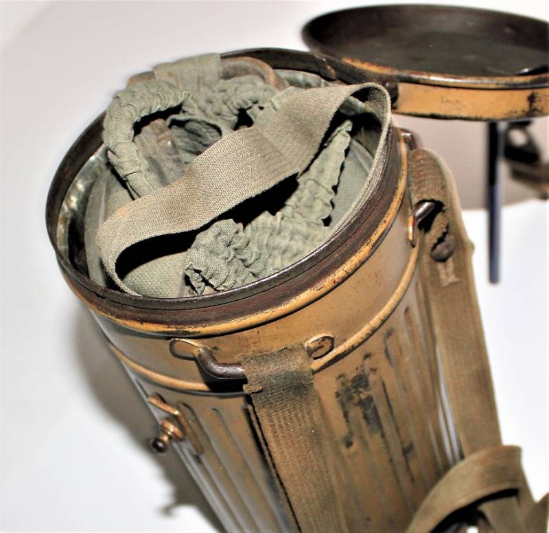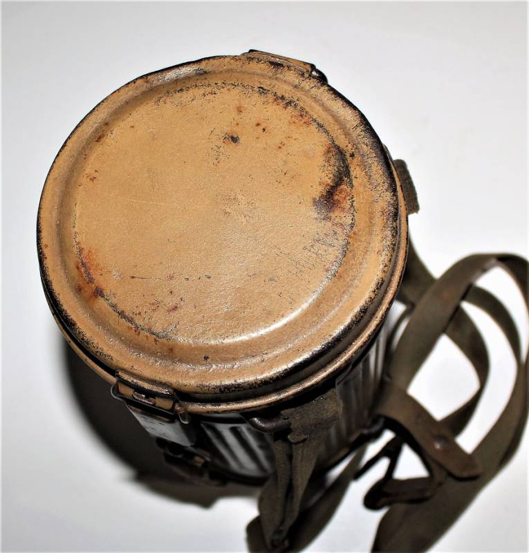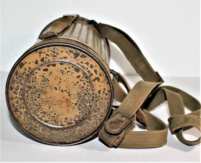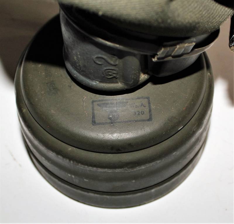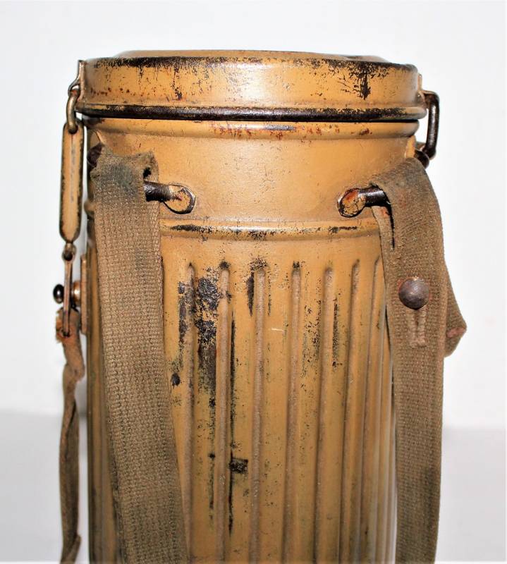 Stupenda e rara maschera antigas modello 1935-38, contenitore basso, colorazione mimetica gialla DAK probabile Fronte Italiano, il mimetismo è in ottime condizioni circa al 95%, completa delle sue cinghie in canapa e della molla ferma panno, il tutto con leggera patina del tempo e dellŽuso, non restaurata e senza riparazioni, marcata internamente con codice fabbricante e data 1939.