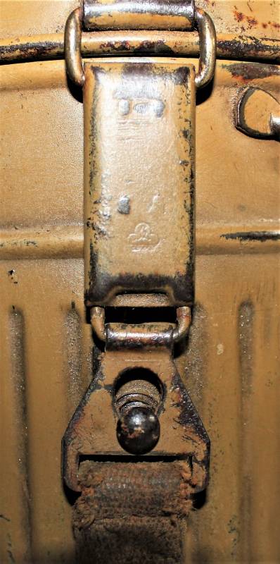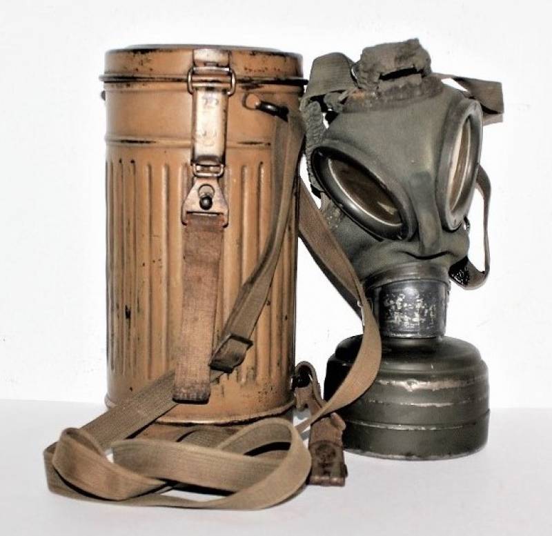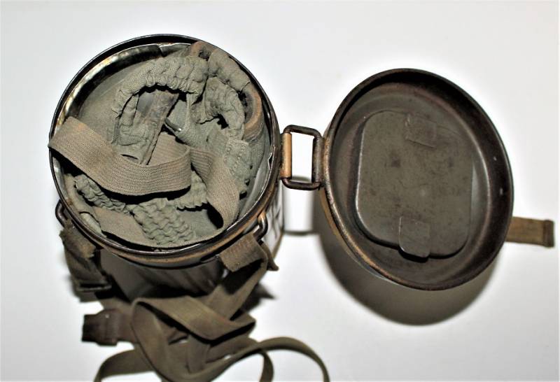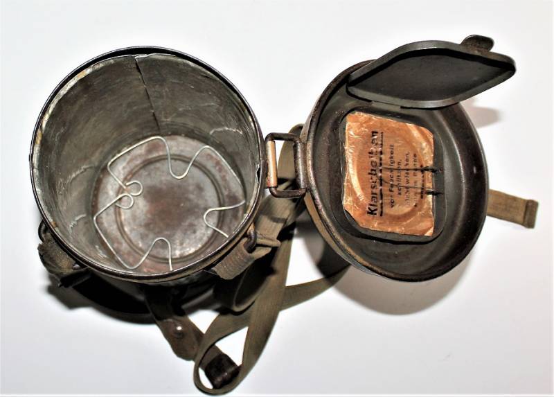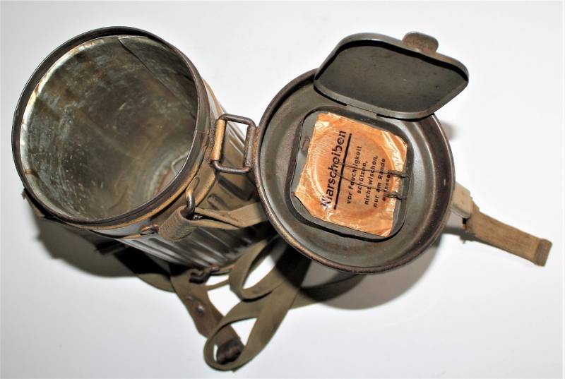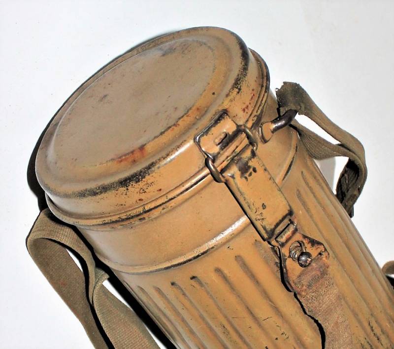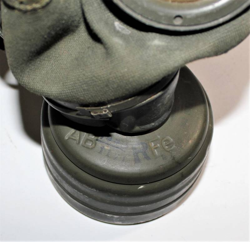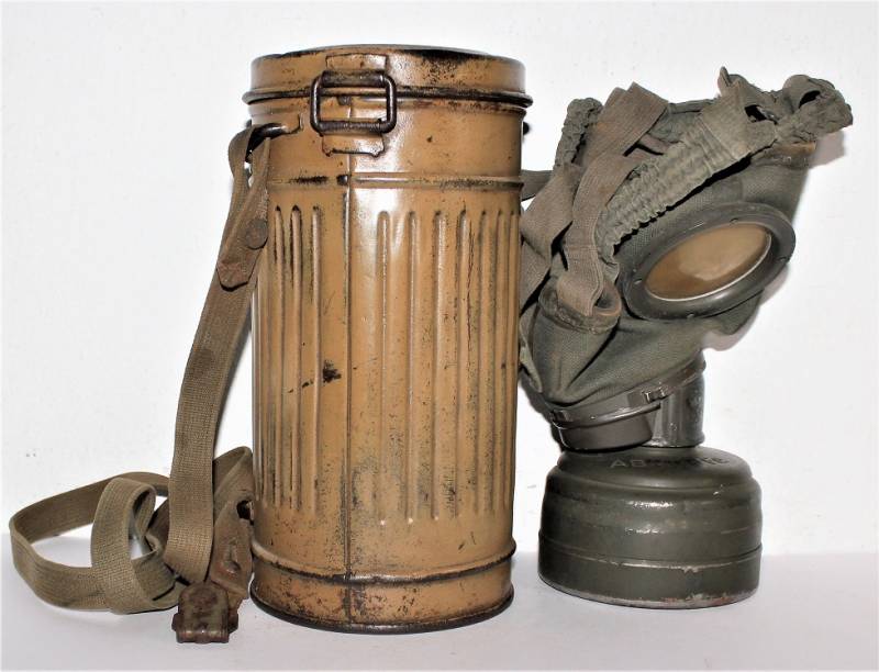 Stupenda e rara maschera antigas modello 1935-38, contenitore basso, colorazione mimetica gialla DAK probabile Fronte Italiano, il mimetismo è in ottime condizioni circa al 95%, completa delle sue cinghie in canapa e della molla ferma panno, il tutto con leggera patina del tempo e dellŽuso, non restaurata e senza riparazioni, marcata internamente con codice fabbricante e data 1939.