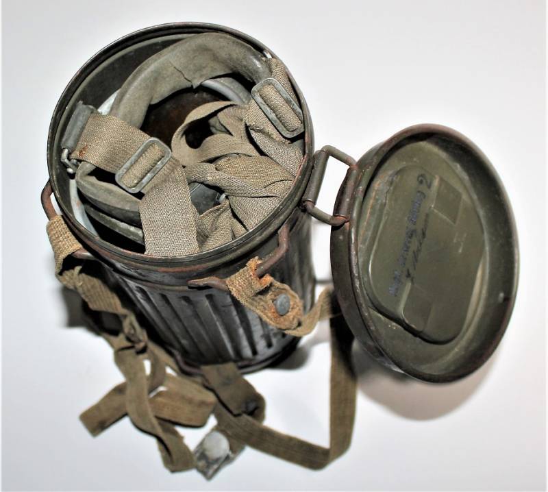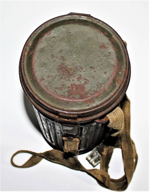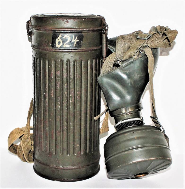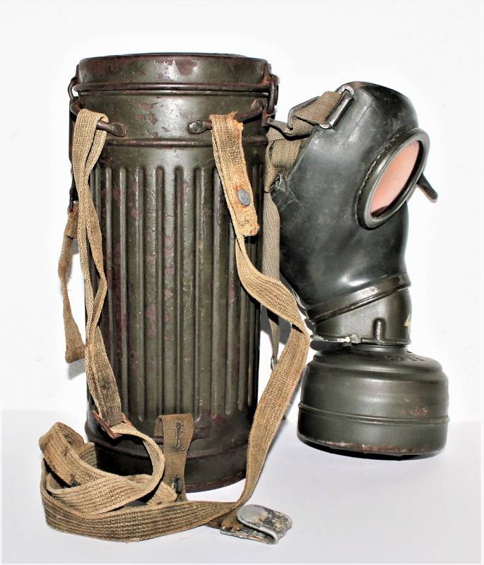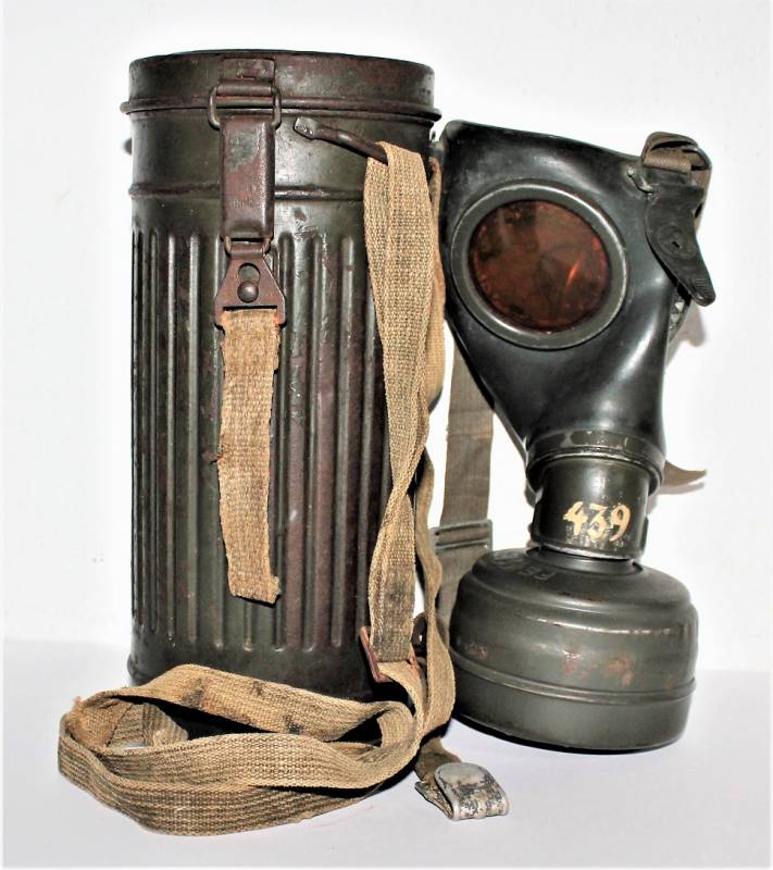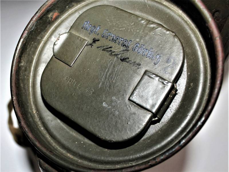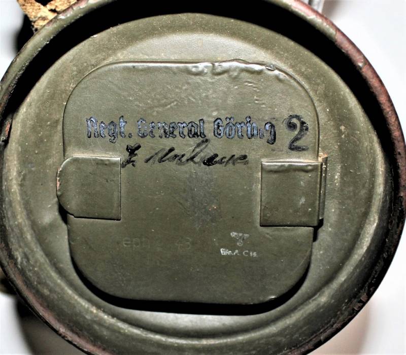 Maschera antigas nata in colorazione verde feldgrau al 70% in buone condizioni, alcune tracce di ruggine superficiali, con patina del temo e dellŽuso, non restaurata o riparata, completa in tutte le sue parti, compreso cinghiaggio in canapa e lenti di ricambio. Marcata internamente con codice fabbricante, data 1943 e waffenamt, inoltre marcata con timbro Reggimento General Goring e firma del soldato.