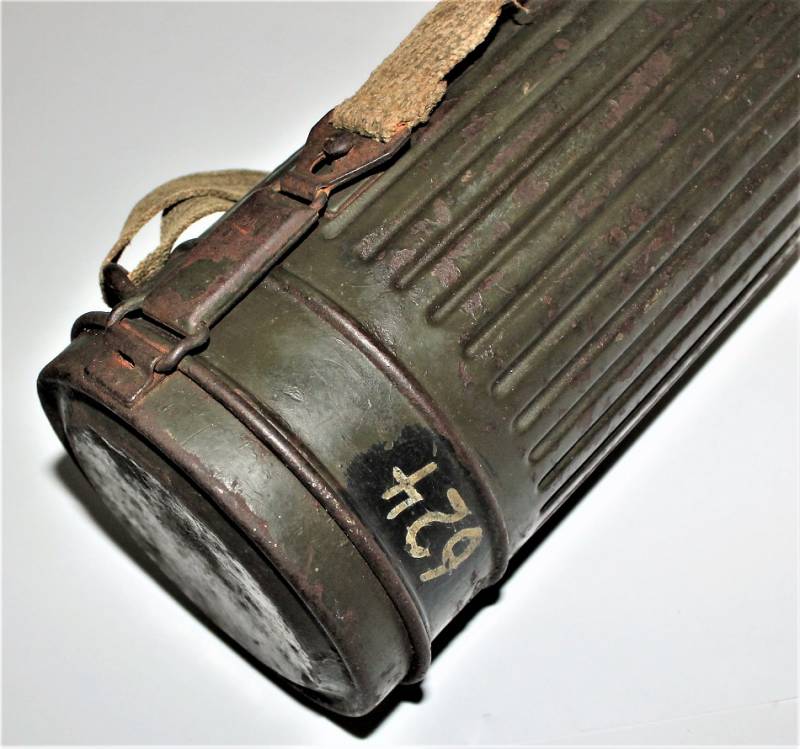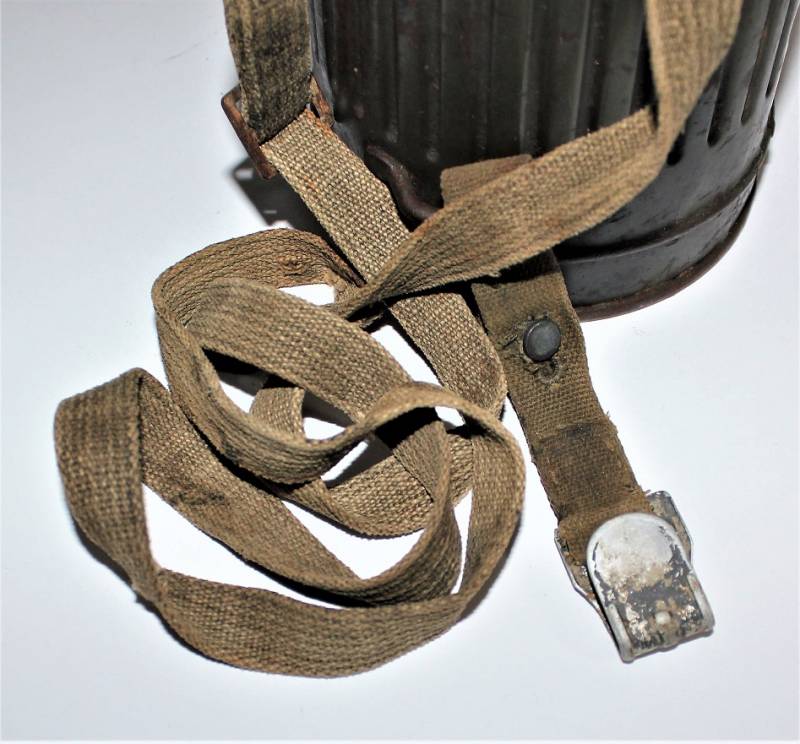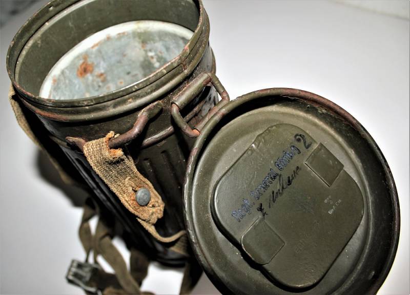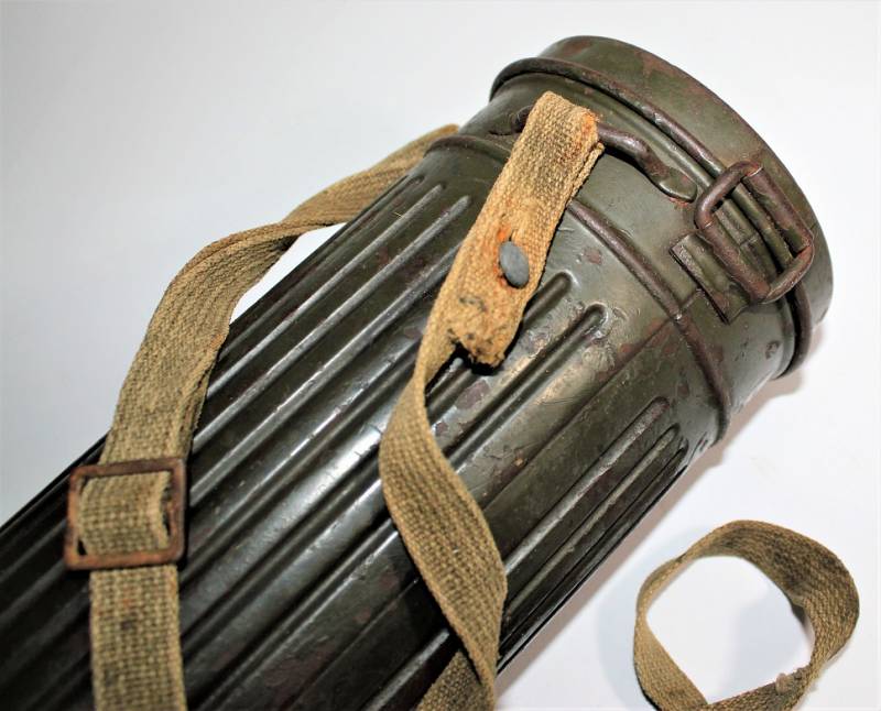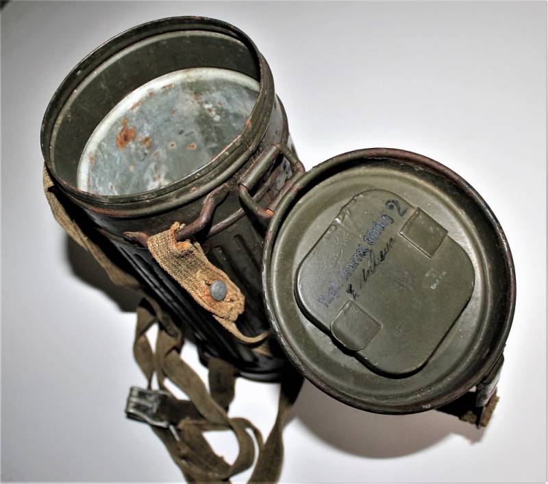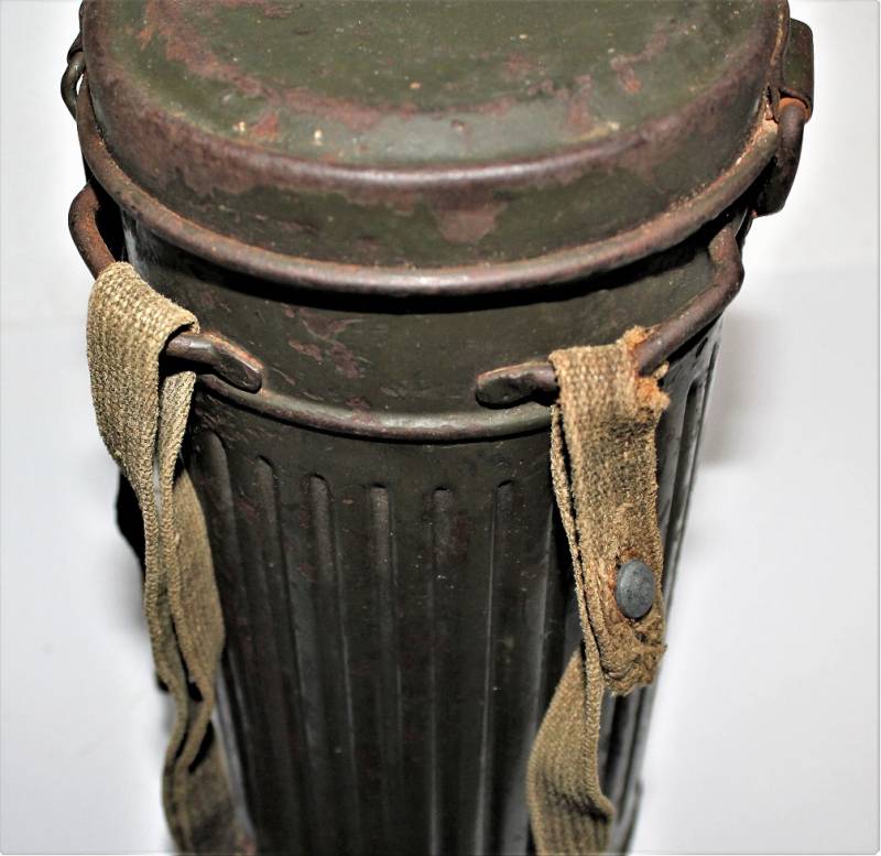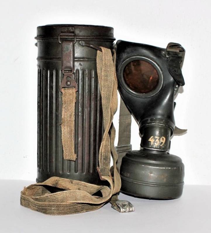 Maschera antigas nata in colorazione verde feldgrau al 70% in buone condizioni, alcune tracce di ruggine superficiali, con patina del temo e dellŽuso, non restaurata o riparata, completa in tutte le sue parti, compreso cinghiaggio in canapa e lenti di ricambio. Marcata internamente con codice fabbricante, data 1943 e waffenamt, inoltre marcata con timbro Reggimento General Goring e firma del soldato.