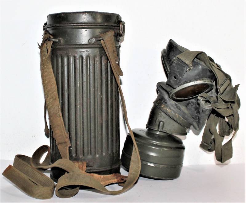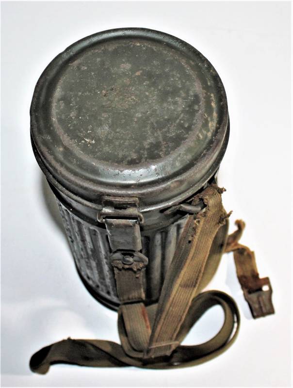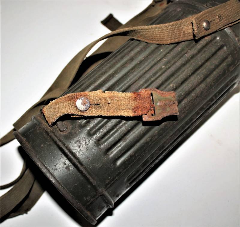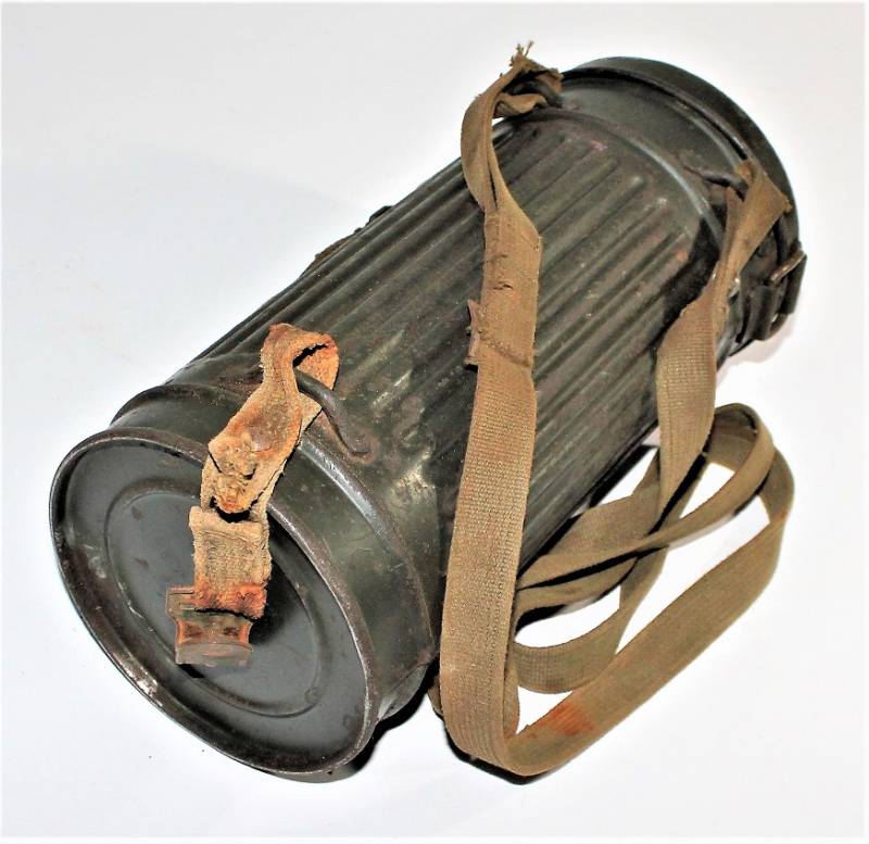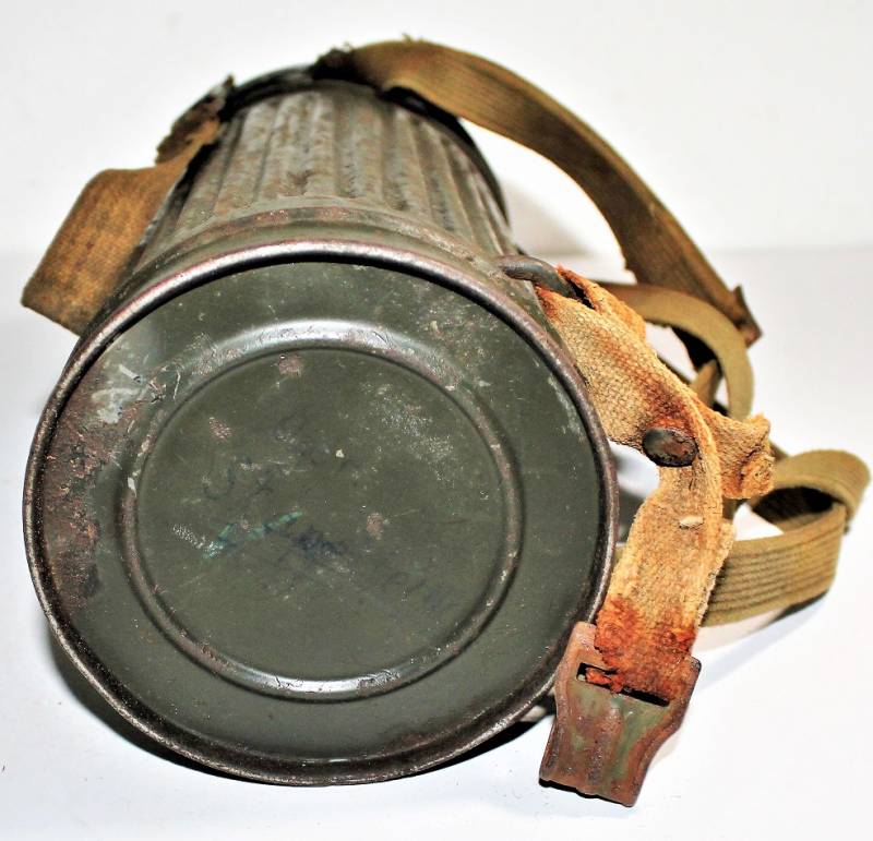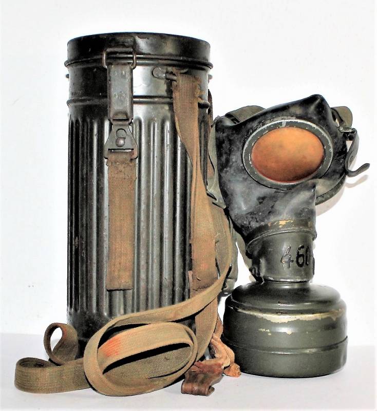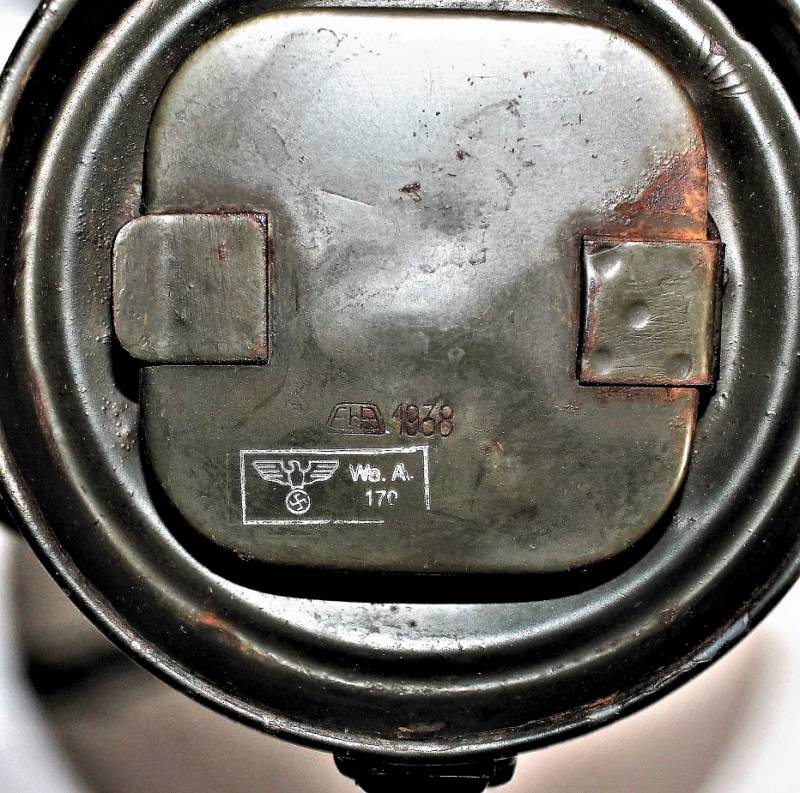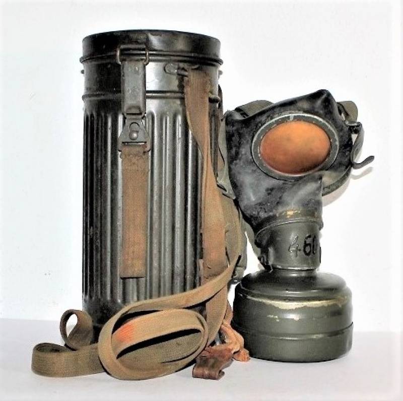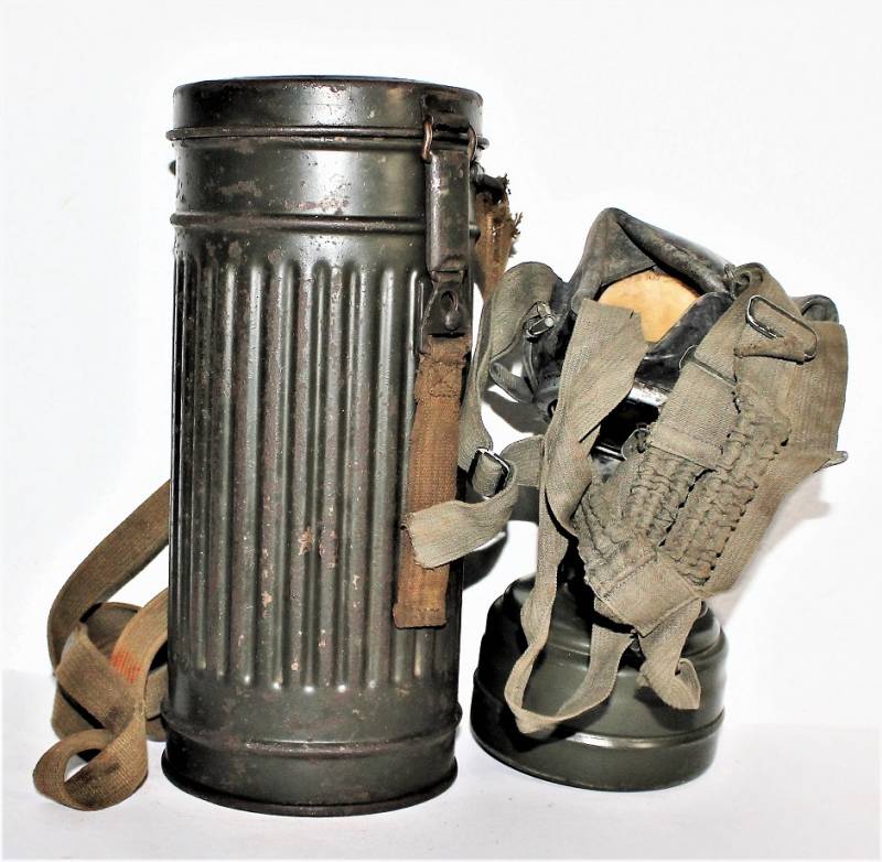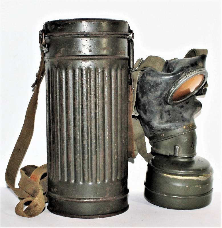 Maschera antigas nata in colorazione verde feldgrau al 70% in buone condizioni, alcune tracce di ruggine superficiali, con patina del temo e dellŽuso, non restaurata o riparata, completa in tutte le sue parti, compreso cinghiaggio in canapa, mancante delle lenti di ricambio. Marcata internamente con codice fabbricante, data 1938 e waffenamt.