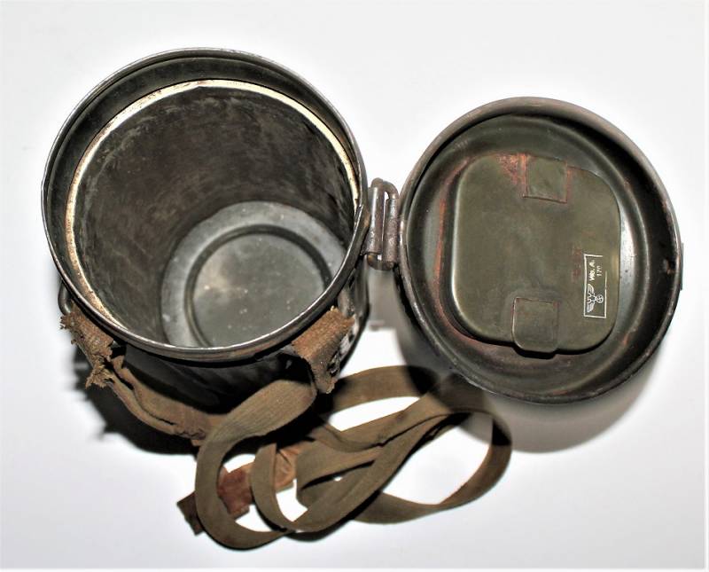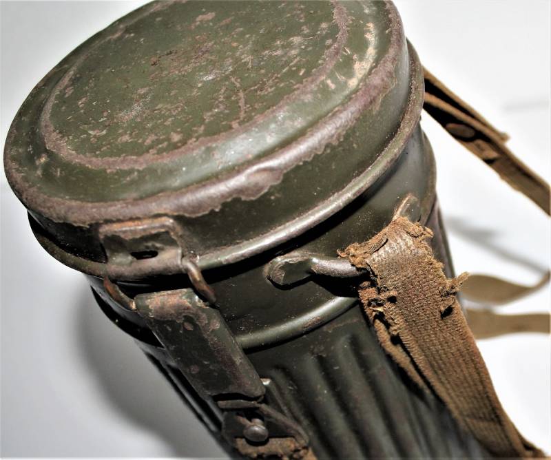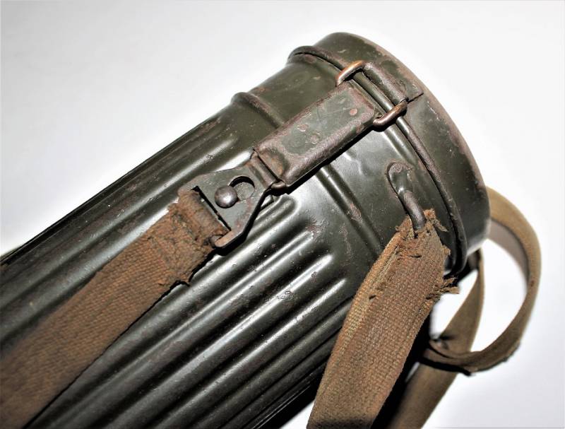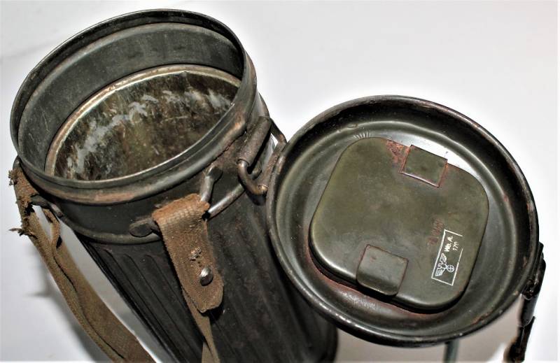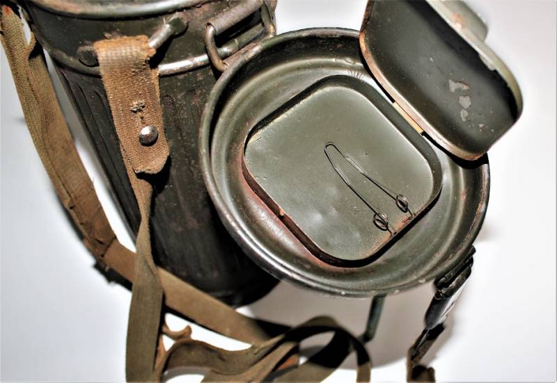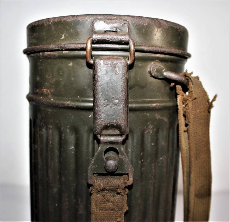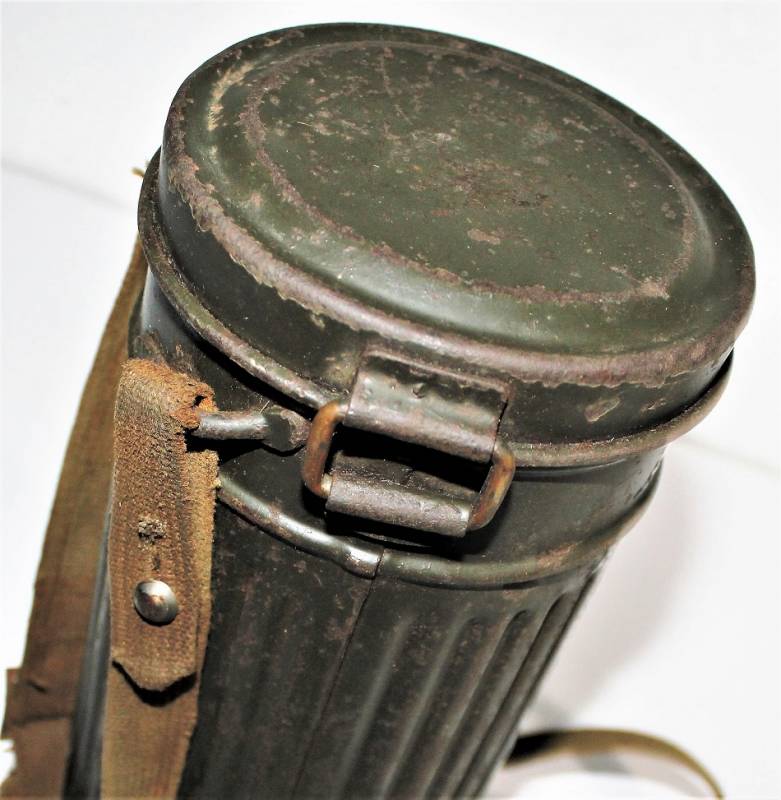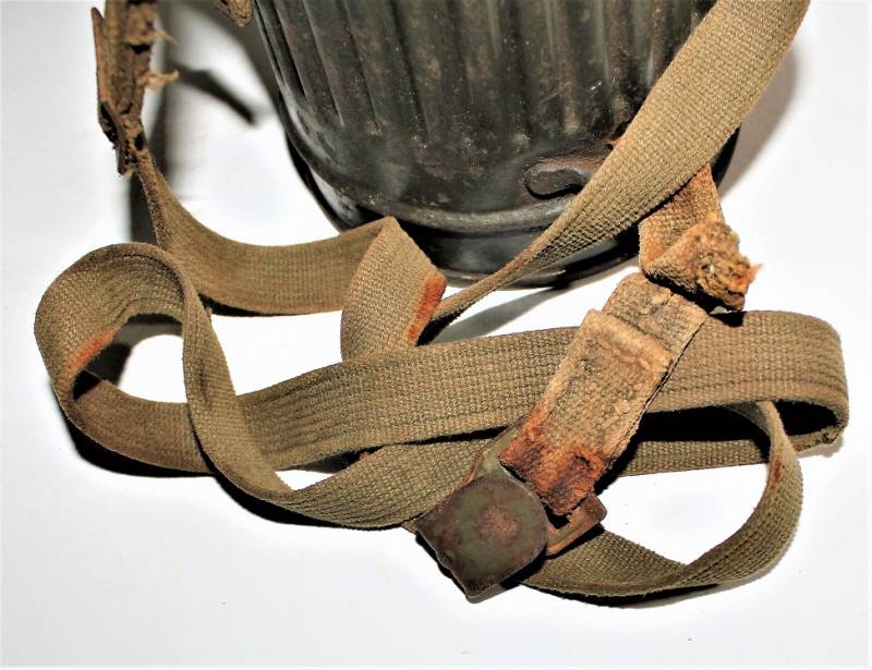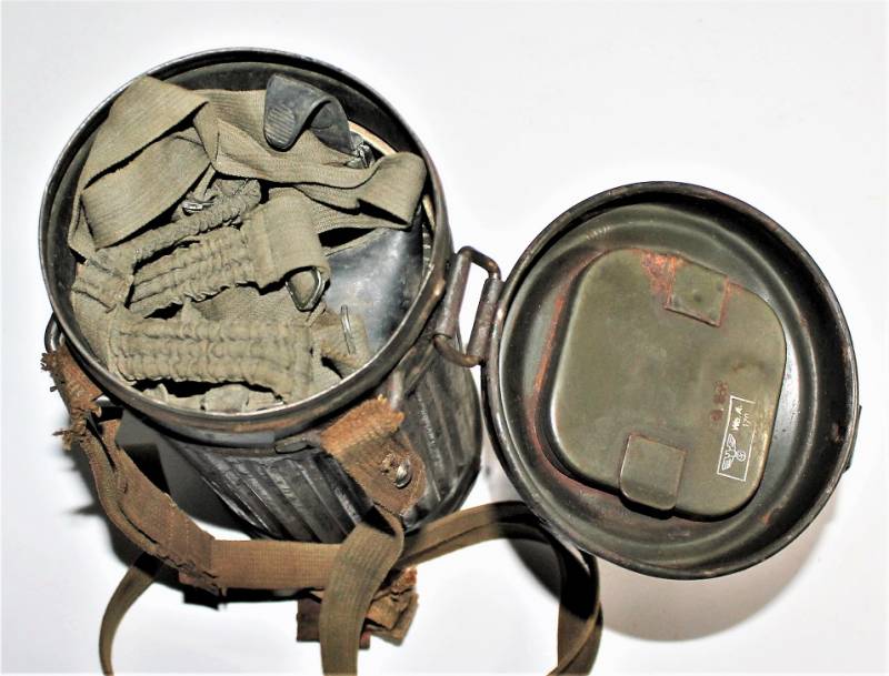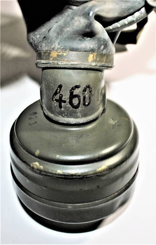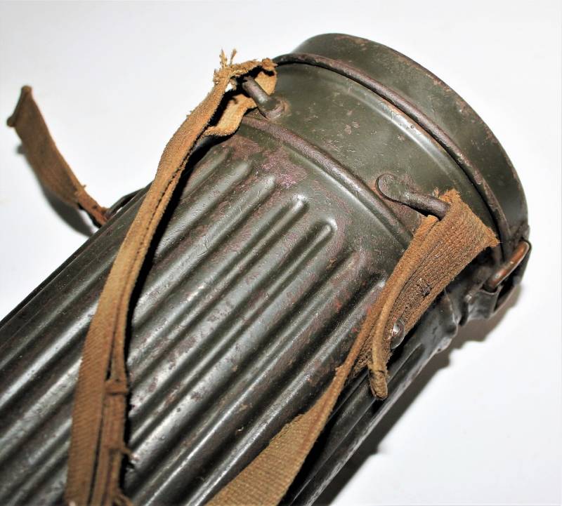 Maschera antigas nata in colorazione verde feldgrau al 70% in buone condizioni, alcune tracce di ruggine superficiali, con patina del temo e dellŽuso, non restaurata o riparata, completa in tutte le sue parti, compreso cinghiaggio in canapa, mancante delle lenti di ricambio. Marcata internamente con codice fabbricante, data 1938 e waffenamt.