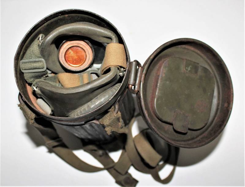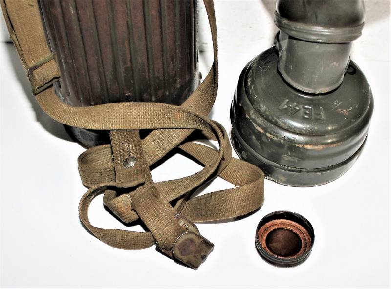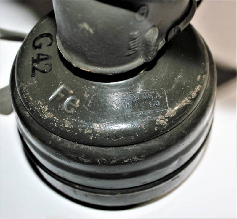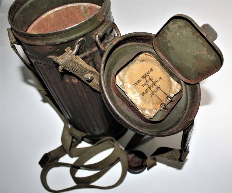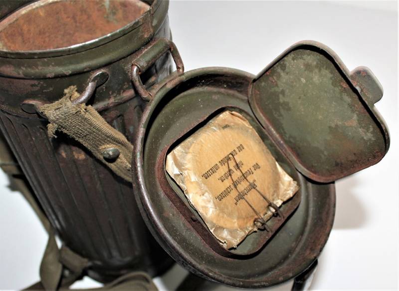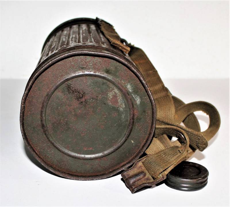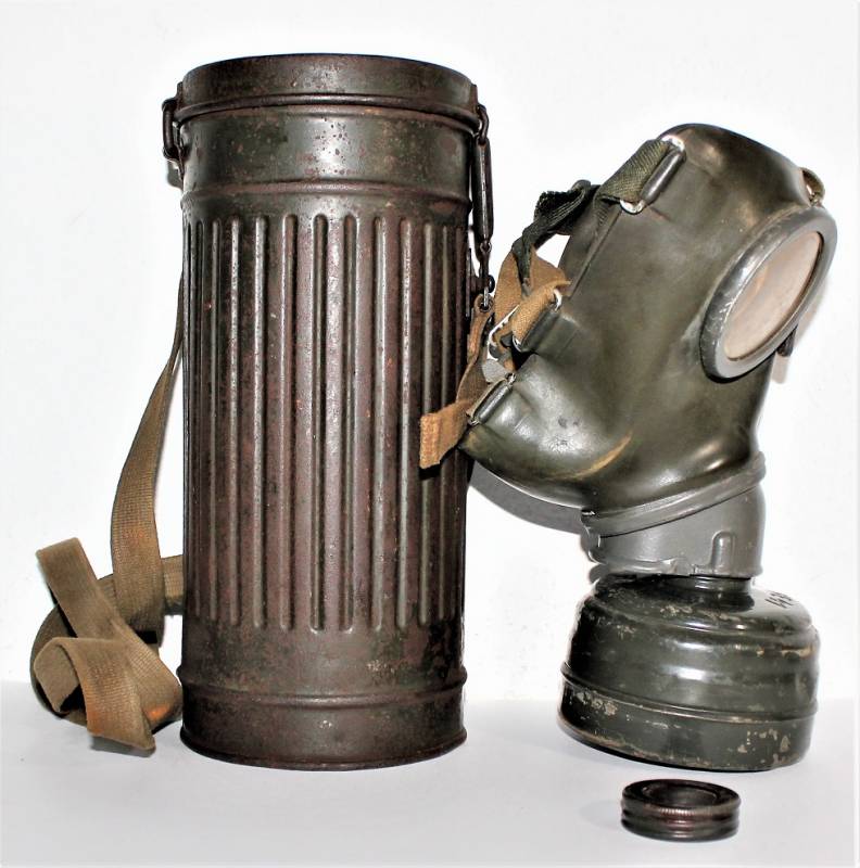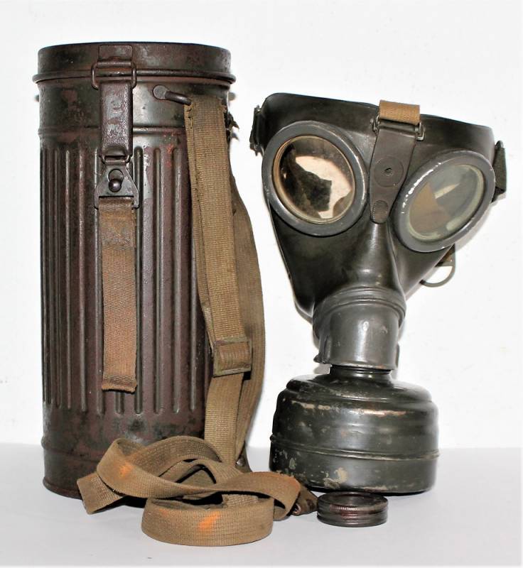 Maschera antigas nata in colorazione verde feldgrau al 50% in discrete condizioni, alcune tracce di ruggine superficiali, con patina del temo e dellŽuso, non restaurata o riparata, completa in tutte le sue parti, compreso cinghiaggio in canapa e lenti di ricambio.