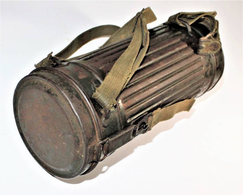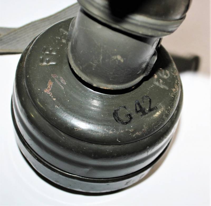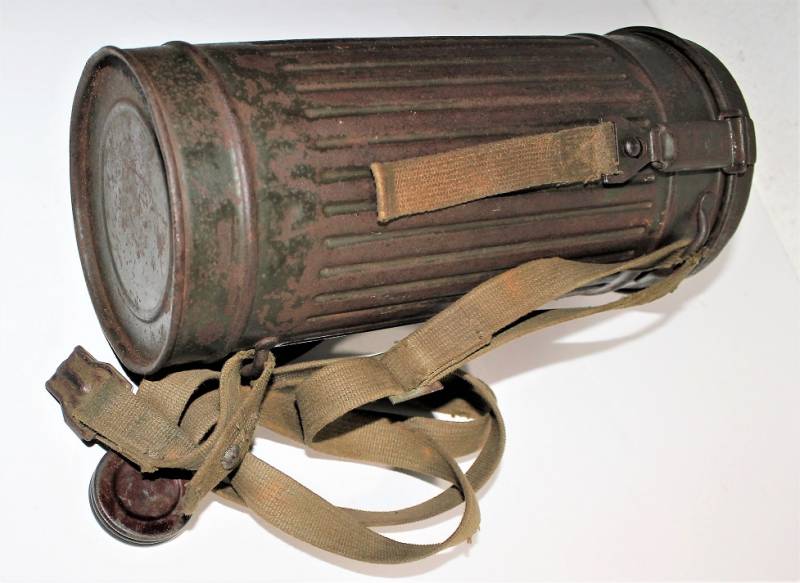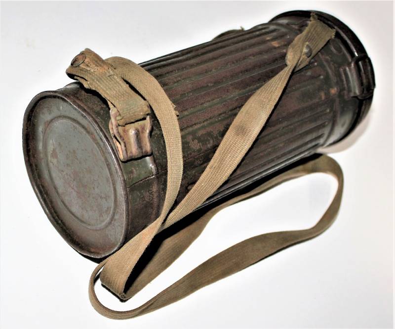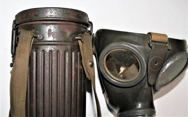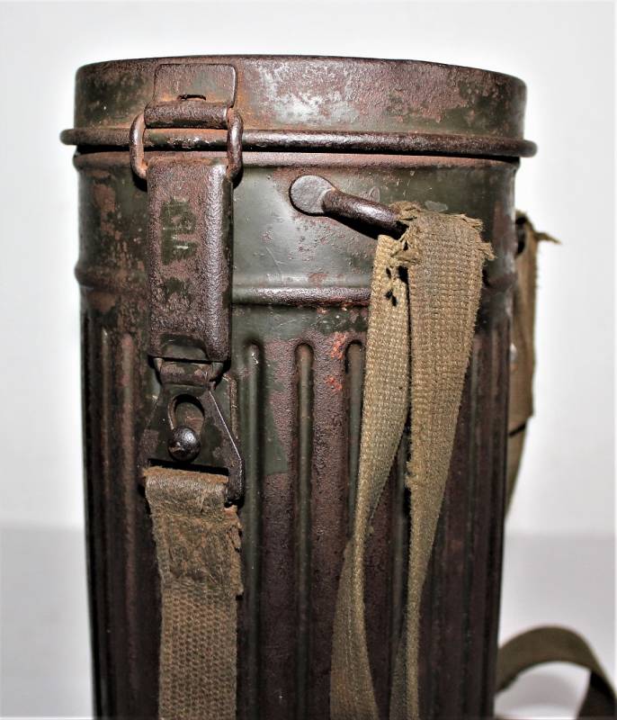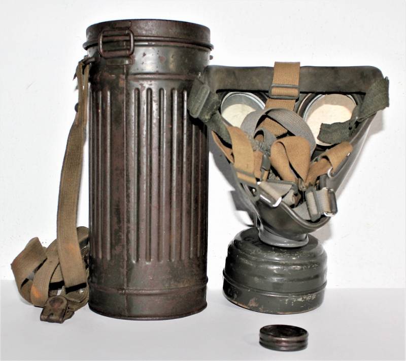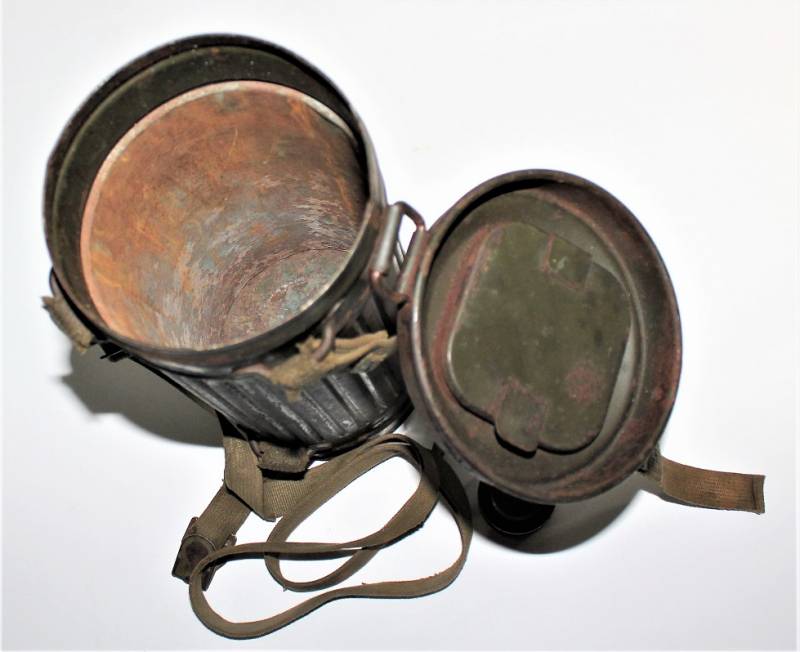 Maschera antigas nata in colorazione verde feldgrau al 50% in discrete condizioni, alcune tracce di ruggine superficiali, con patina del temo e dellŽuso, non restaurata o riparata, completa in tutte le sue parti, compreso cinghiaggio in canapa e lenti di ricambio.