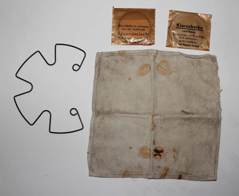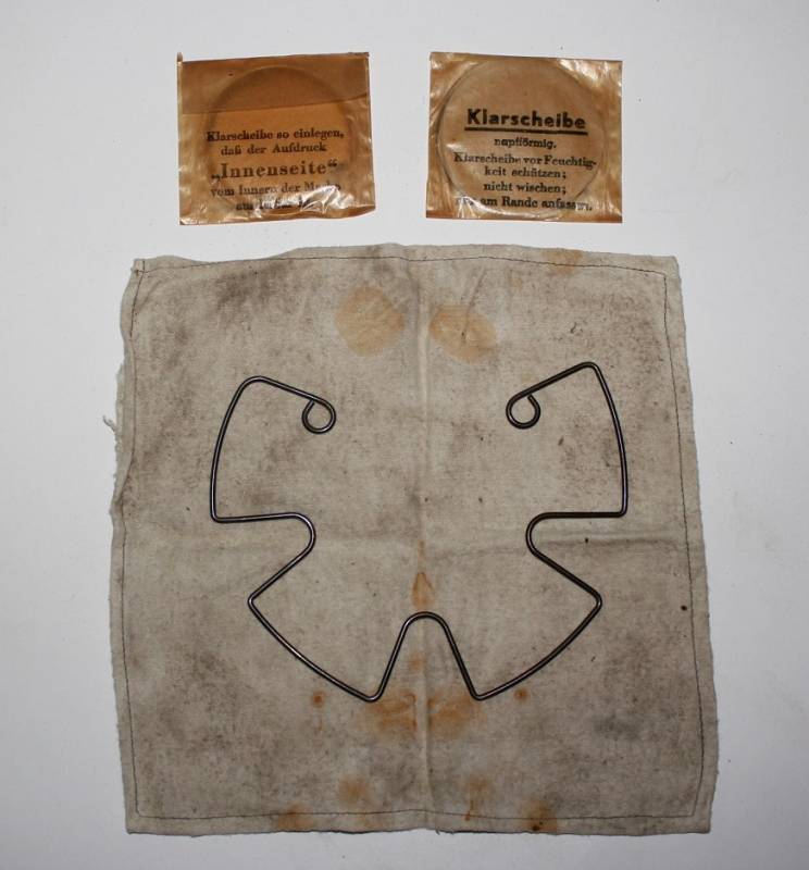 Kit di pulizia per maschera anti gas, molla, straccio e lenti di ricambio, usato ma in buone condizioni. Originale 100% WWII periodo.