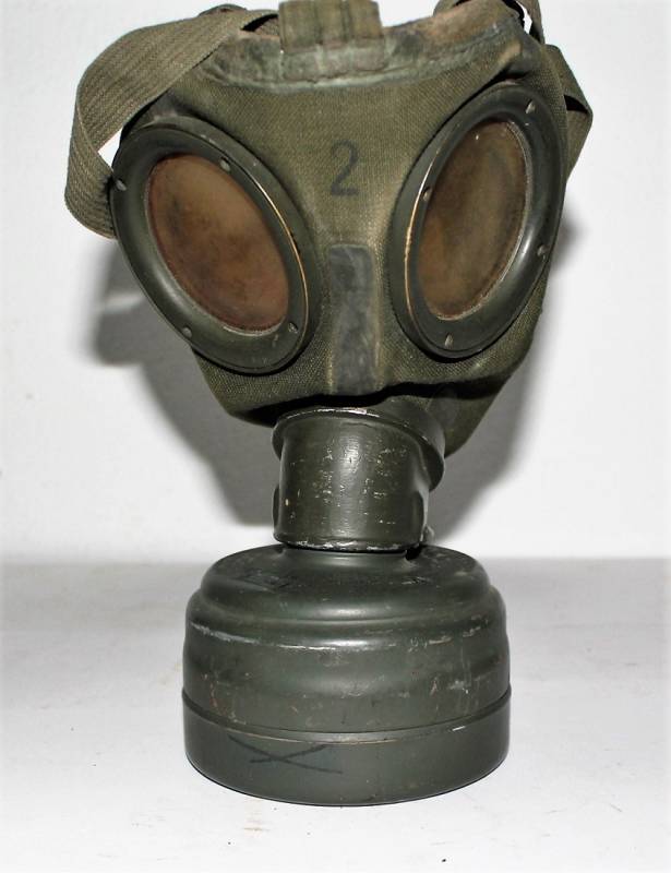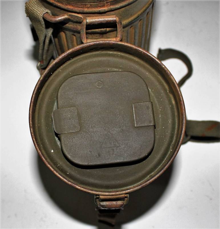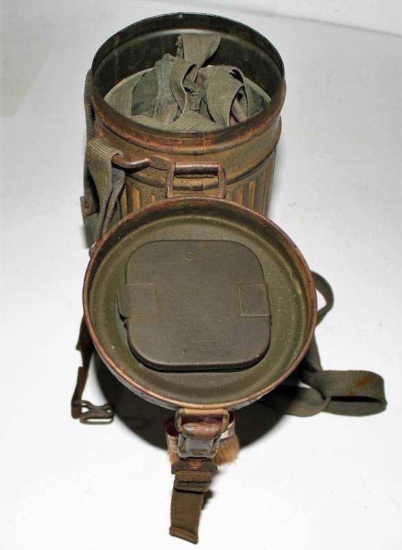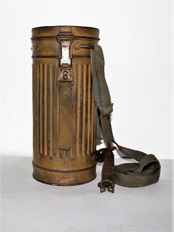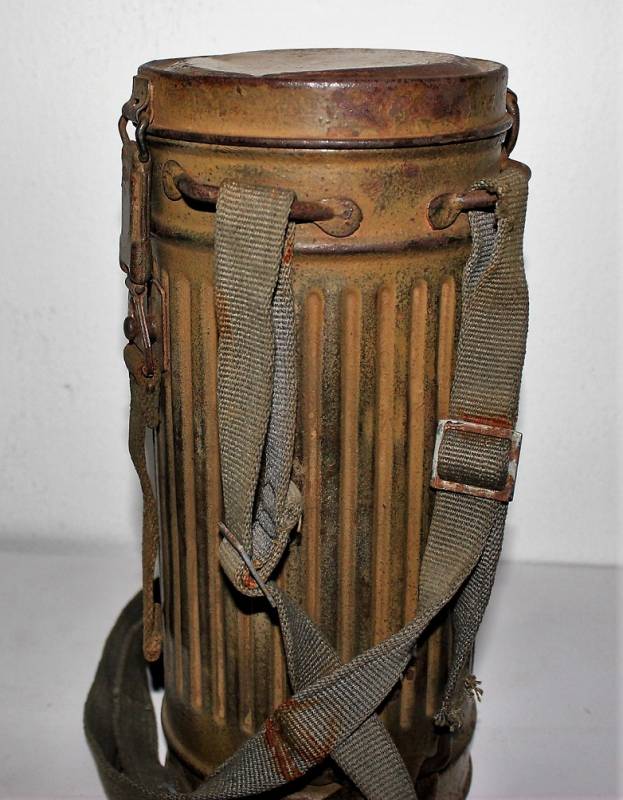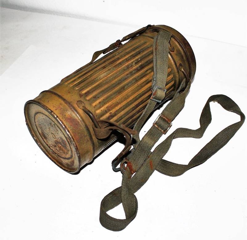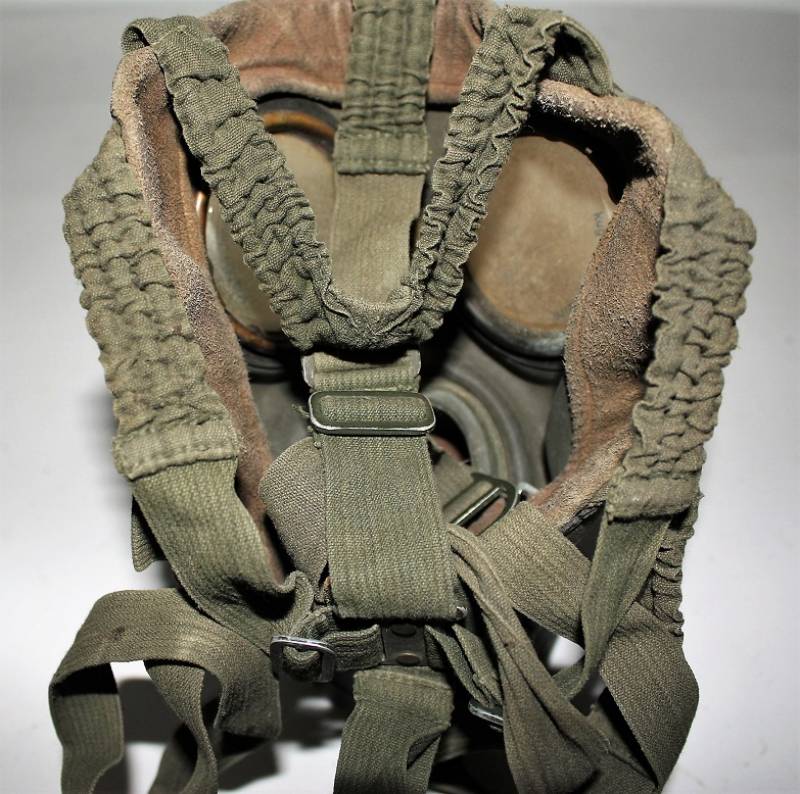 Maschera antigas completa in tutte le sue parti, compreso il cinghiaggio in tela e lenti di ricambio, in colorazione giallo tropicale DAK continentale allŽ80%, con patina del tempo e dellŽuso, marcata con fabbricante e data. Originale 100% WWII periodo.