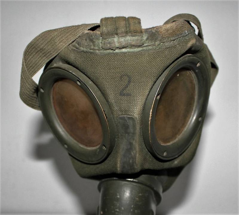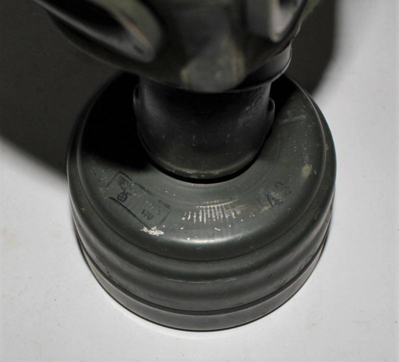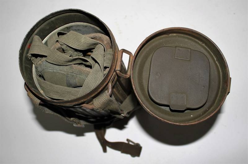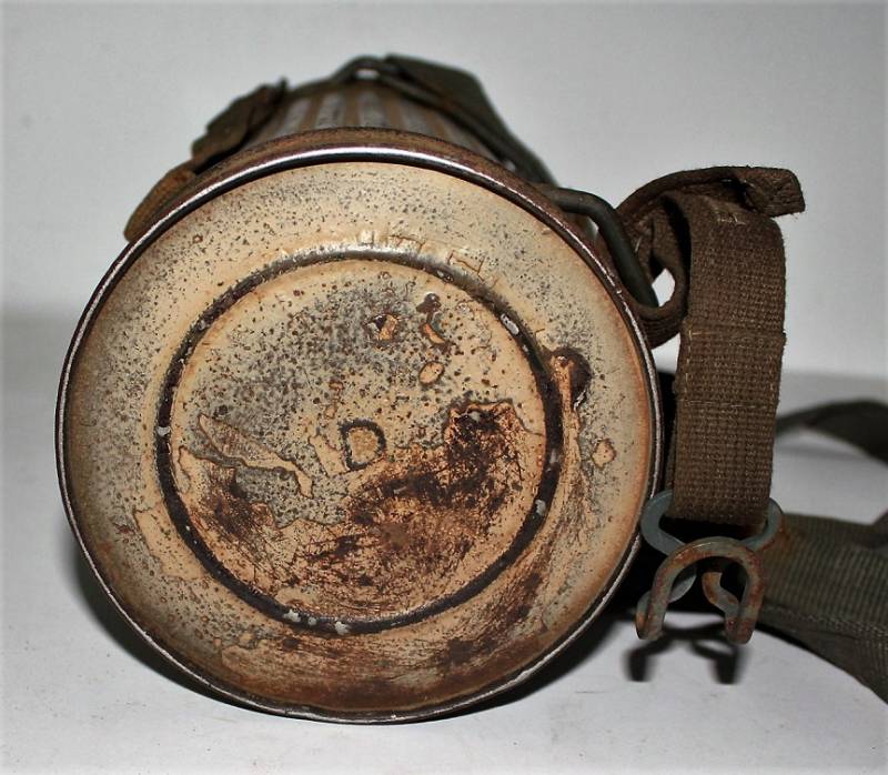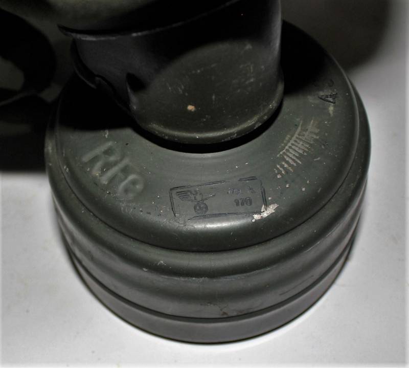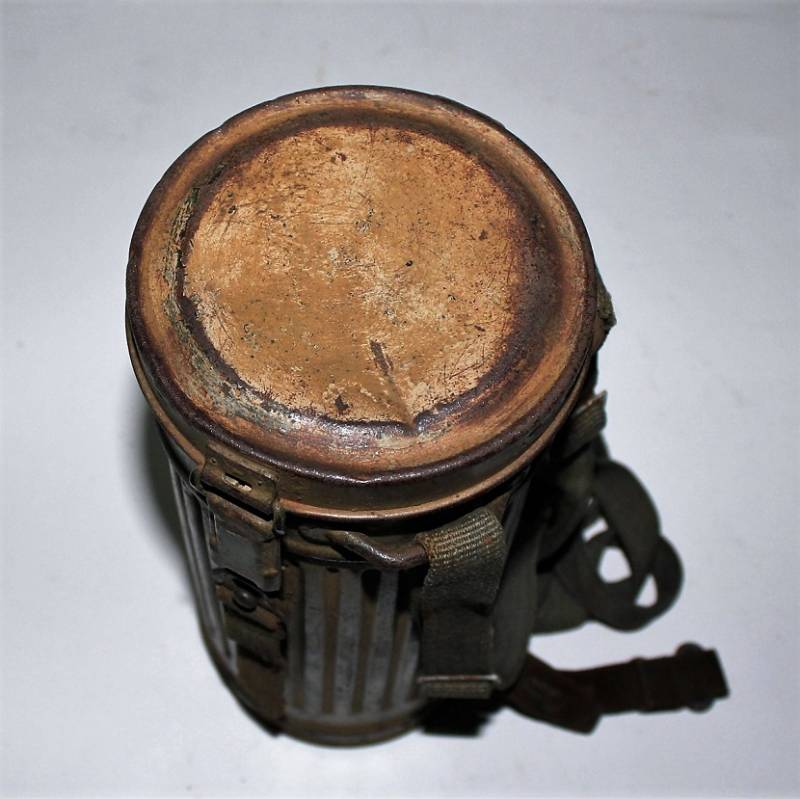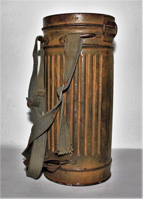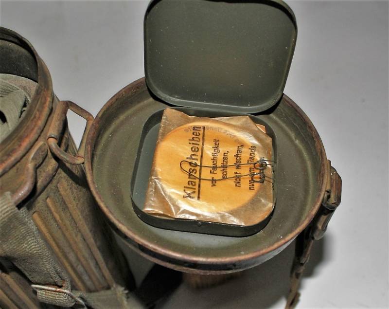 Maschera antigas completa in tutte le sue parti, compreso il cinghiaggio in tela e lenti di ricambio, in colorazione giallo tropicale DAK continentale allŽ80%, con patina del tempo e dellŽuso, marcata con fabbricante e data. Originale 100% WWII periodo.
