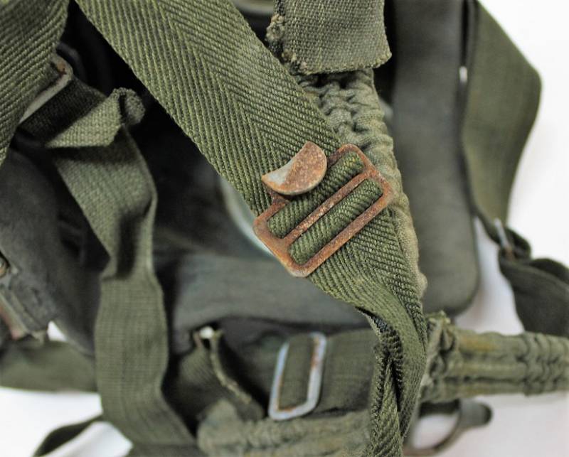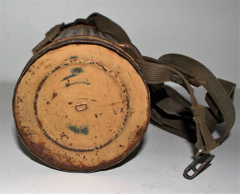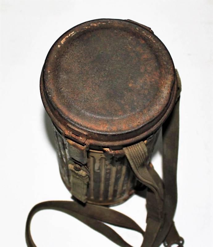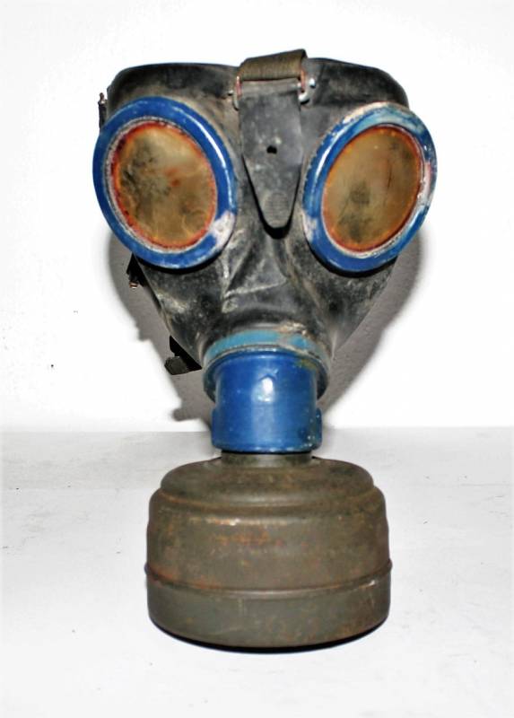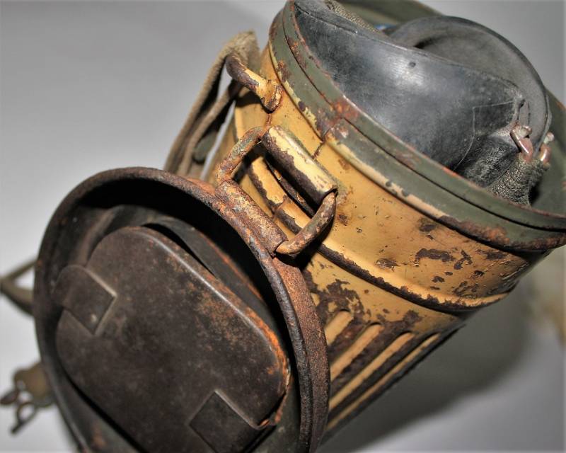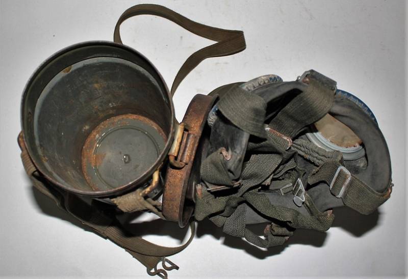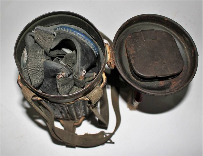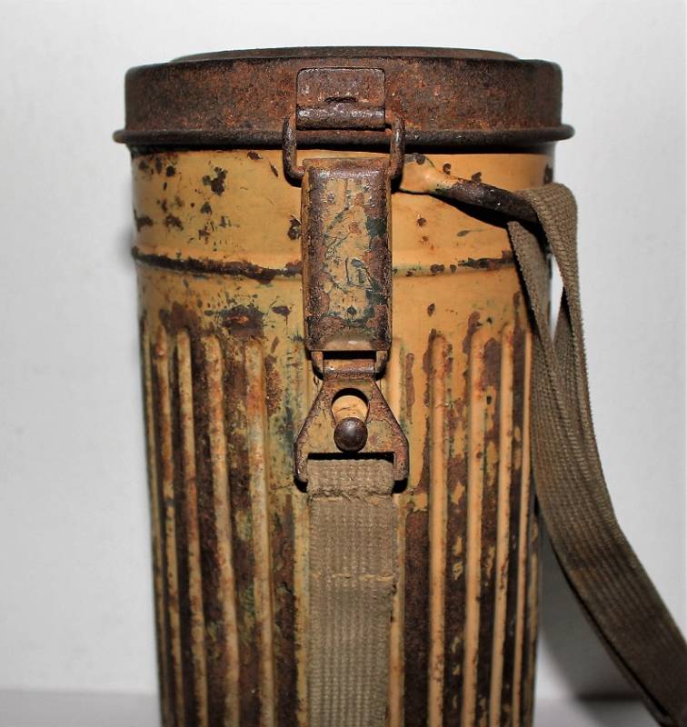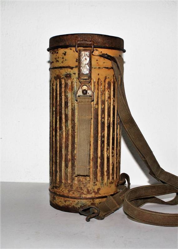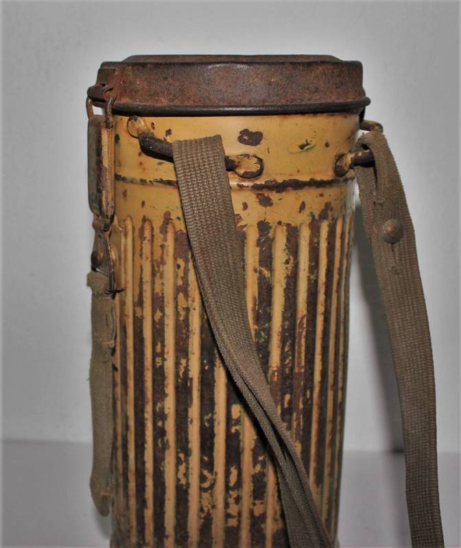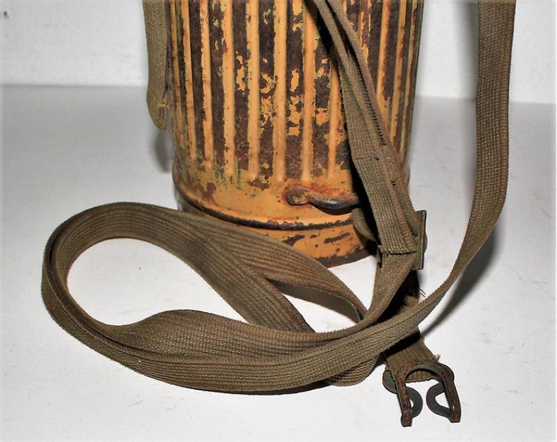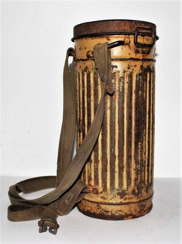 Maschera antigas completa in tutte le sue parti, compreso il cinghiaggio in tela, lenti di ricambio mancanti, in colorazione giallo tropicale DAK continentale al 70%, con patina del tempo e dellŽuso, marcata con fabbricante e data. Originale 100% WWII periodo.
