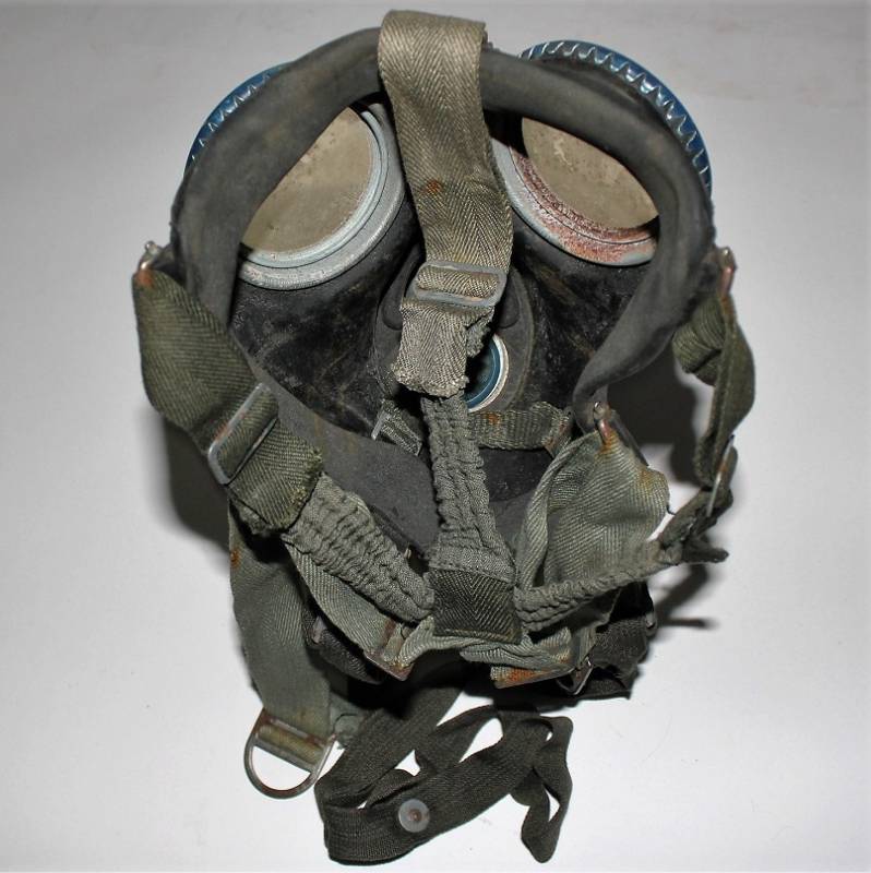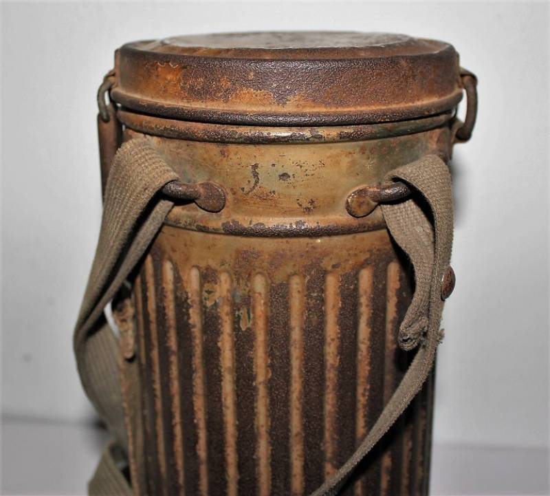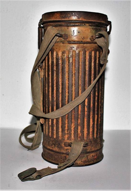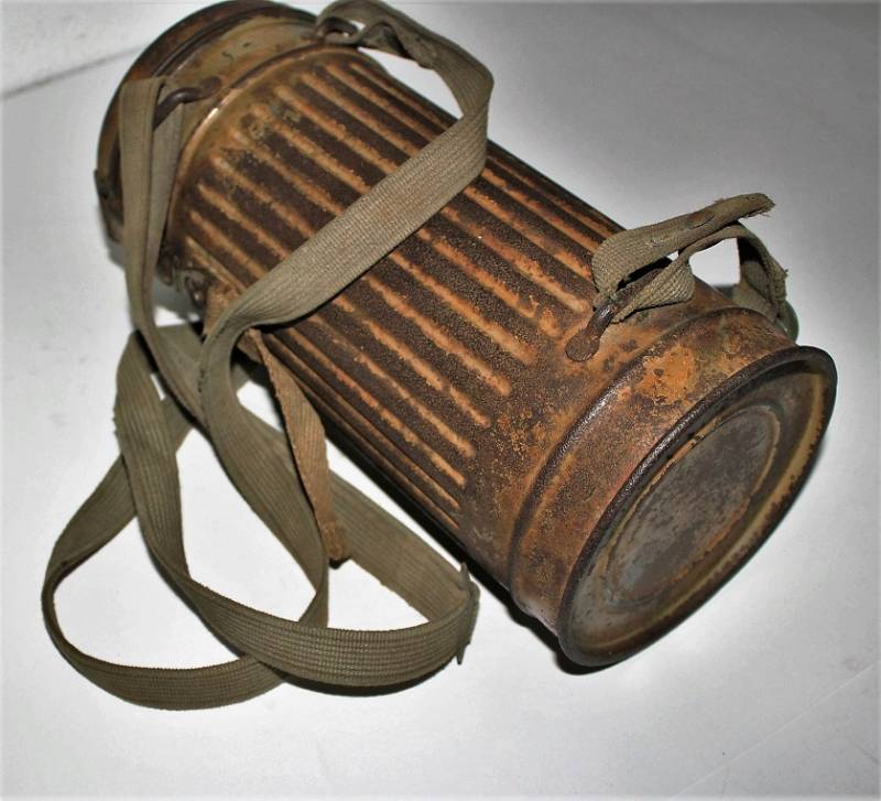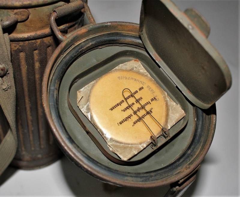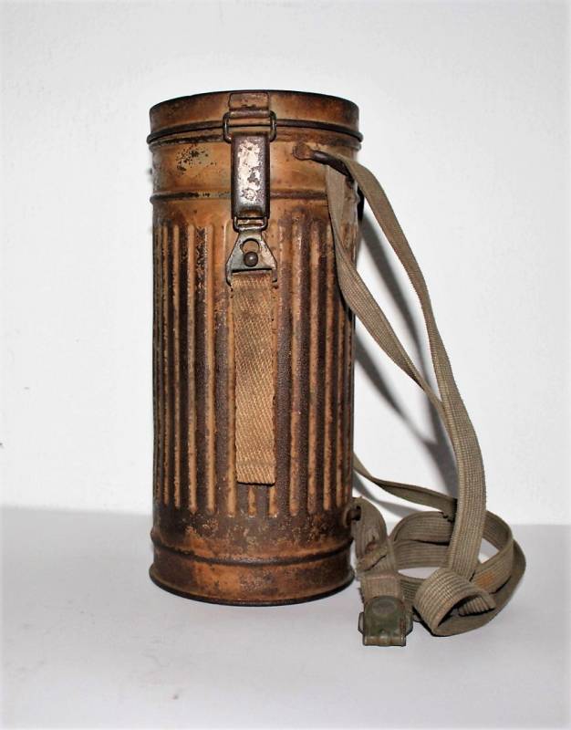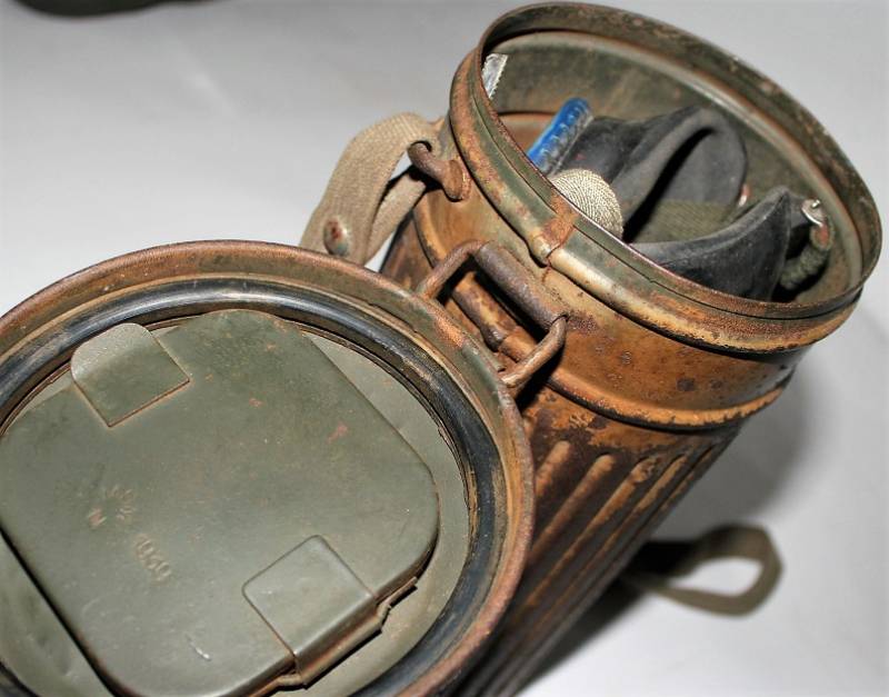 Maschera antigas completa in tutte le sue parti, compreso il cinghiaggio in tela, con lenti di ricambio, in colorazione giallo tropicale DAK continentale al 60%, con patina del tempo e dellŽuso, marcata con fabbricante e data 1939. Originale 100% WWII periodo.