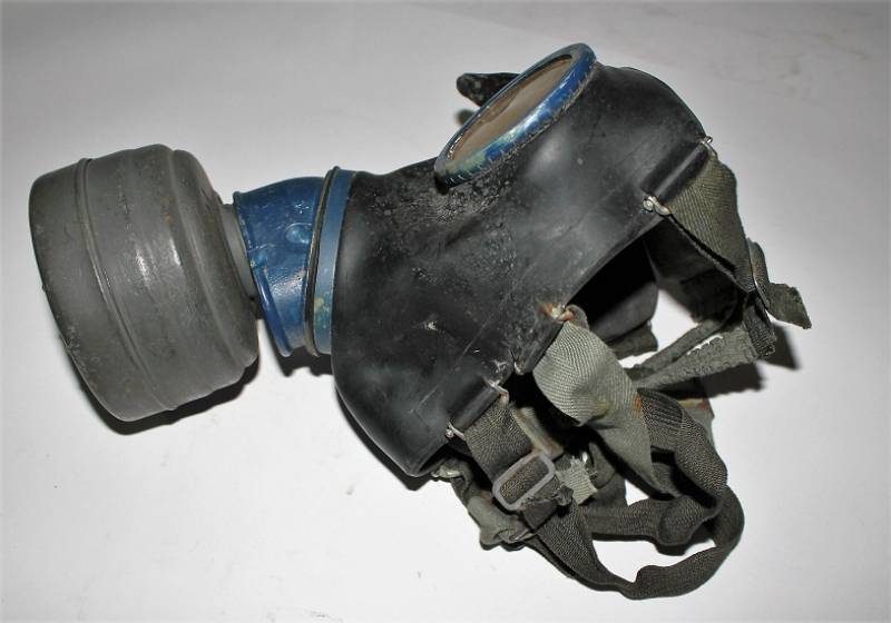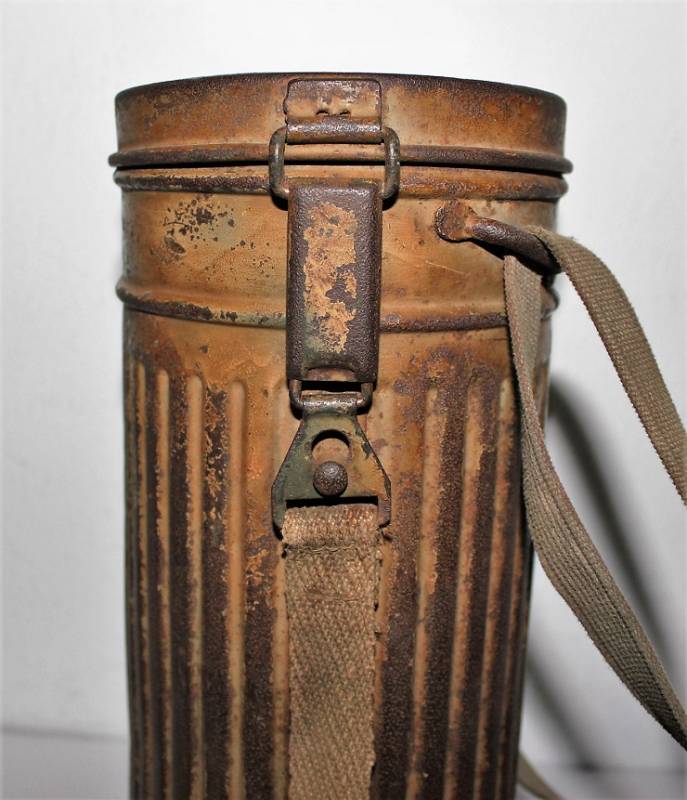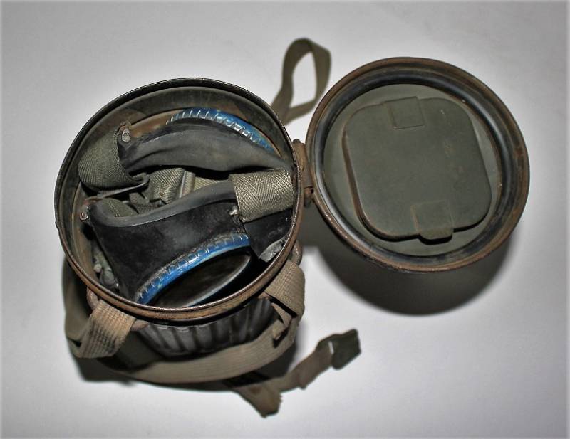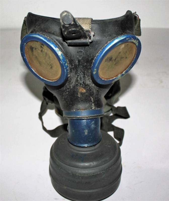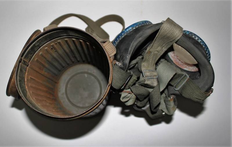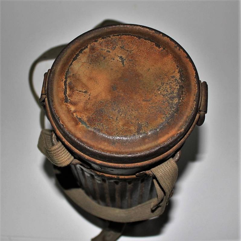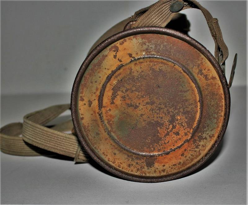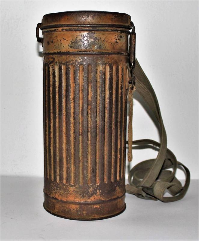 Maschera antigas completa in tutte le sue parti, compreso il cinghiaggio in tela, con lenti di ricambio, in colorazione giallo tropicale DAK continentale al 60%, con patina del tempo e dellŽuso, marcata con fabbricante e data 1939. Originale 100% WWII periodo.
