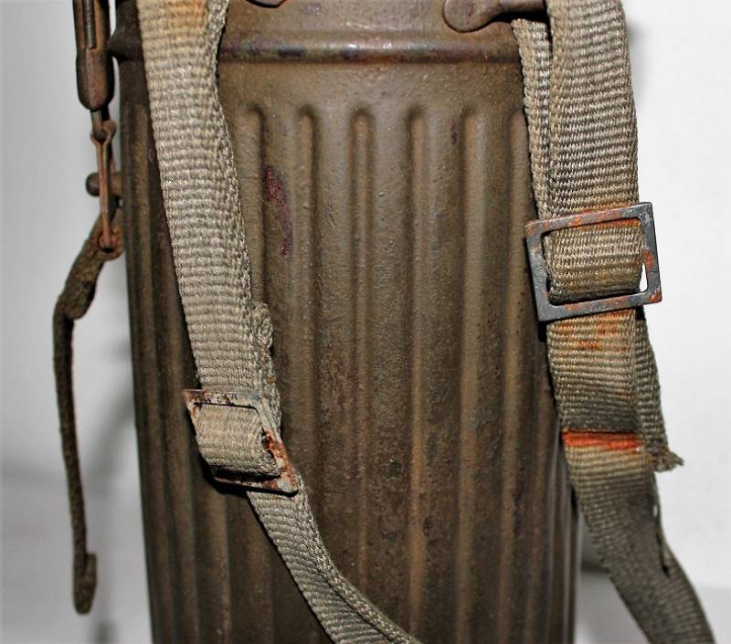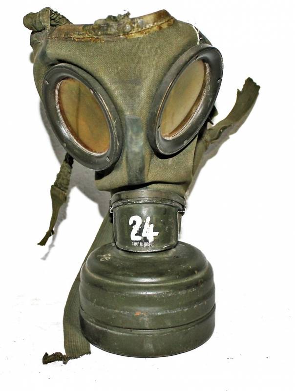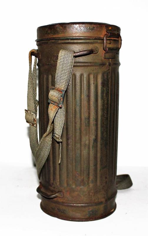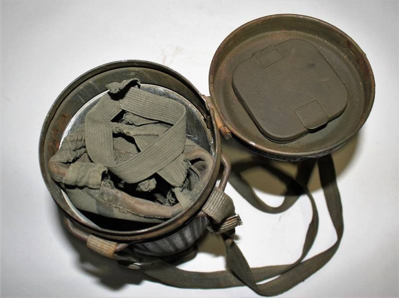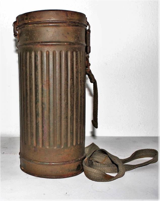 Maschera antigas completa in tutte le sue parti, compreso il cinghiaggio in tela, mancante della cinghia corta, con lenti di ricambio, in colorazione giallo tropicale DAK continentale al 60%, ma il colore è molto sbiadito, quasi verde, si vedono tracce del giallo originario, con patina del tempo e dellŽuso. Originale 100% WWII periodo.