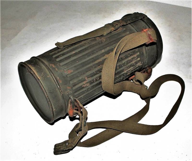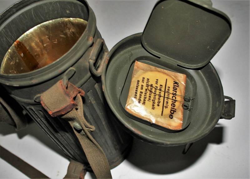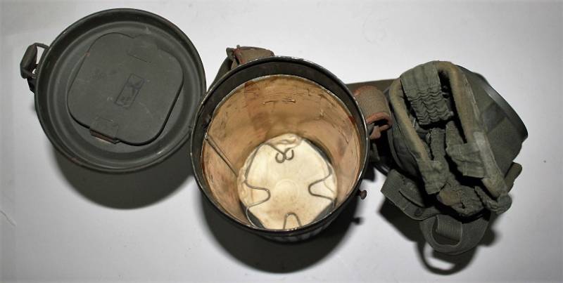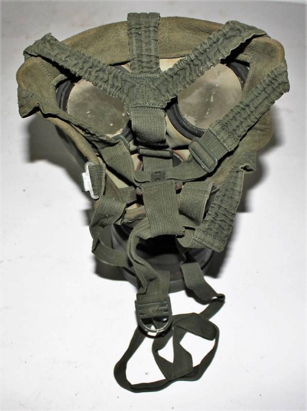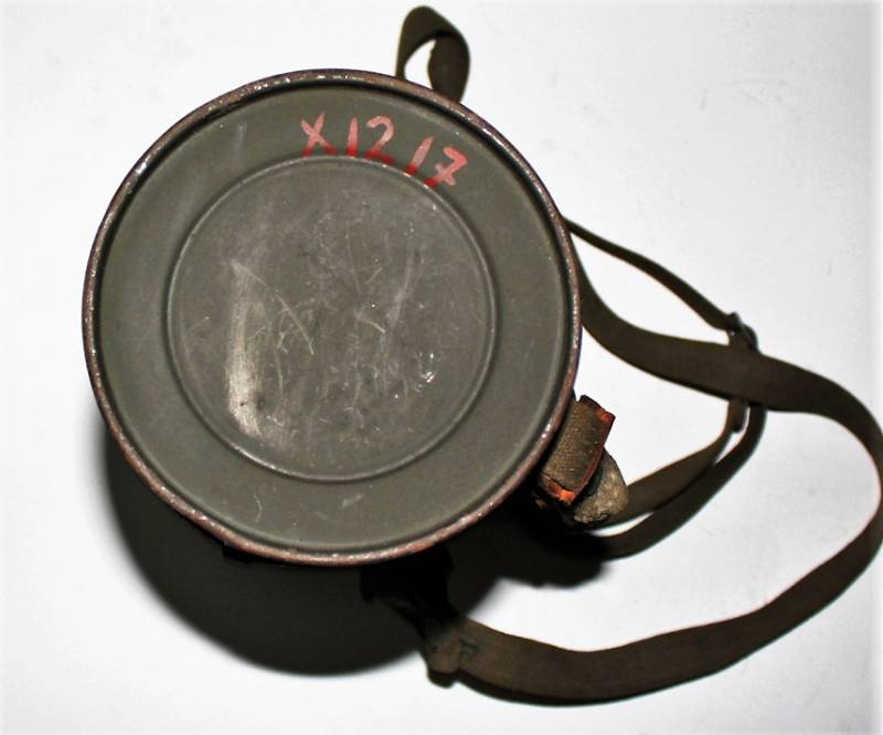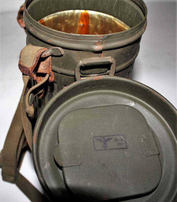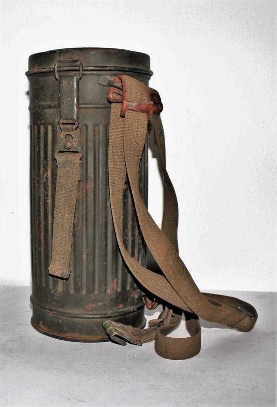 Maschera antigas nata in colorazione verde scuro allŽ80%, in ottime condizioni, con leggeri segni del tempo e dellŽuso, completa in tutte le sue parti, compreso cinghiaggio in canapa di 1°tipo, con rinforzi in pelle, lenti di ricambio, molla e straccio. Marcata internamente con la sigla del fabbricante e waffenamte molto ben leggibile, sul fondo del contenitore numero di matricola del soldato scritto a vernice, come sulla maschera. Originale 100% WWII periodo.
