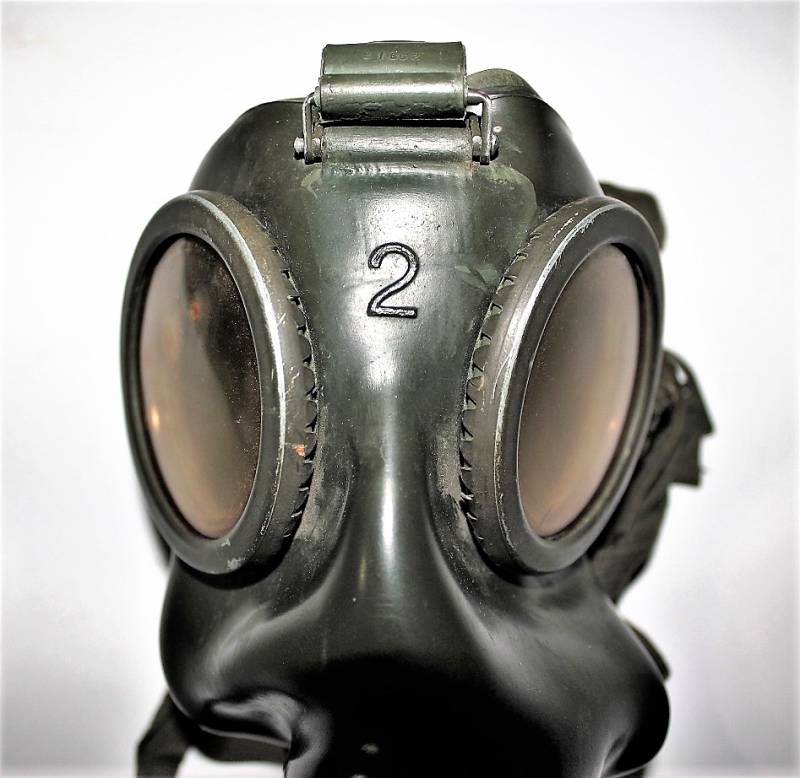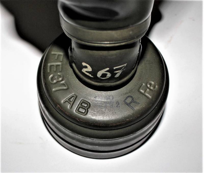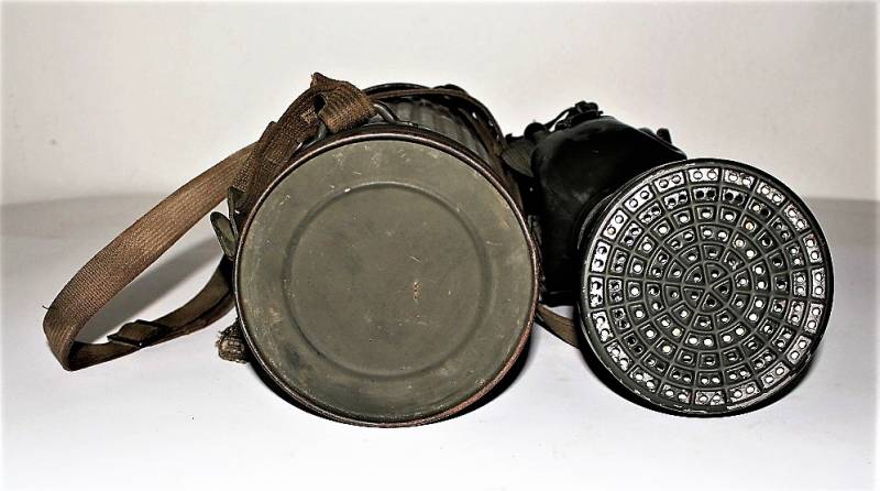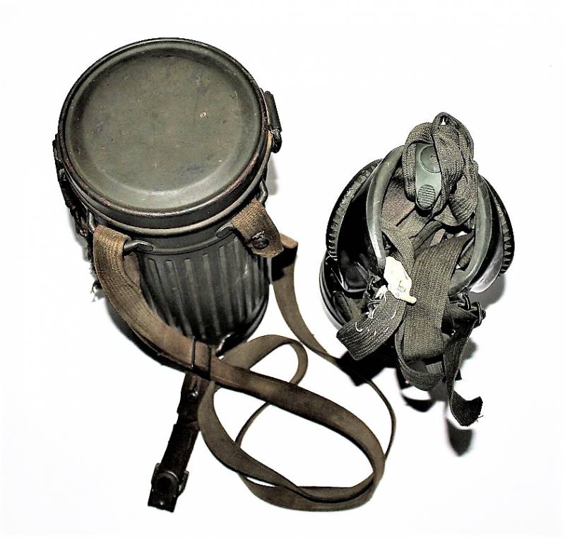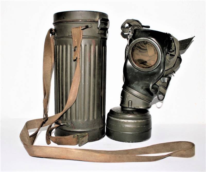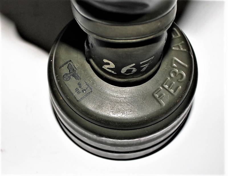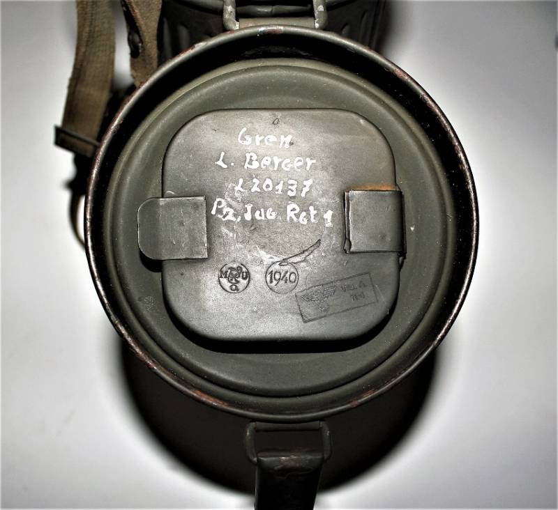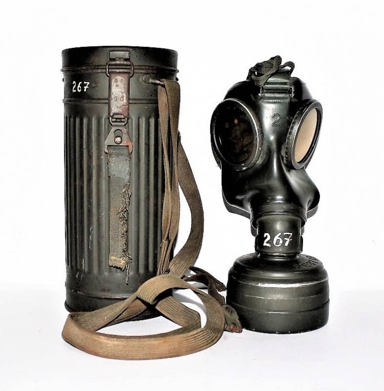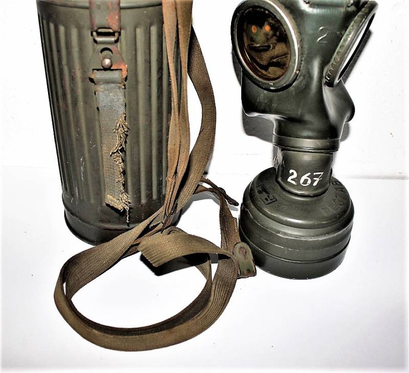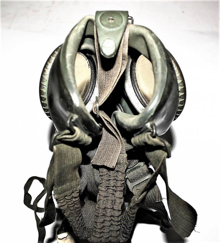 Maschera anti-gas in colorazione verde al 90%, ottime condizioni, completa in ogni sua parte compreso il cinghiaggio e lenti di ricambio, non restaurata o riparata, nome e reparto del soldato scritto a vernice allŽinterno, maschera e contenitore stesso numero (267). Originale 100% WWII periodo.