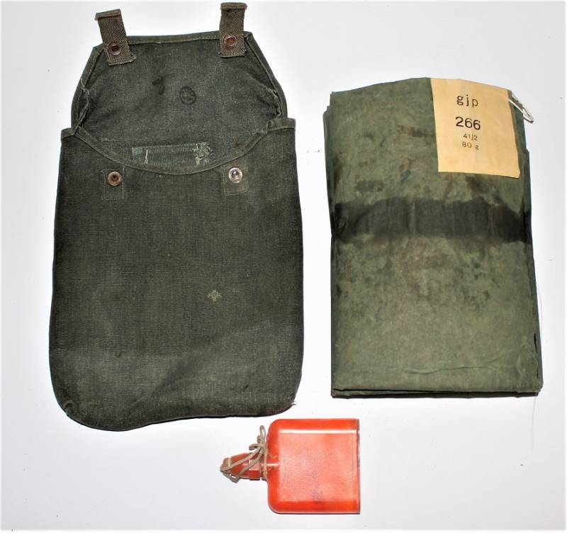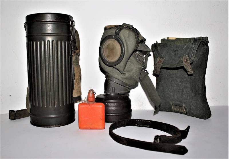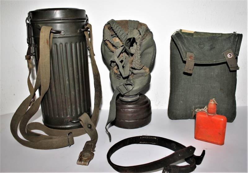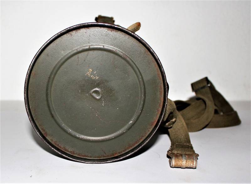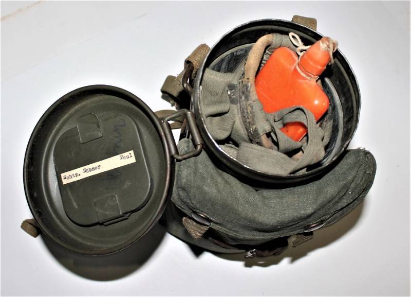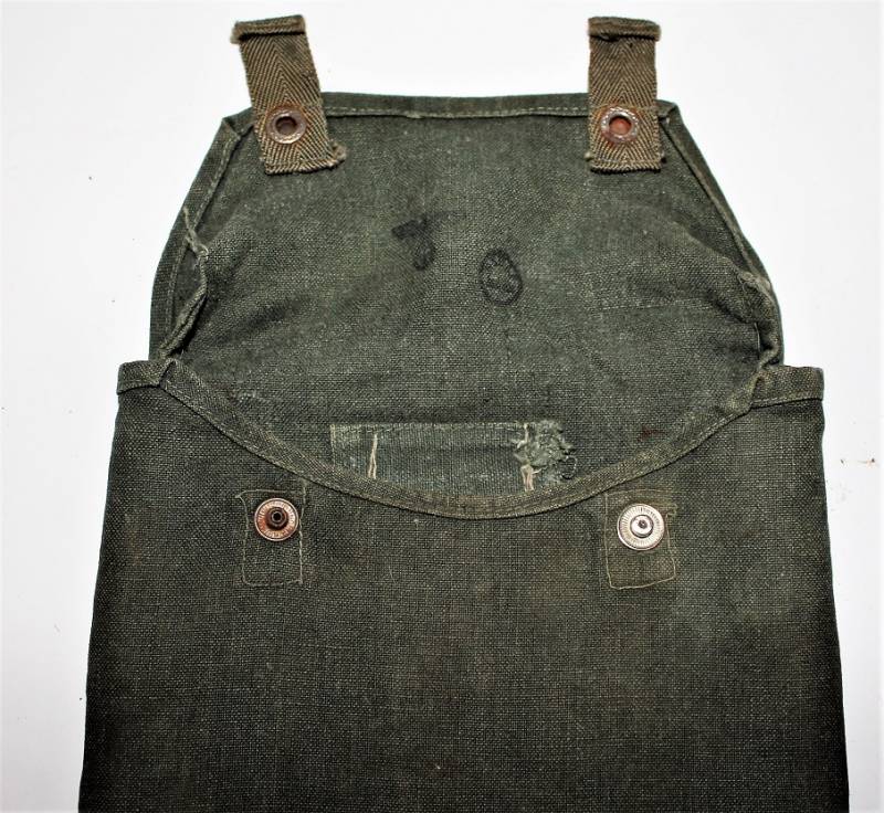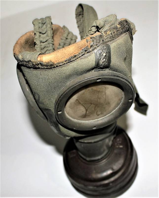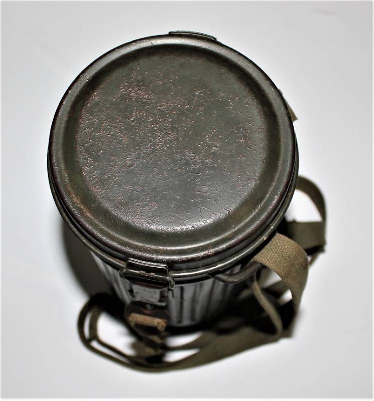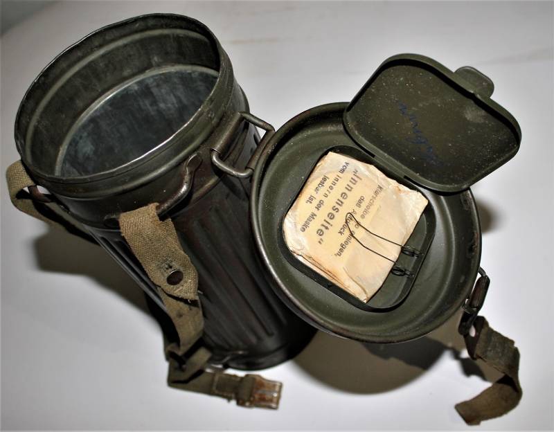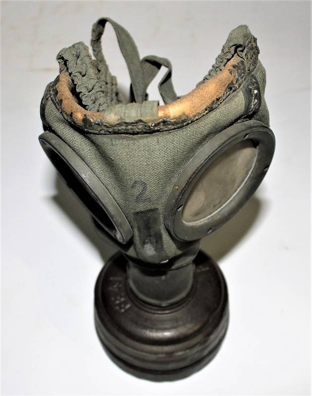 Maschera antigas in colorazione verde al 90% completa in tutte le sue parti, compreso il contenitore in tela con telo antipirite, il tutto con leggera patina del tempo e dellŽuso, non restaurata o riparata, internamente è presente il cartellino con il nome del soldato. Originale 100% WWII periodo.