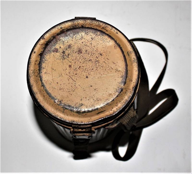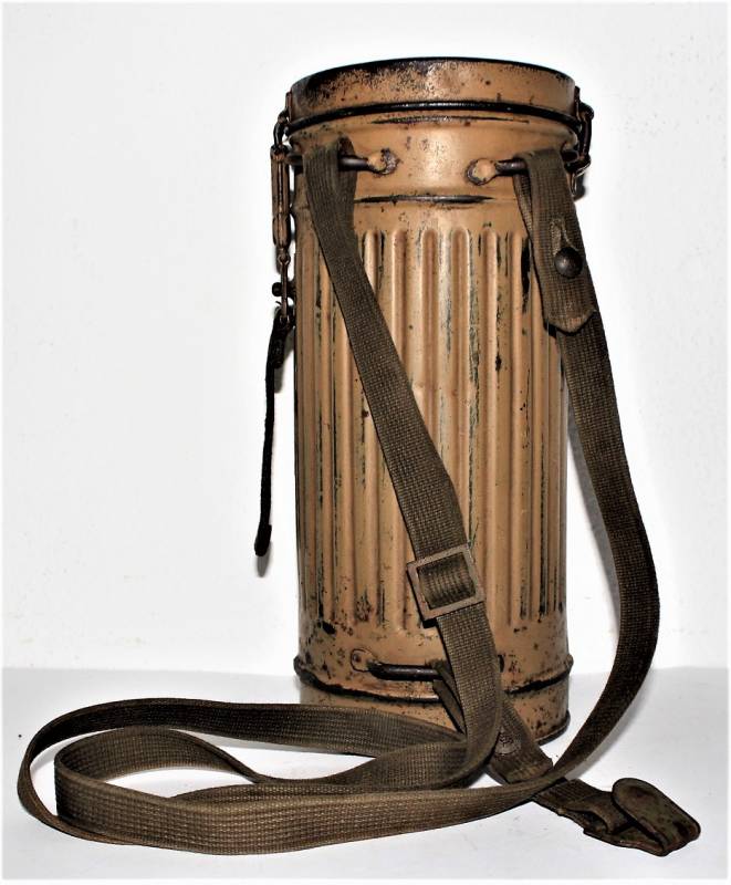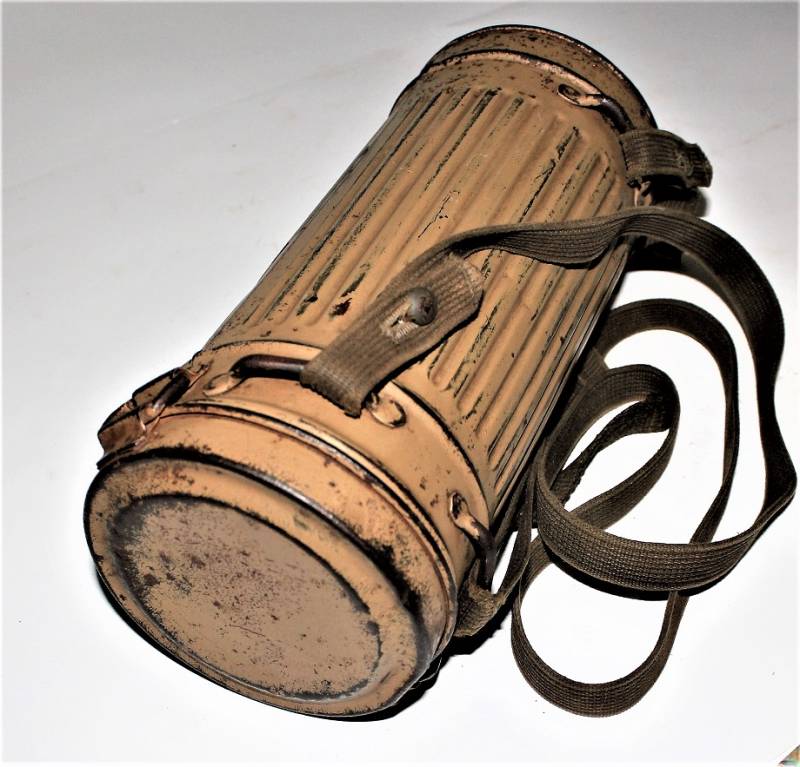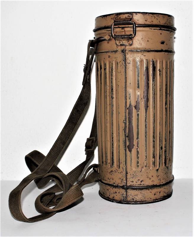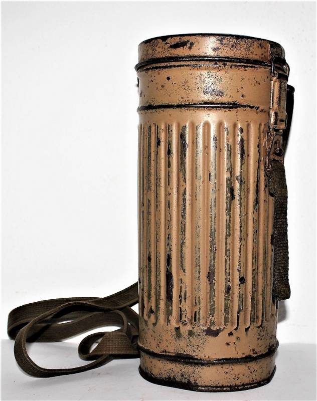 Contenitore maschera antigas completo del suo cinghiaggio in colorazione giallo tropicale D.A.K. continentale allŽ80% circa, con patina del tempo e dellŽuso, non restaurato o riparato, si intravede internamente la marcatura del fabbricante. Originale 100% WWII periodo.