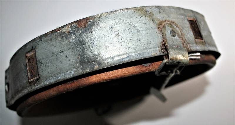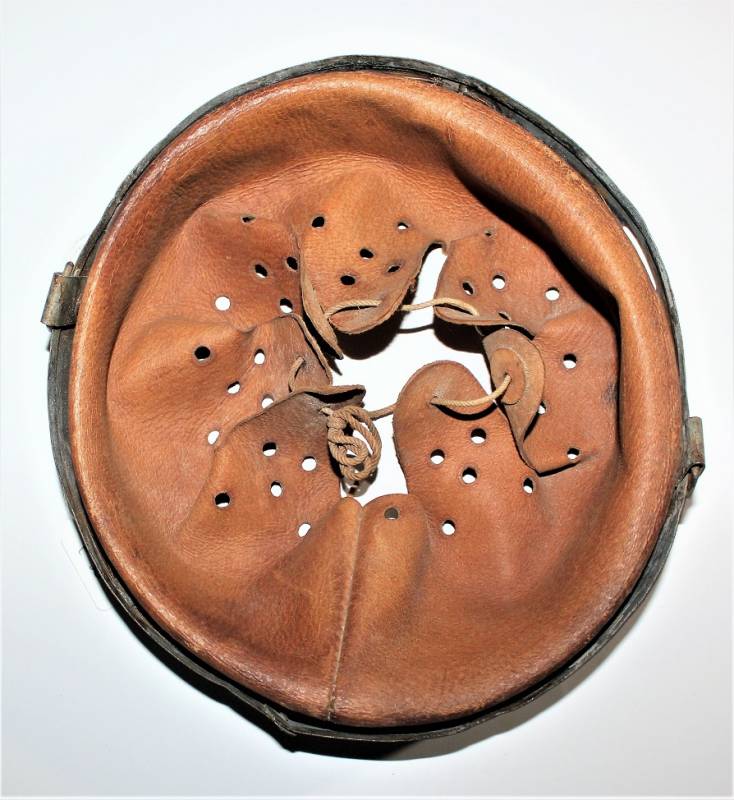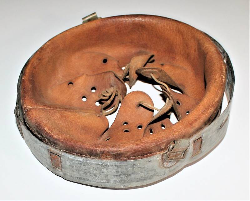 Bella riproduzione di liner per elmetto. Cerchione originale marcato con taglia ferro 64 e nome del fabbricante con data, pelle e controcerchione riprodotti, taglia pelle 56-57.