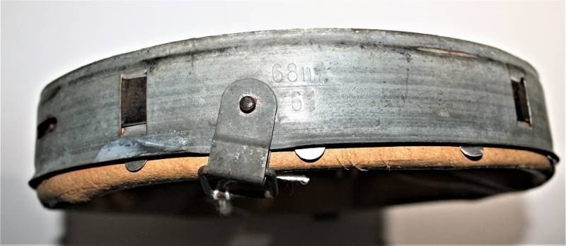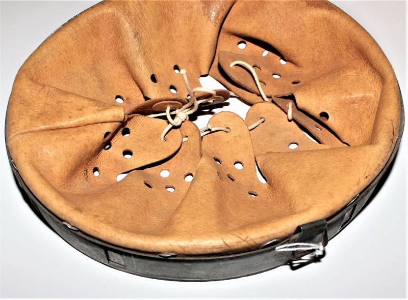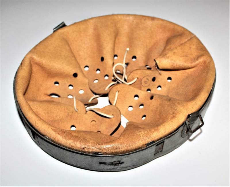 Bella riproduzione di liner per elmetto. Cerchione originale marcato con taglia ferro 68 e nome del fabbricante con data, pelle e controcerchione riprodotti, taglia pelle 61.