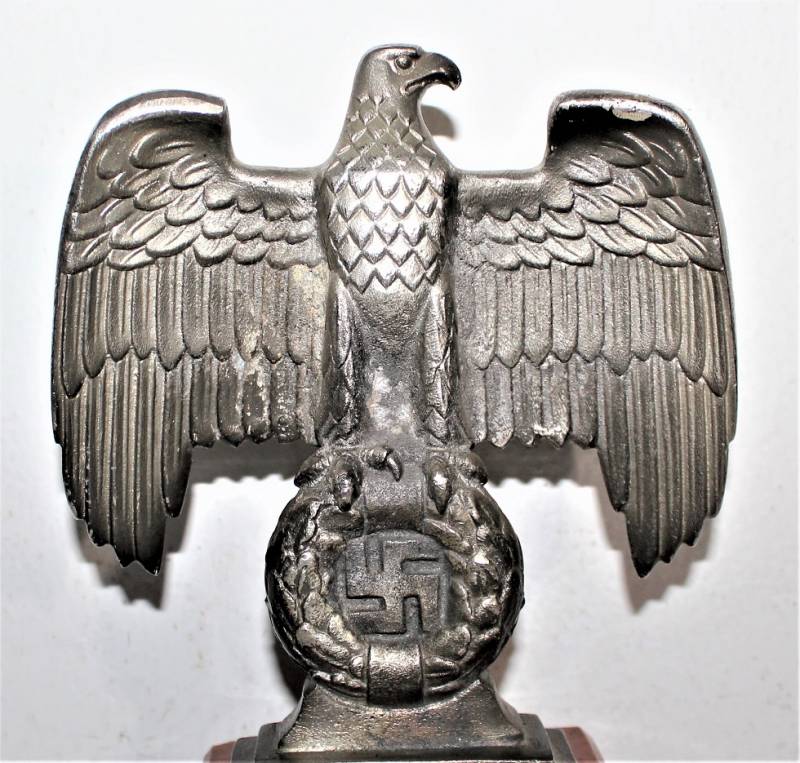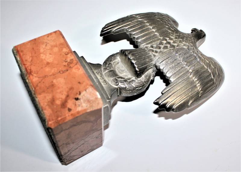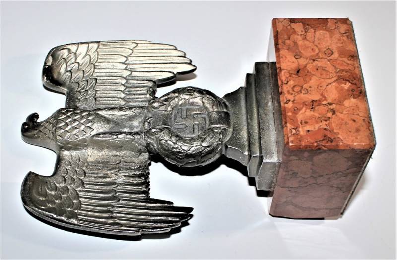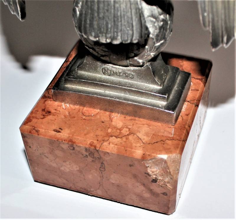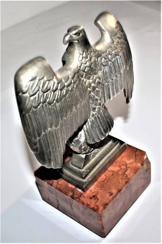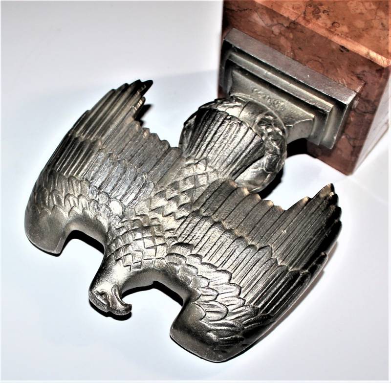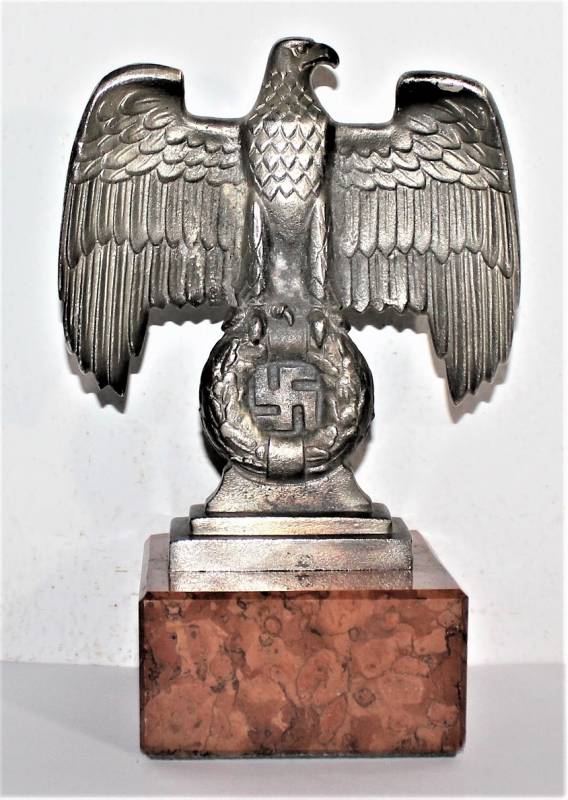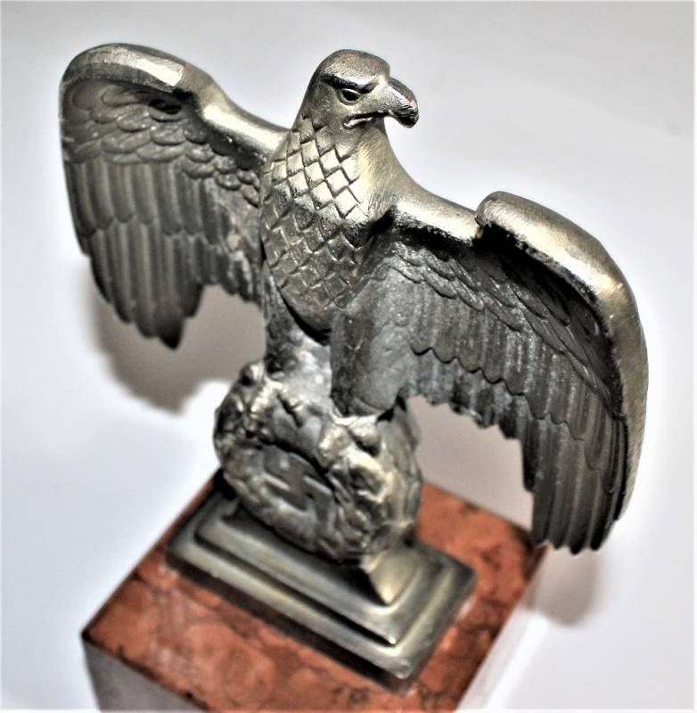 Bella riproduzione dell´aquila politica di Norimberga N.S.D.A.P., nata in fusione d´alluminio con patinatura del tempo, un angolo posteriore della base in marmo è scheggiato!