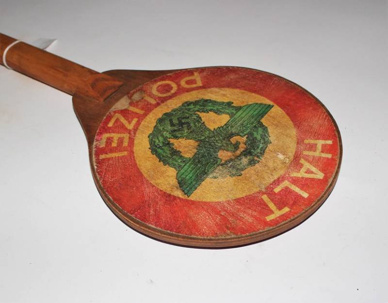 Ottima riproduzione di paletta di controllo traffico della Polizia "Feldgendarmeria", condizioni buone, con patina artificiale del tempo.