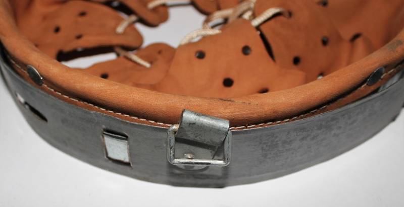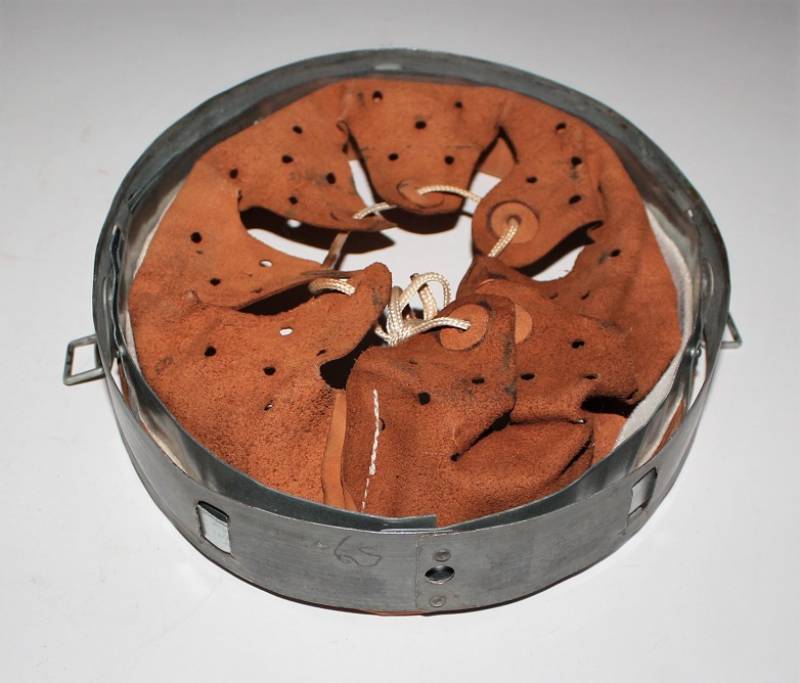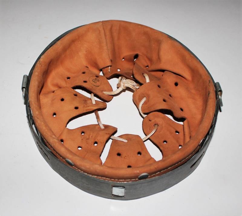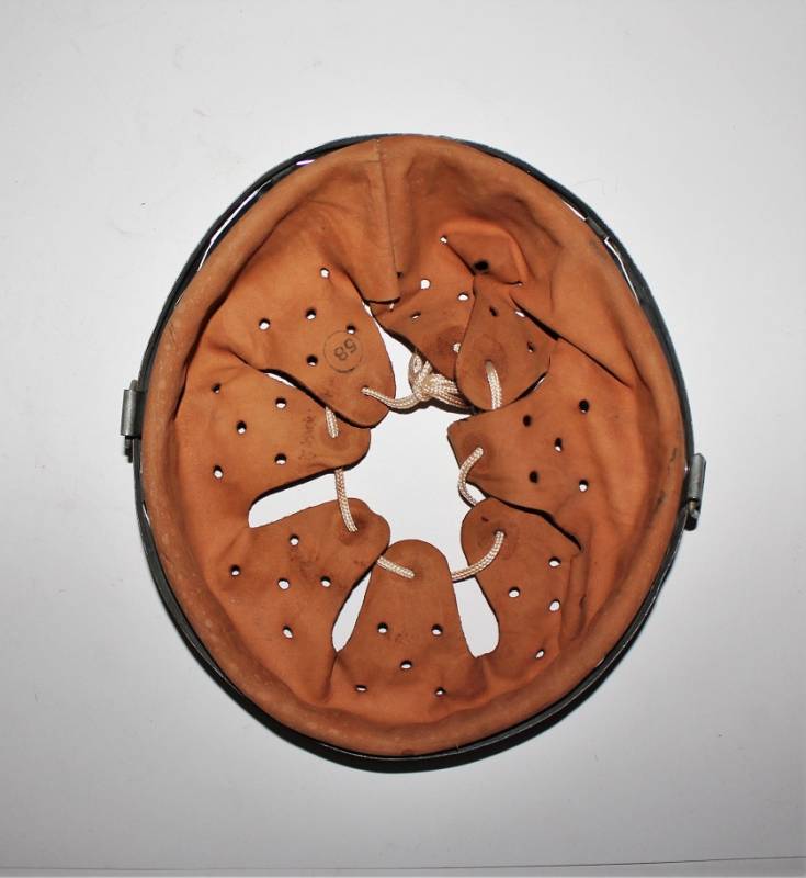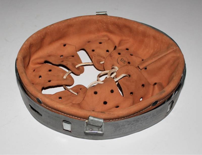 Bella riproduzione di liner per elmetto. Cerchione originale marcato con taglia, pelle e controcerchione riprodotti. Taglia per ferro 66, taglia pelle 58-59.
