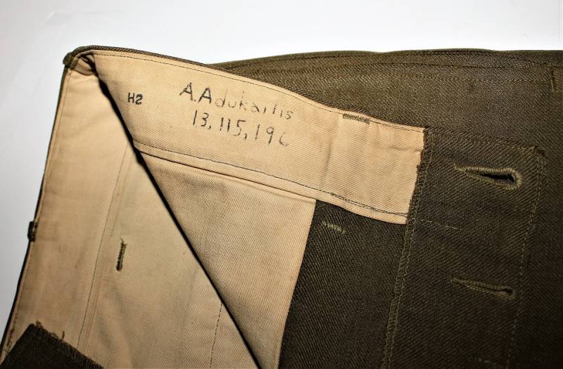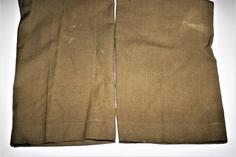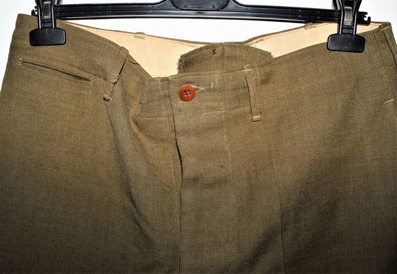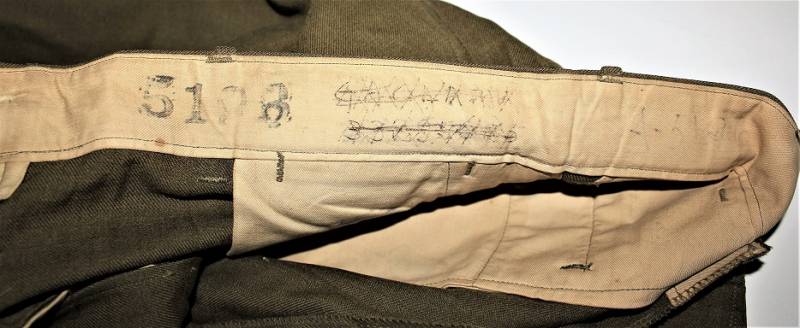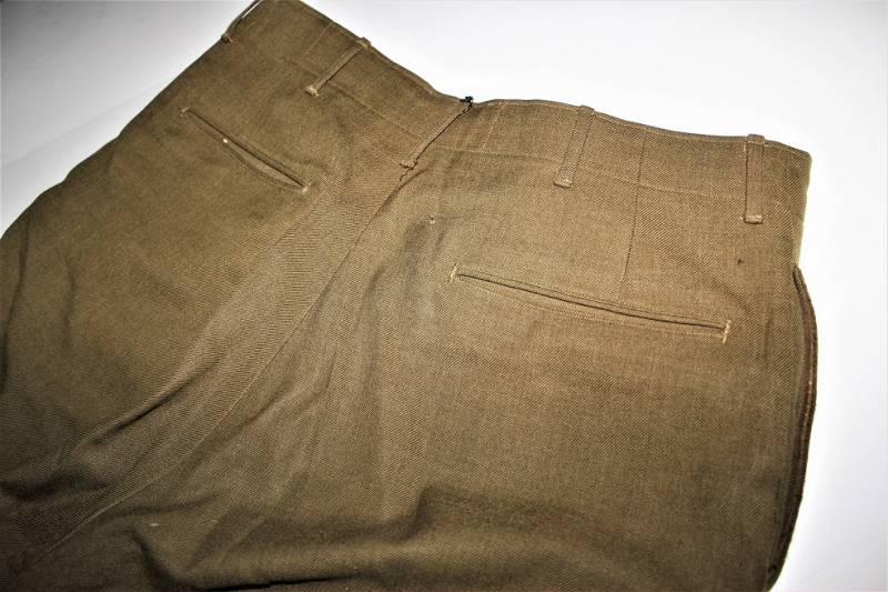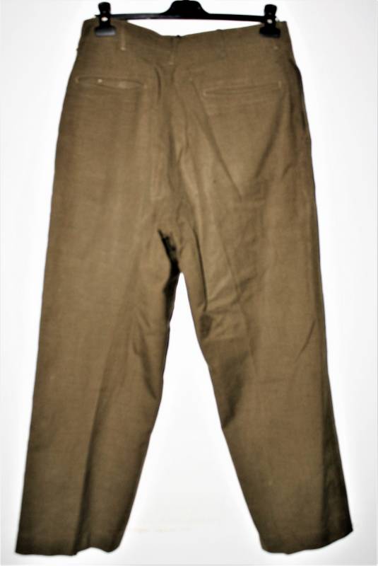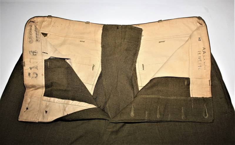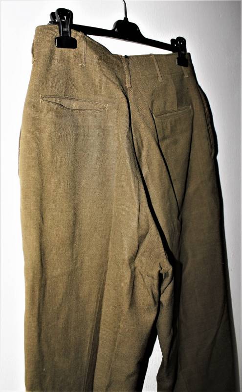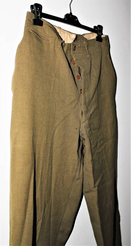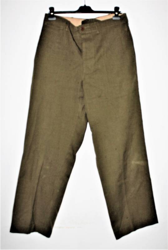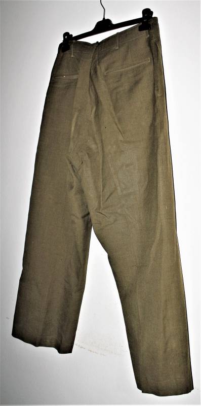 Pantaloni da Campo mod.1937 nati in panno di cotone grigio-verde in discrete condizioni, completi in ogni sua parte, non restaurati o riparati, qualche piccolo buchino di tarma, marcati internamente con numeri di lotto e nome del soldato. Taglia circa 46-48.