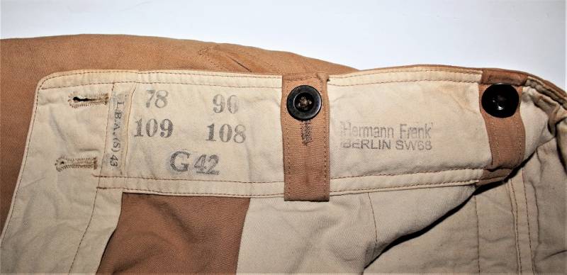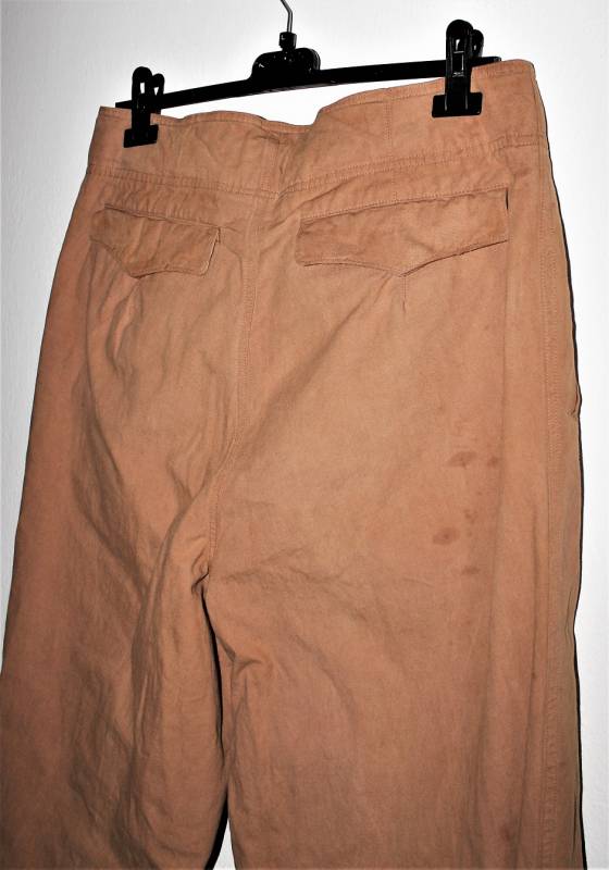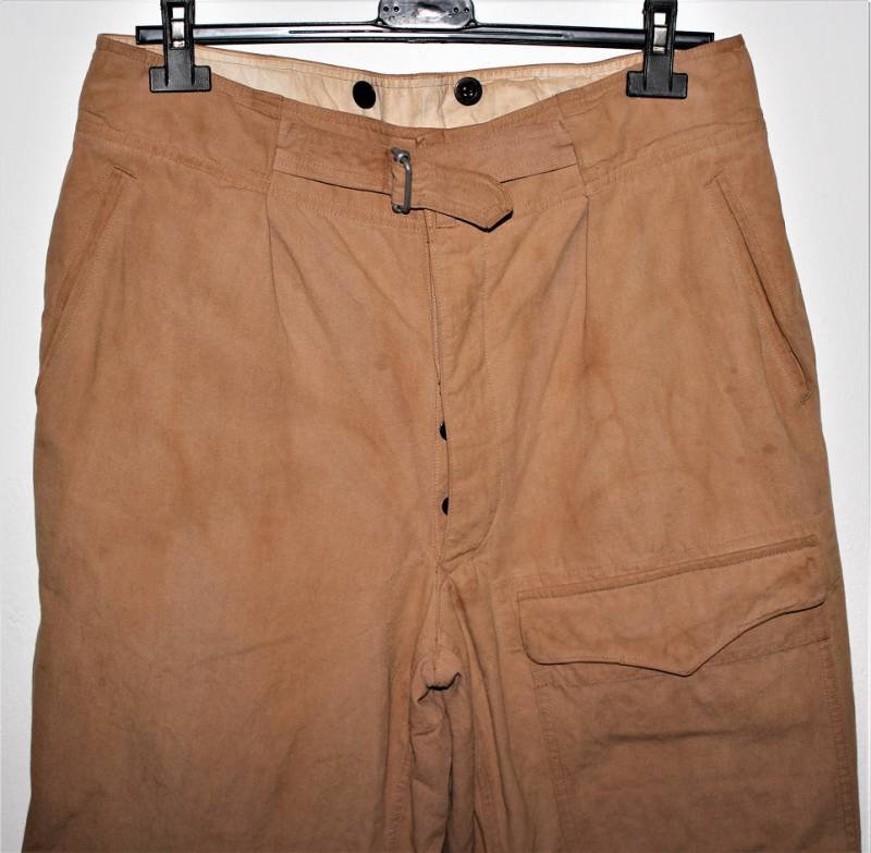 Pantaloni della Luftwaffe da paracadutista tropicali DAK nati in tessuto di cotone in colorazione gialla, tipici Fronte Italiano, condizioni molto belle e usati pochissimo, senza buchi, strappi e riparazioni, solo con leggera patina del tempo e dellŽuso, marcati internamente con nome del fabbricante, taglie e L.B.A.(S)43.