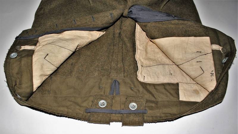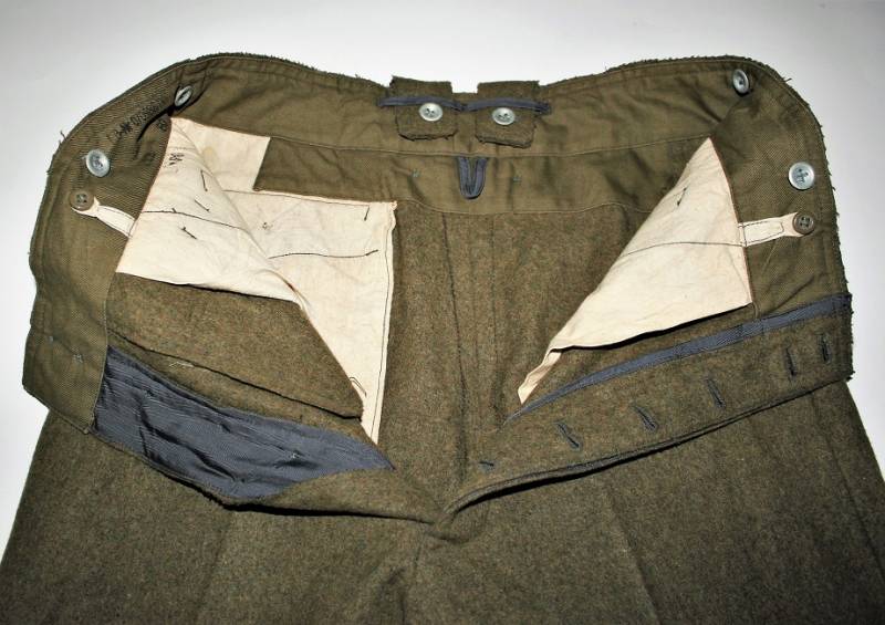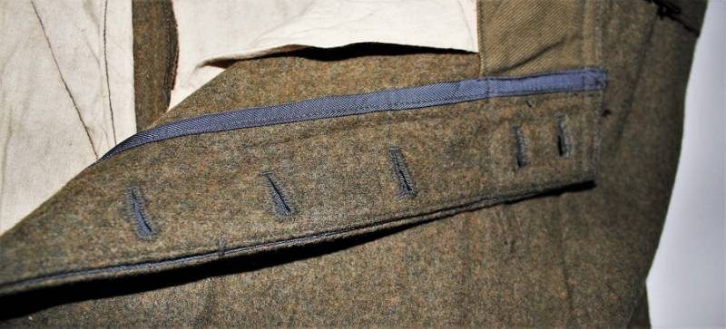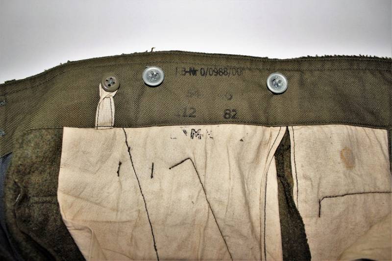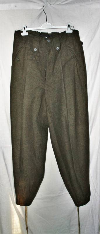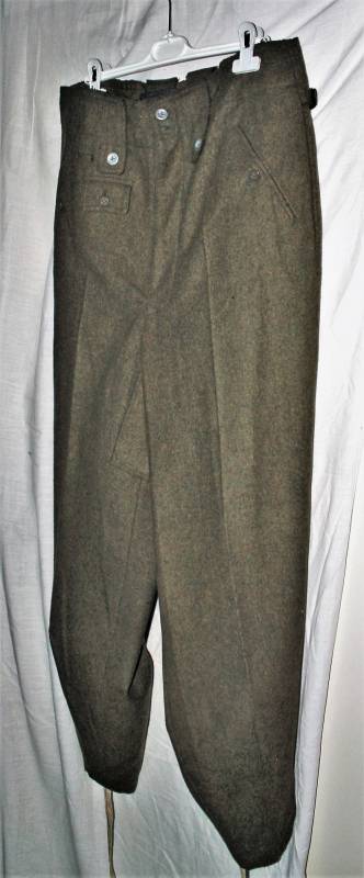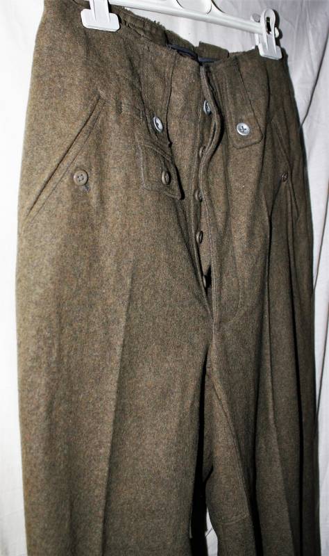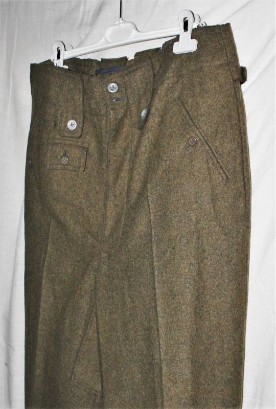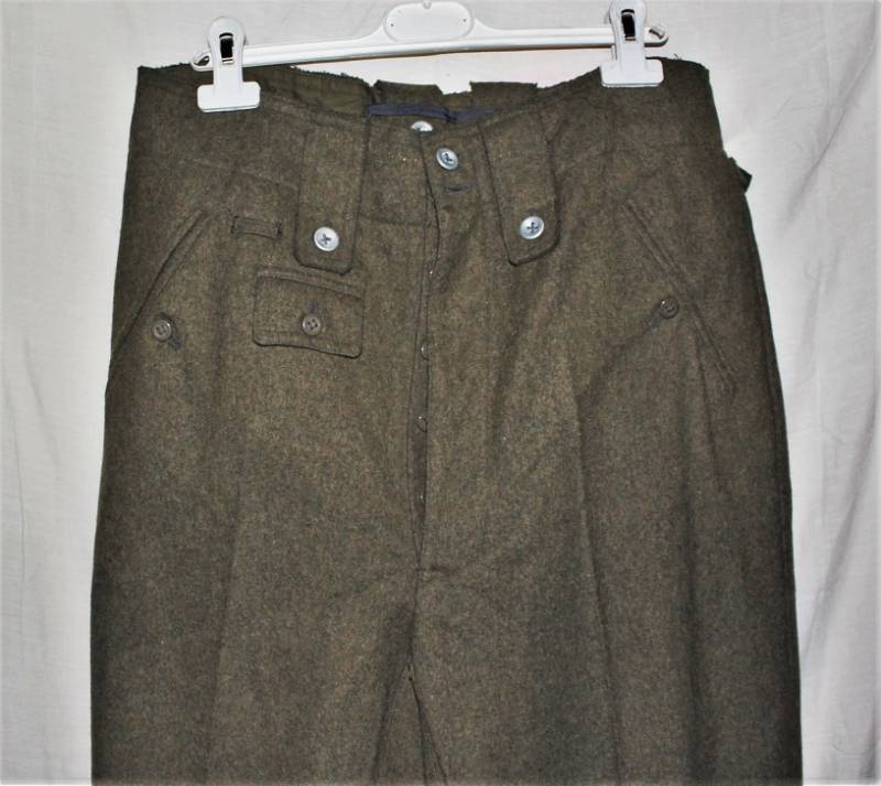 Stupendi pantaloni da truppa mod.44 realizzati in panno di lana verde-marrone tipico fine guerra, in condizioni perfette quasi pari al nuovo, forse fondo di magazzino, completi in ogni sua parte, marcati internamente con RBN n°....., numeri delle taglie e modello. Taglia circa 48-50. Originali 100% WWII periodo.