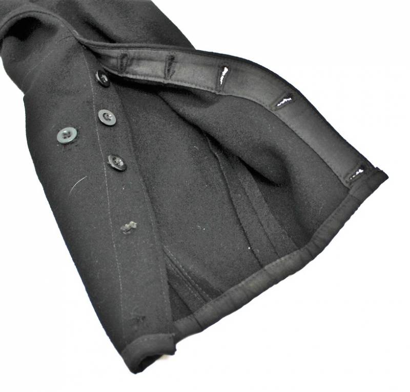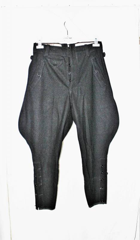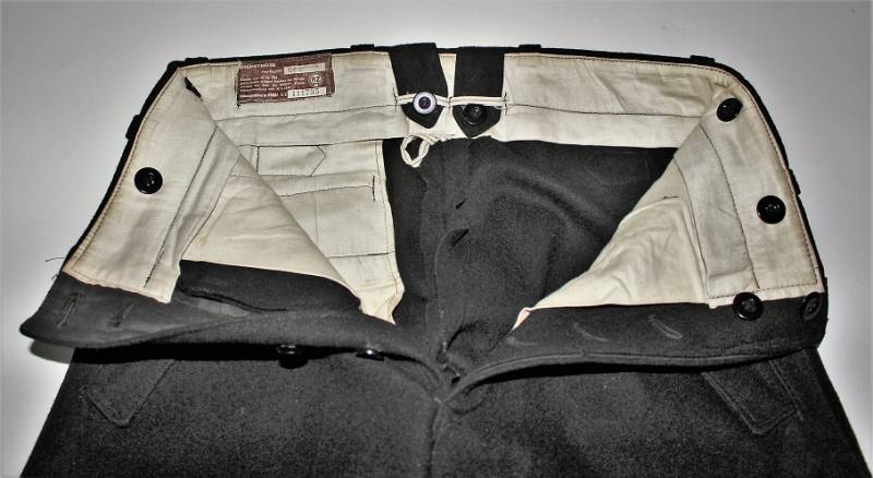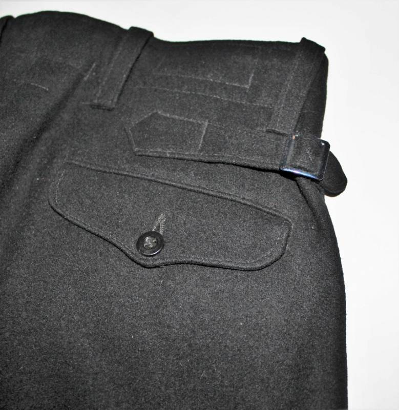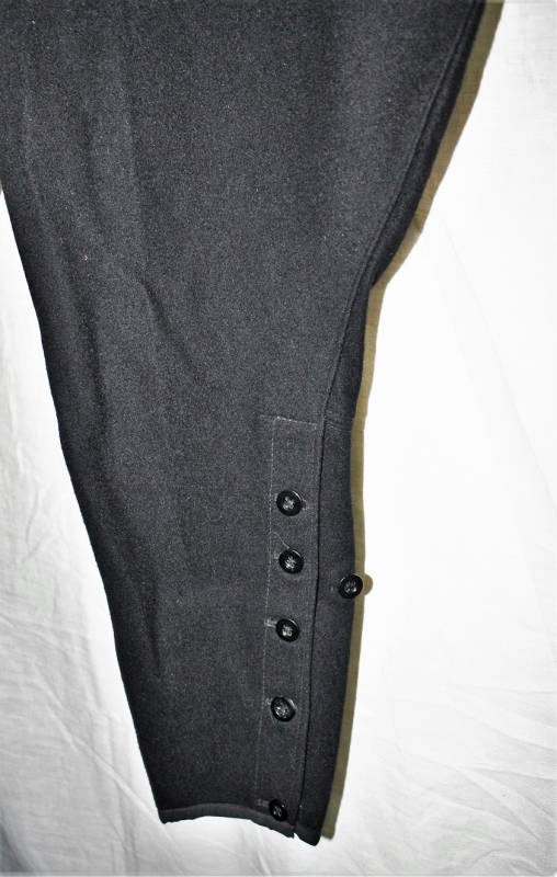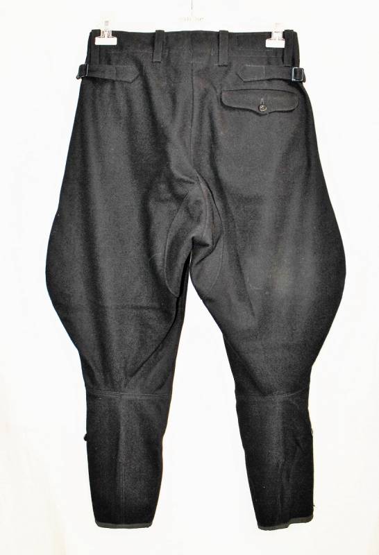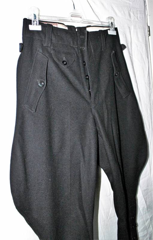 Pantaloni politici neri da Ufficiale NSDAP in ottime condizioni, completi in ogni sua parte, fatta eccezione per la mancanza di due bottoni sul gambale destro, senza buchi, strappi o riparazioni, confezionati in stoffa di lana nera. Etichetta RZM cucita internamente con numeri di lotto e produzione. Taglia circa 46. Originali 100% WWII periodo.