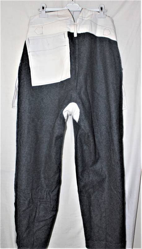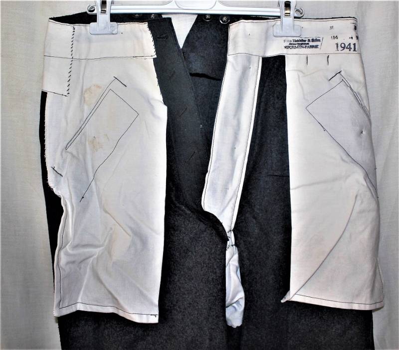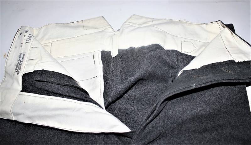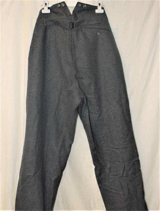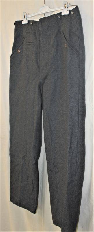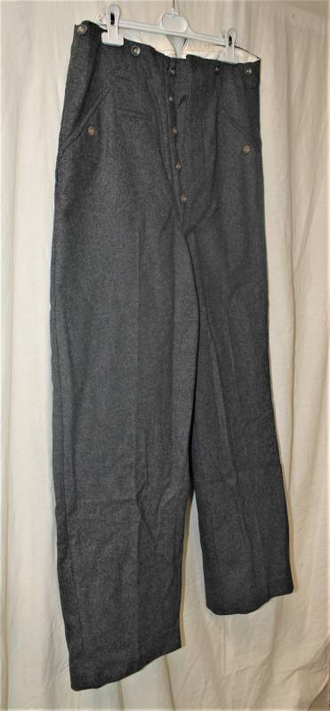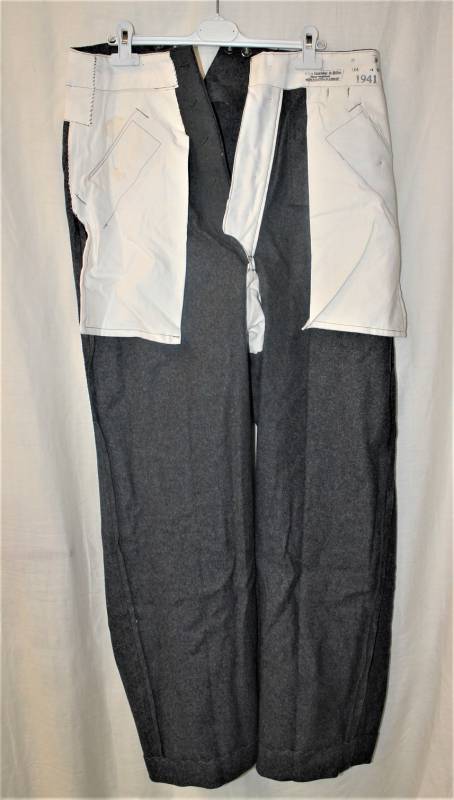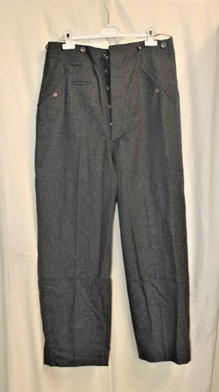 Pantaloni in panno di lana mod.36 LW, in colorazione grigio-blu, condizioni perfette, fondo di magazzino, mai usati, marcati internamente con fabbricante, numeri delle taglie e data 1941. Taglia circa 48. Originale 100% WWII periodo.