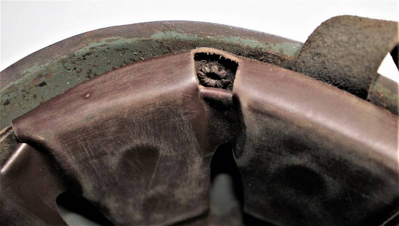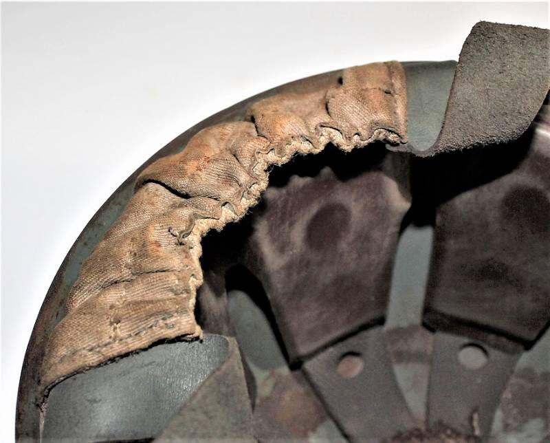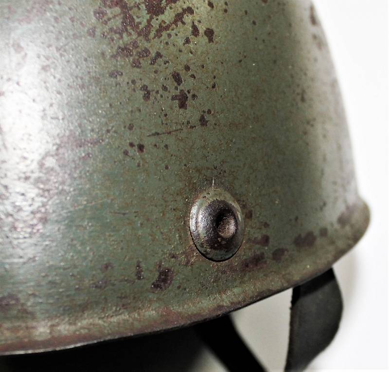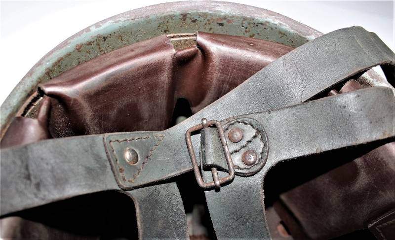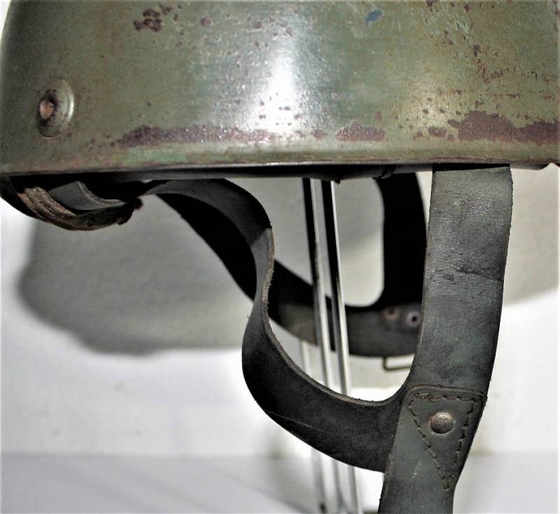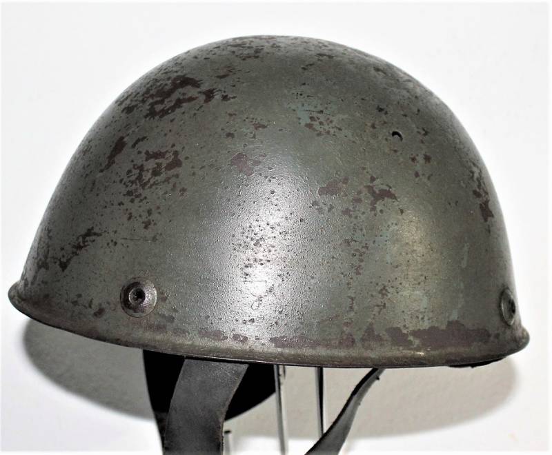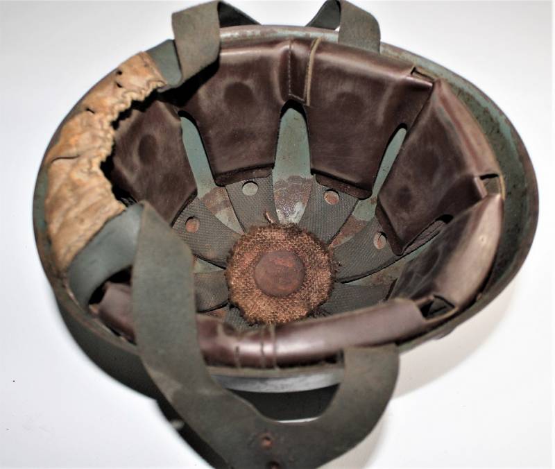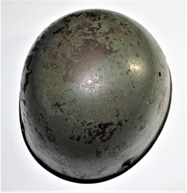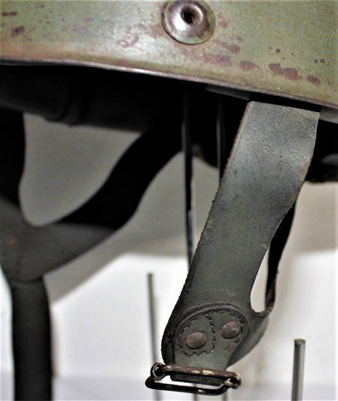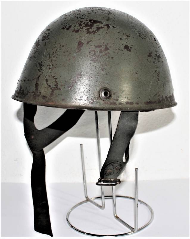 Elmetto da paracadutista italiano modello 39/41, versione molto rara del più comune modello 39/42, ne furono prodotti pochi e la maggior parte furono convertiti nel modello 42, completamente o in parte, sostituendo lŽimbottitura di primo modello e il sottogola (non in questo caso) è stata sostituita solo lŽimbottitura, si può ipotizzare si tratti in questo caso di un modello di transizione, si nota allŽinterno della cupola la traccia del precedente liner (tampone in gomma interno). Il sottogola è rimasto lŽoriginale con para nuca in tela a doppio strato, esternamente in tela cerata e internamente in robusta tela di cotone cucita al sottogola stesso, tra i due strati di tela è cucito un elastico per tenere il tutto ben fissato al collo del soldato. Il sottogola come sul modello successivo è in cuoio ma più largo, la fibbia è la stessa del secondo modello. LŽelmo ha colorazione standard grigio verde abbastanza vissuta, la cupola esterna ha una sovra colorazione verde scura. La taglia è piccola forse 55 o 56, manca la "stella" in gomma sulla cupola, i rivetti/aeratori sono del secondo modello con leggera bordatura. Originale 100% WWII periodo.