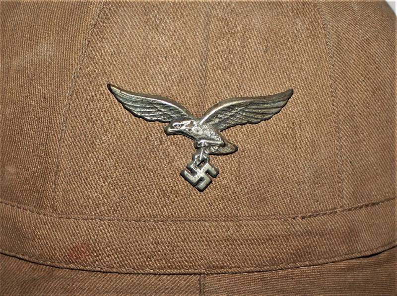 Casco coloniale della LW in buone condizioni, non restaurato o riparato, solo con patina del tempo e dellŽuso e completo in ogni sua parte, interno, sottogola e fregi mai smontati, marcato sotto il parasudore con RBN n.., data 1941 e taglia 56, fregi belli mai smontati, uno dei tre fermi dello scudetto dei colori nazionali è rotto. Originale 100% WWII periodo.