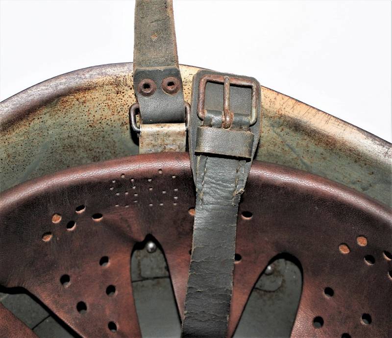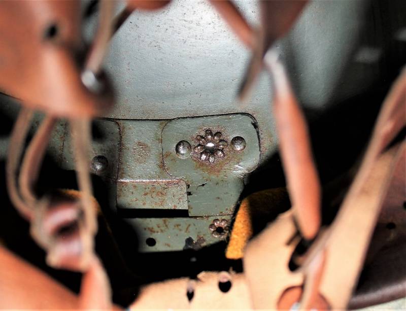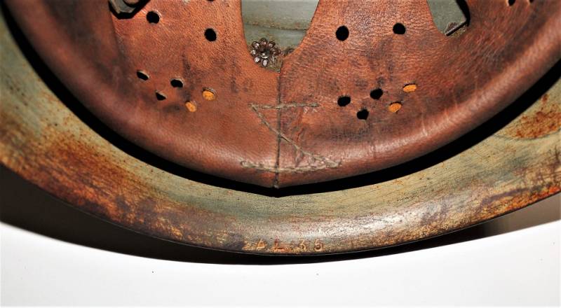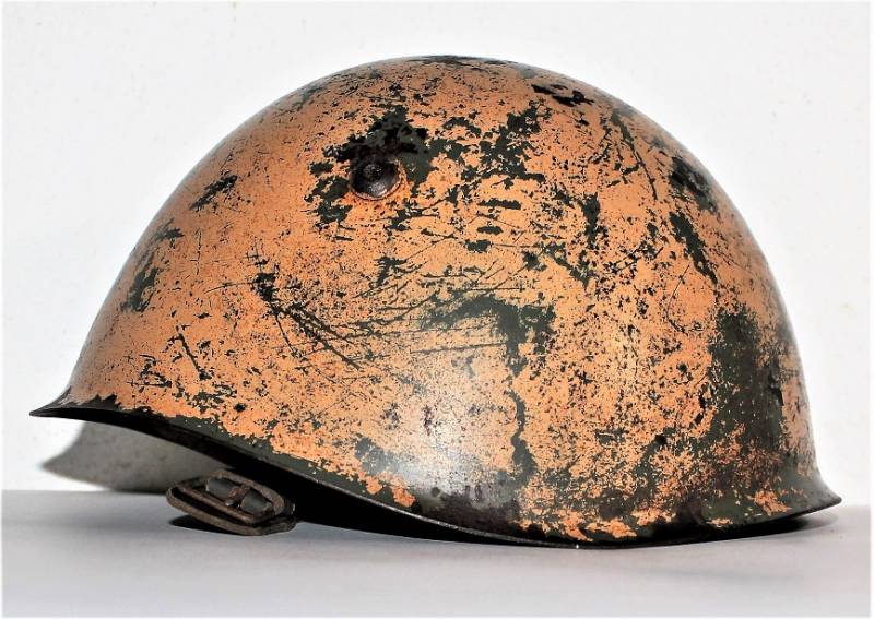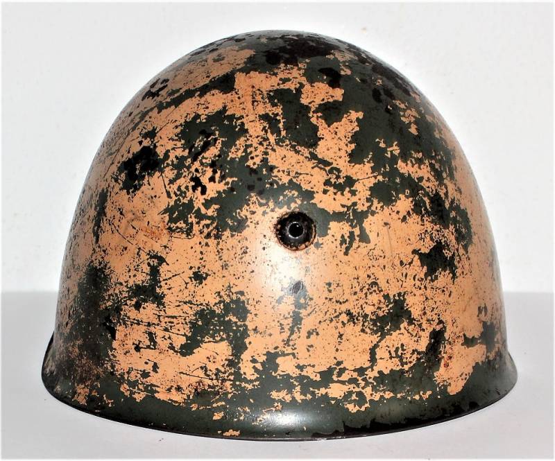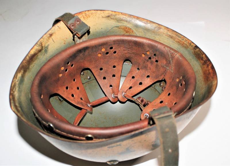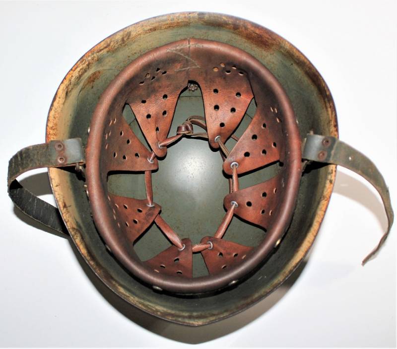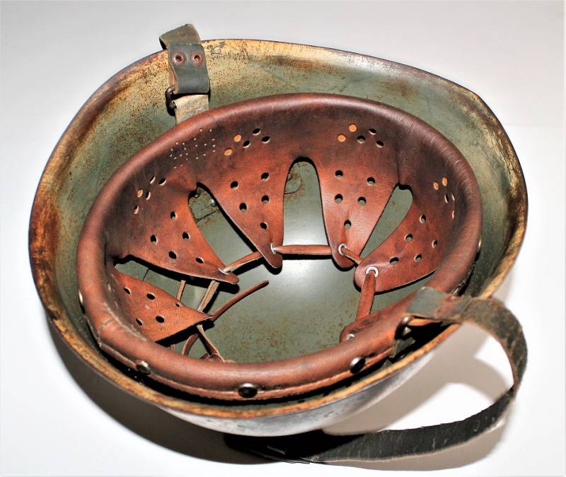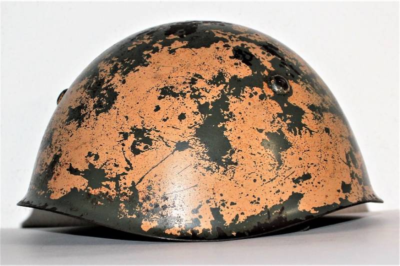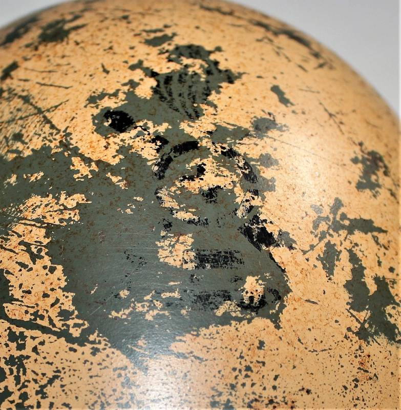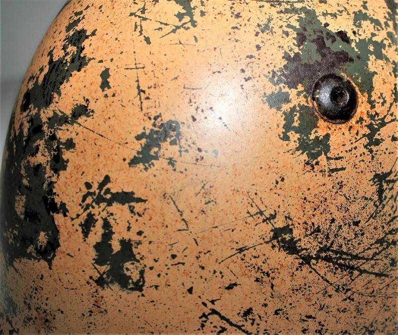 Elmetto mod.33 R.E. con fregio parzialmente visibile della Fanteria Carrista in colorazione mimetica giallo Afrika al 70%, belle condizioni non restaurato o riparato, mai smontato, completo in ogni sua parte con patina del tempo e dellŽuso, ottima la pelle dellŽinterno e del sottogola non lesionate, taglia 56, pelle marcata internamente con timbro Arsenali di Torino.