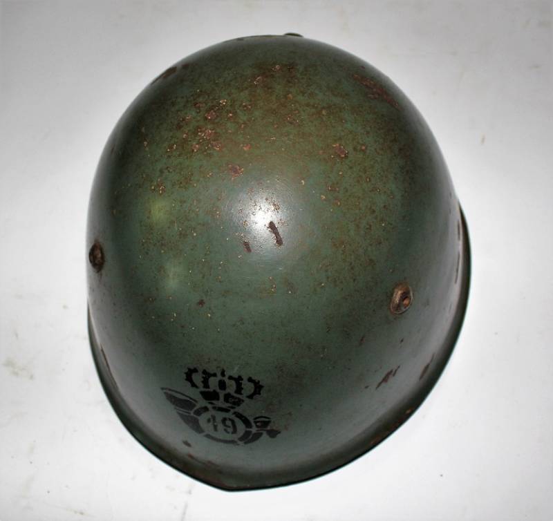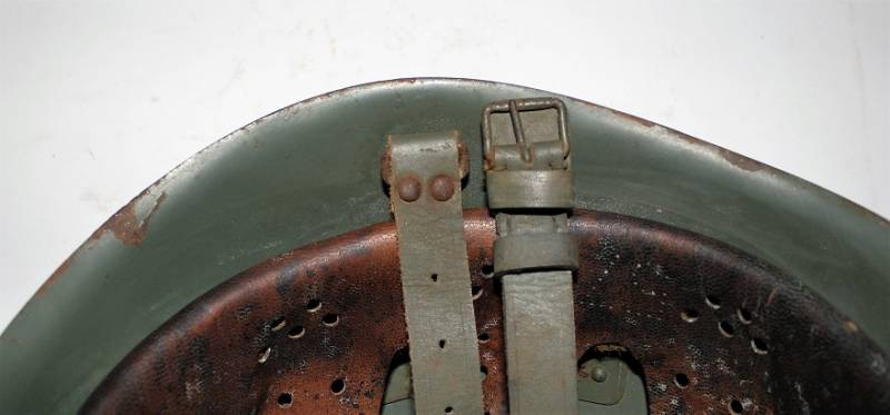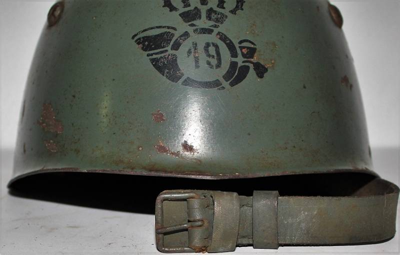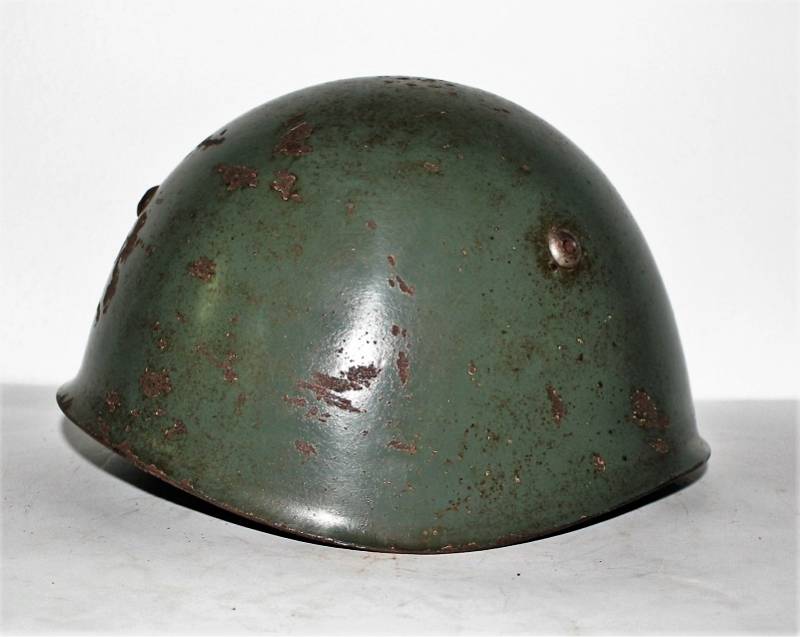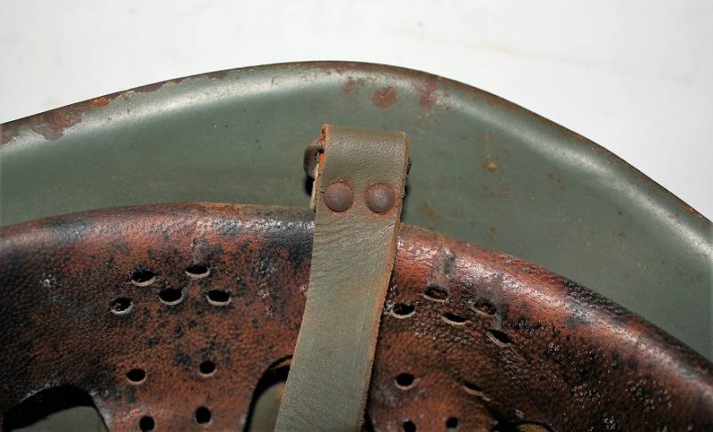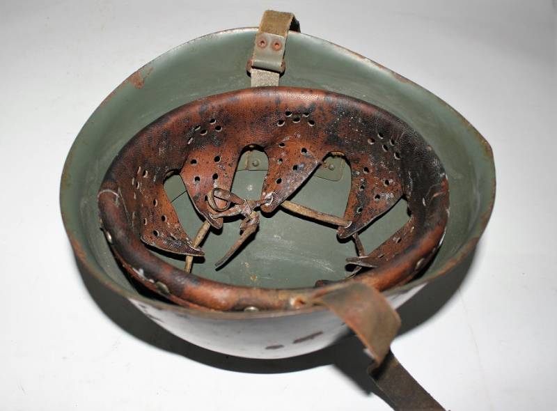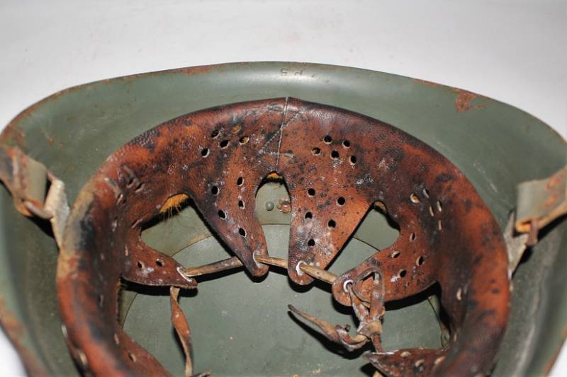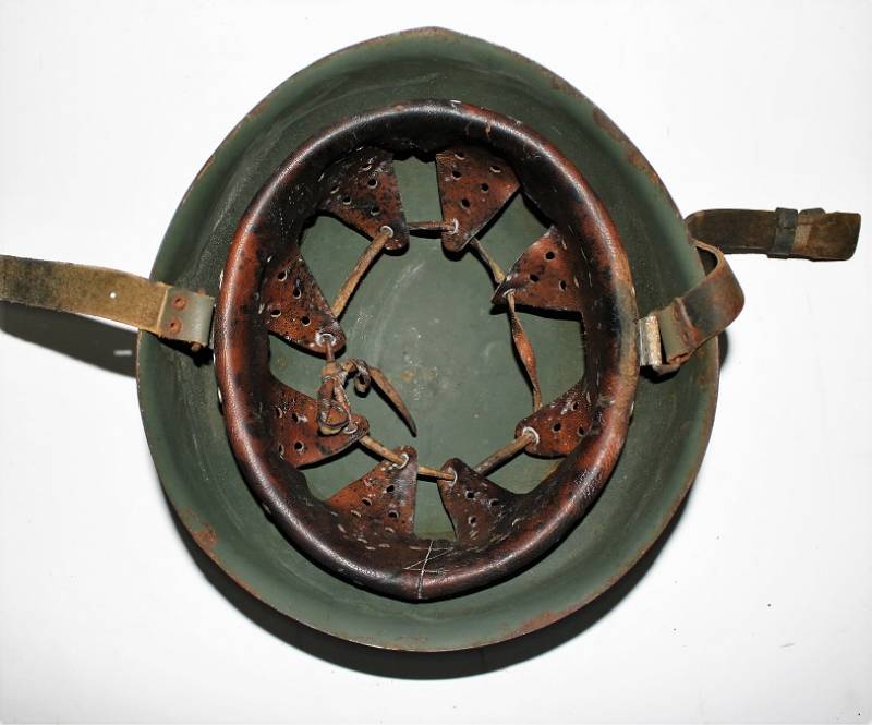 Elmetto R.E. mod.M33 della Cavalleria, nato in tipica colorazione verde chiaro al 90%, fregio frontale della Cavalleria fatto a mascherina, completo in ogni sua parte, con sottogola e interno mai smontati, con patinatura del tempo e dellŽuso, marcato sul ferro con numero di lotto e marcato allŽinterno della pelle con timbro a inchiostro dellŽarsenale di Torino (poco visibile). Rivetti di 2°tipo a otto linguette. Taglia 57. Originale 100% WWII periodo.