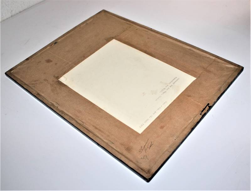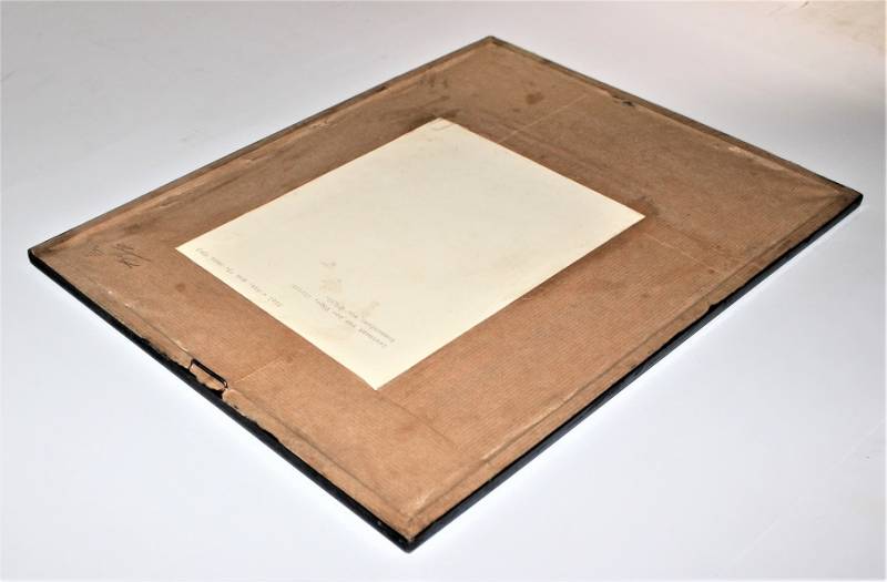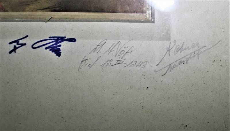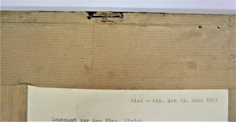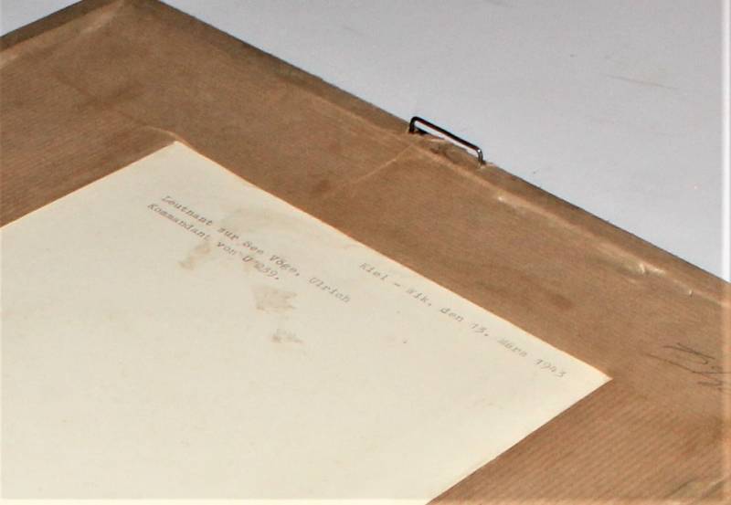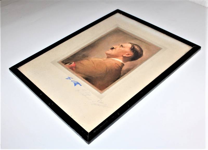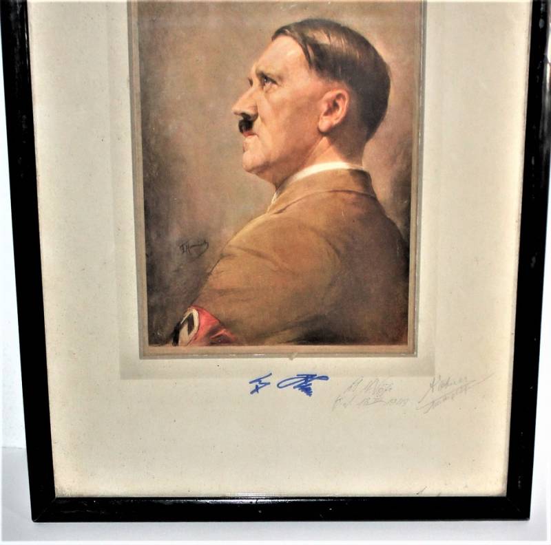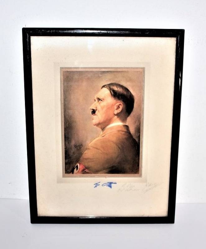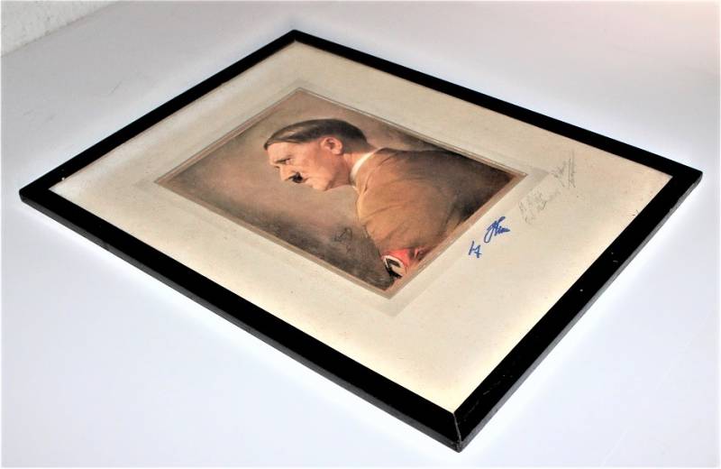 Raro e bel quadro raffigurate lŽimmagine Adolf Hitler di profilo, con firma del pittore, completo della sua cornice originale e firma a tampone di Adolf Hitler, condizioni ottime e mai smontato, solo con leggera patina del tempo e dellŽuso, sul retro del quadro sono presenti le scritte del posto (Kiel) e la data 13 Marzo 1943, appartenuto al Capitano di Vascello Ulrich Voge comandante dellŽU-BOOT U239, probabilmente il quadro si trovava nella cabina del comandante.