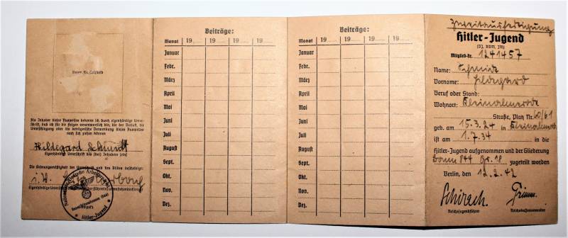 Libretto-pass per Membri della Hitler Jugend datato Berlino 12.02.1942 in condizioni ottime quasi pari al nuovo ma con foto rimossa.