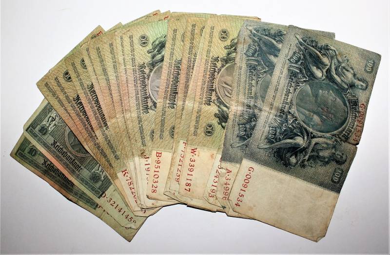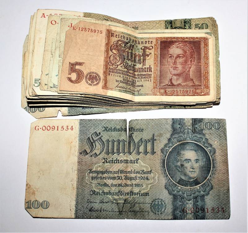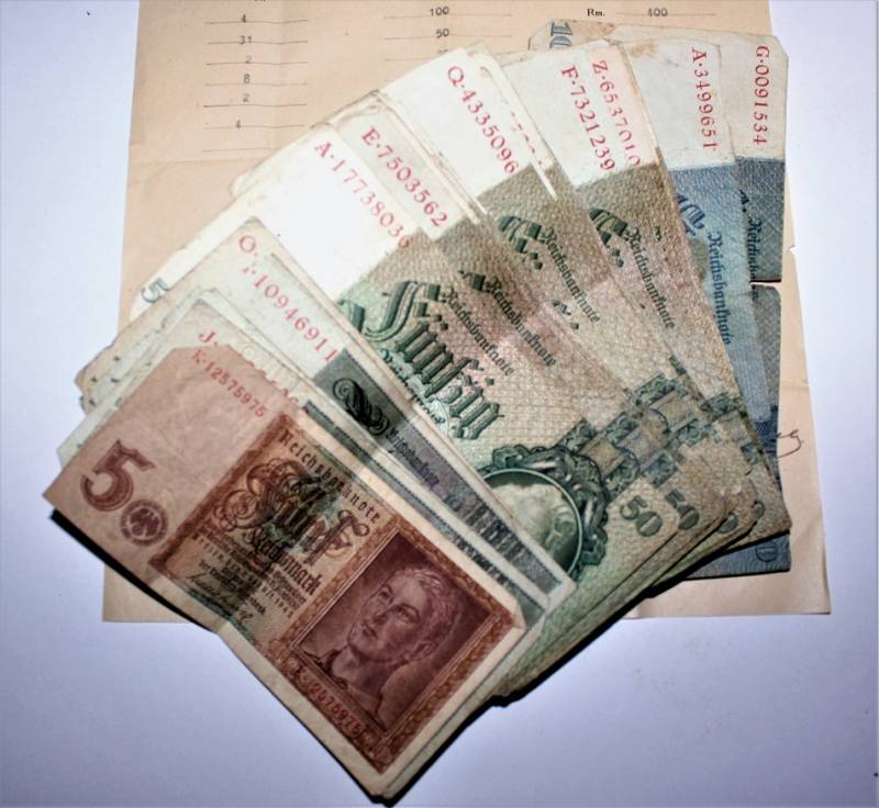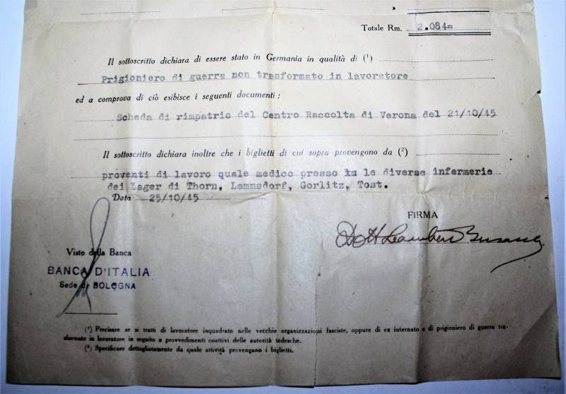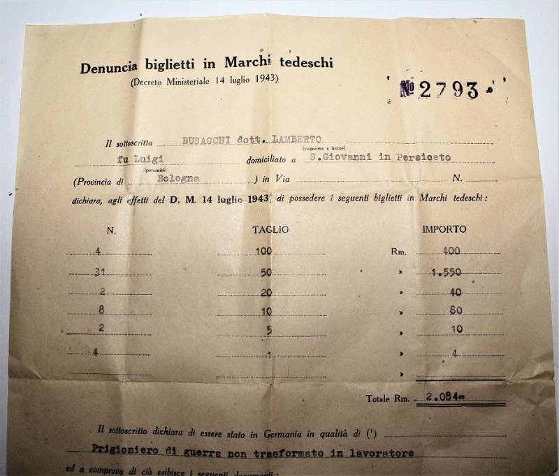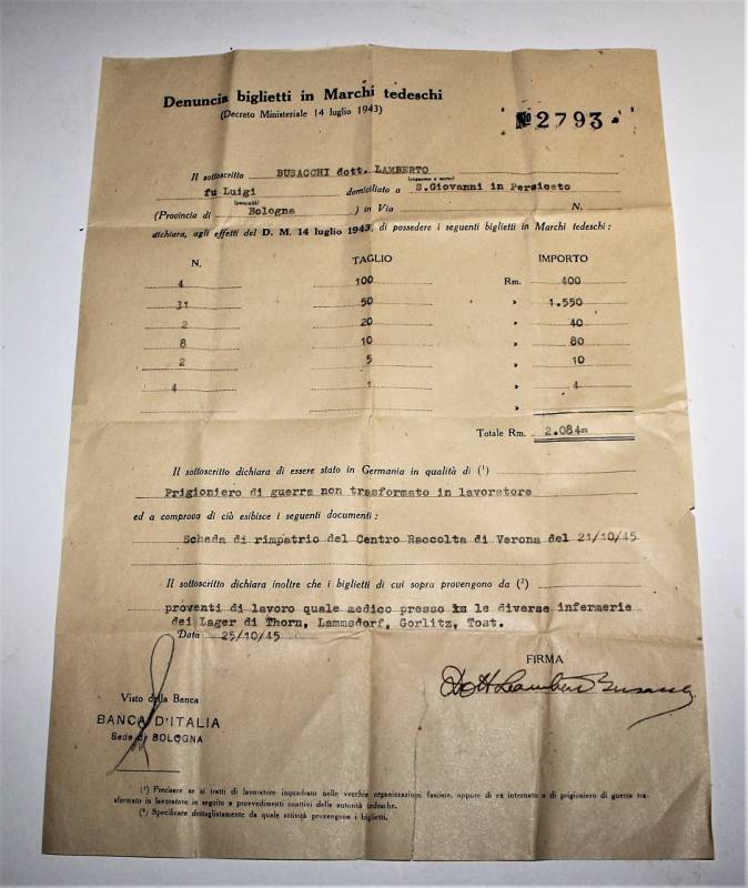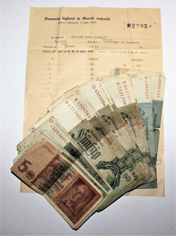 Banconote tedesche Reichmark per un totale di 2084 RM accompagnate da denuncia di banconote valuta estera in cambio di moneta Italiana presso la banca dŽItalia con sede in Bologna, appartenute ad un medico Italiano della provincia di Bologna il quale ha prestato servizio per lŽesercito tedesco nei seguenti Lager: Lager di Thorn, Lammsdorf, Gorlitz e Tost, il tutto in buone condizioni.