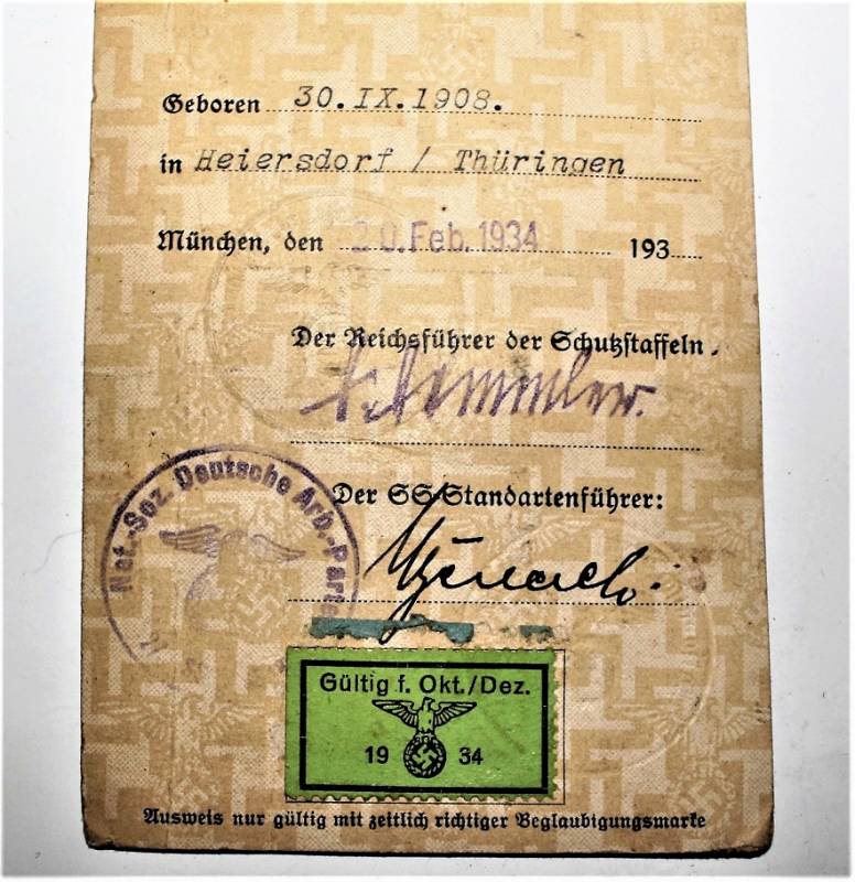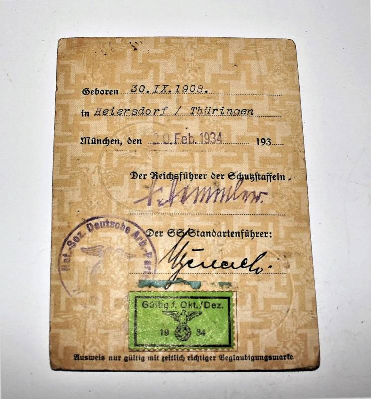 Tessera nominativa politica personale N.S.D.A.P. completa di fotografia, condizioni molto buone, con leggera patina del tempo e dellŽuso, firmata da Heinrich Himmler. Originale 100% WWII periodo.
