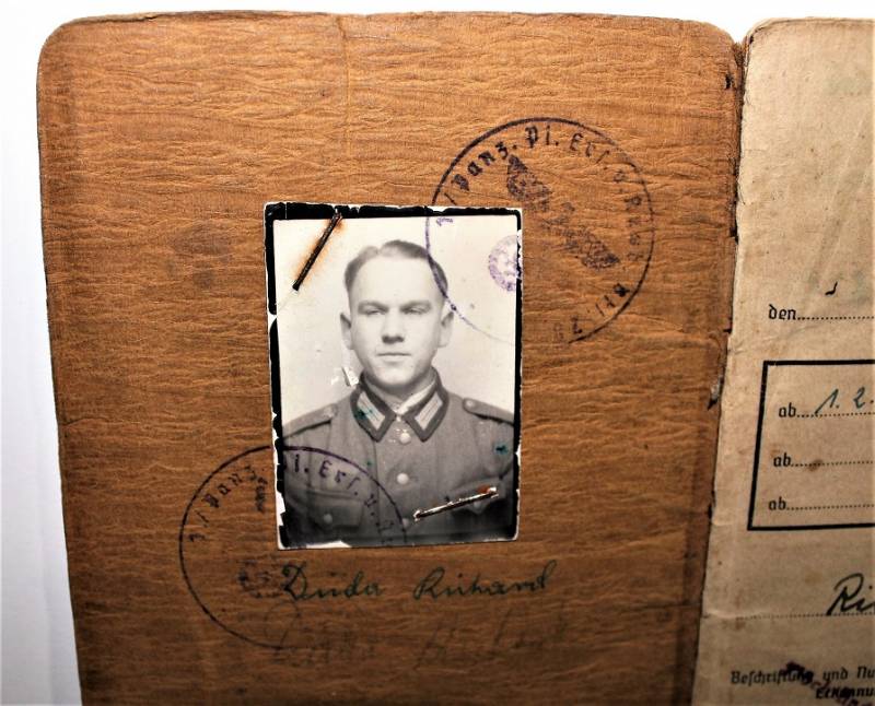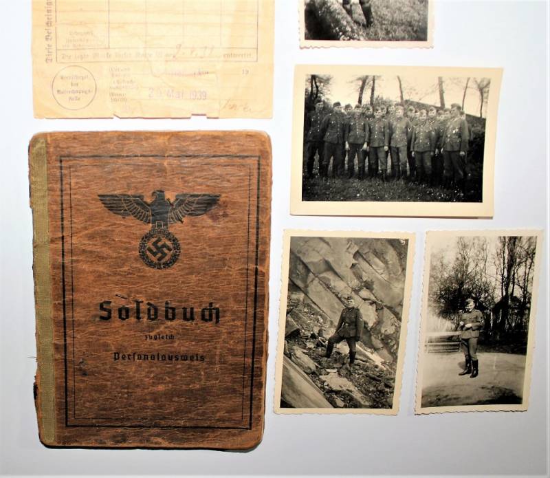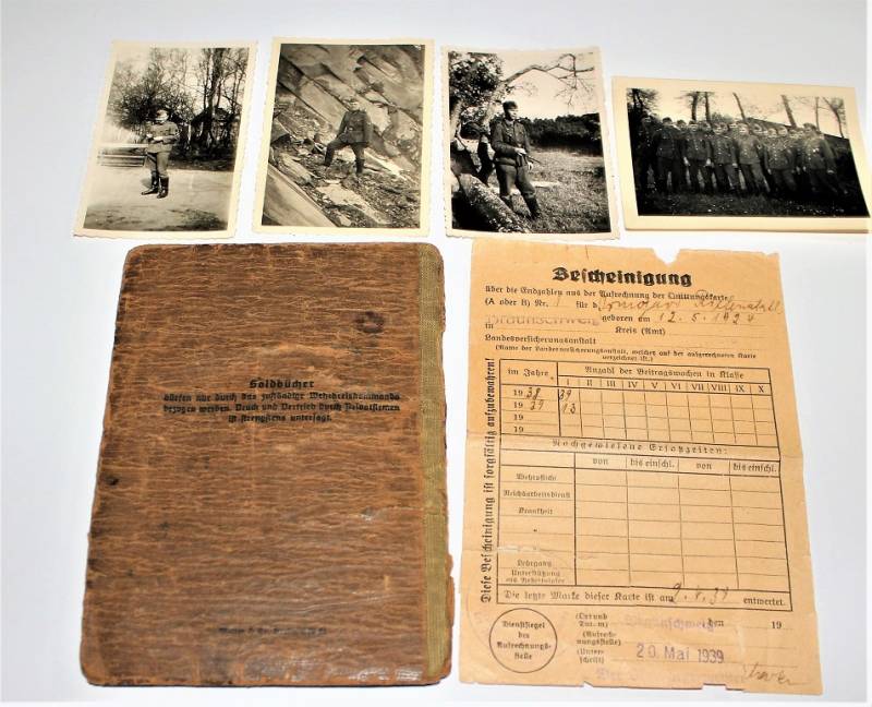 Soldbuch di un Soldato della WH, condizioni buone ma usato, mancante della pagina 7/8, allŽinterno 4 fotografie di Soldati tedeschi e documento. Originale 100% WWII periodo.