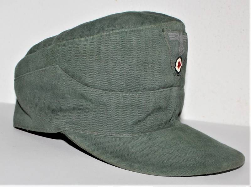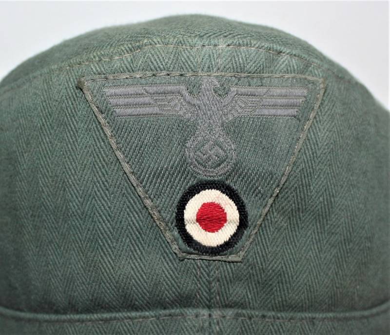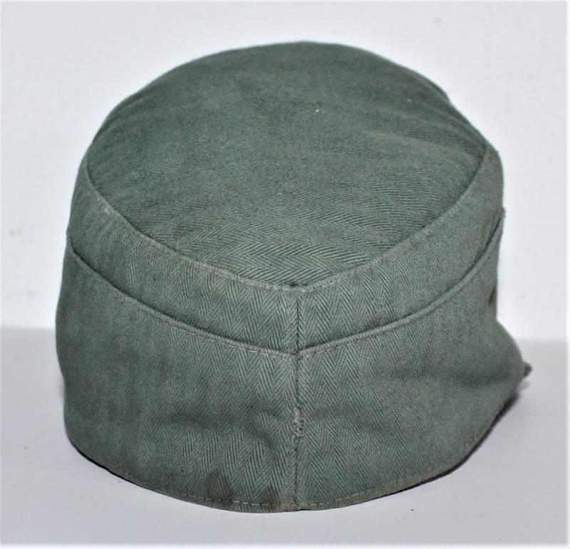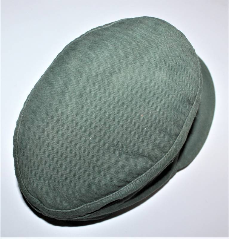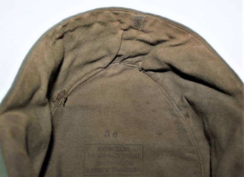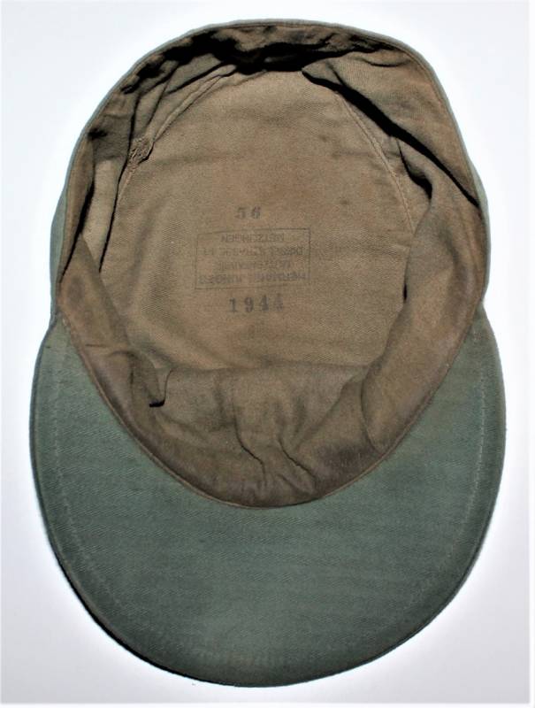Raro berretto M43 da truppa della WH, nato in stoffa verde canneto, ottime condizioni, leggeri segni del tempo e dellŽuso, non restaurato o riparato, cuciture perfette, piccolo buco sulla fodera interna, fregio regolamentare M43 montato in epoca e cucito a macchina. Marcato internamente con nome fabbricante, data 1944 e taglia 56. Originale 100% WWII periodo.