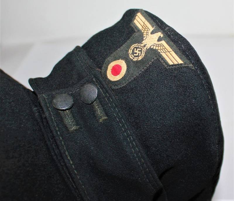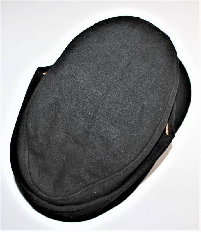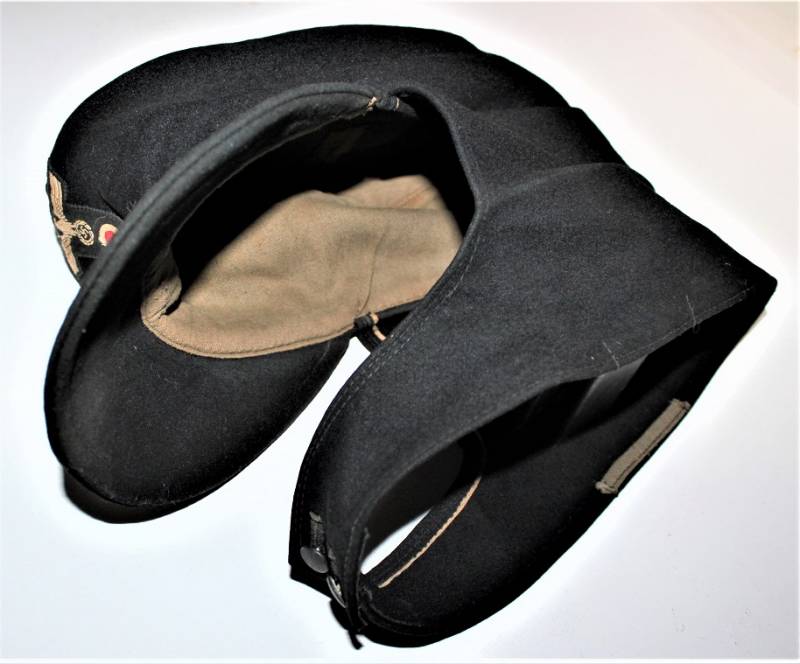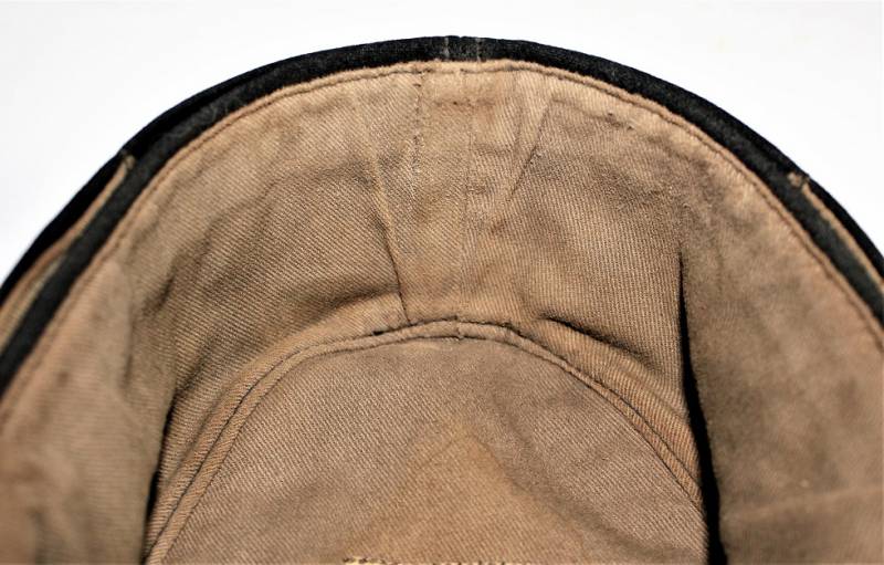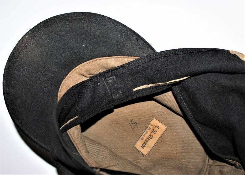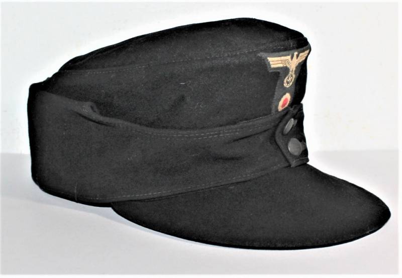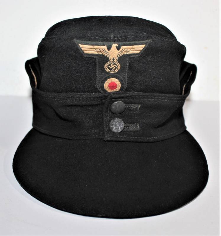 Berretto mod. M43 da truppa della Wehrmacht da carrista vissuto ma in buone condizioni, con patina del tempo e dellŽuso senza buchi o strappi, ma molto portato, completo di fregio regolamentare "T" su fondo nero cucito a macchina. Berretto realizzato in panno di lana nero, interno marcato numero di taglia 57 e etichetta in stoffa con nome del soldato e reparto. Originale 100%. WWII periodo.