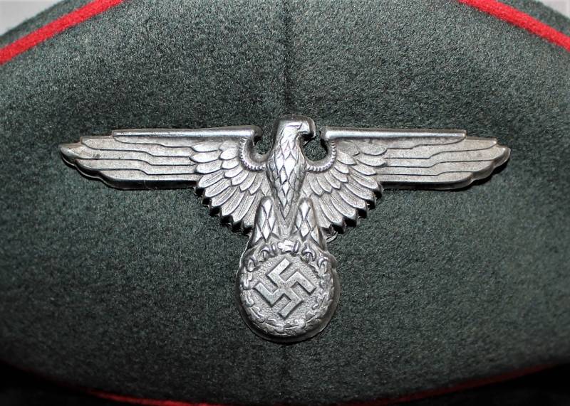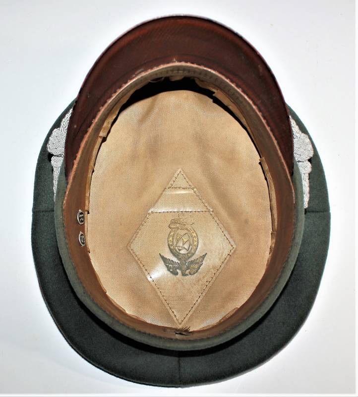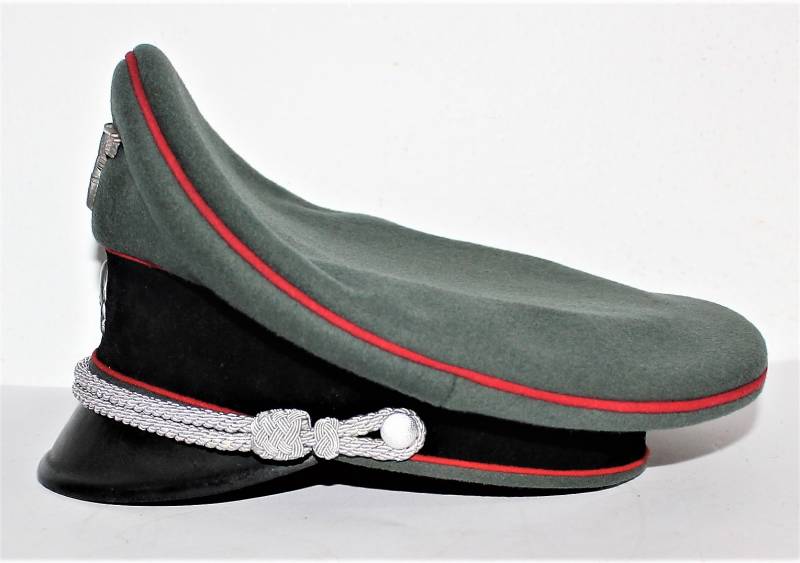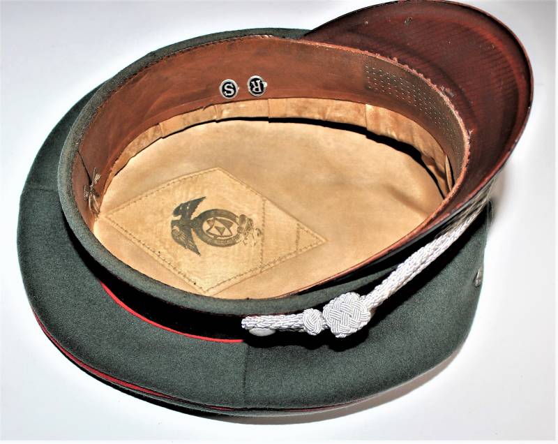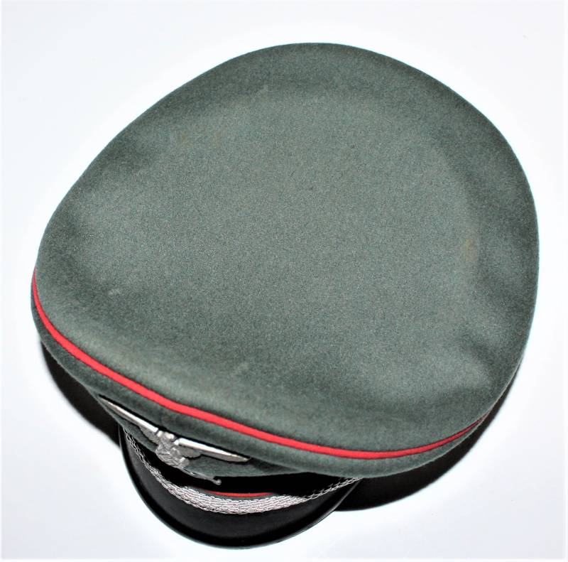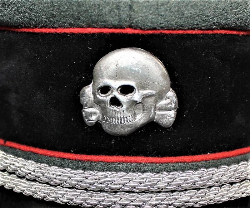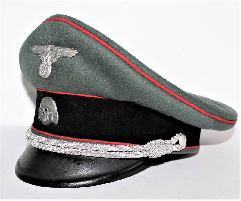 Stupendo schirmmutze da Ufficiale W.SS Artiglieria, waffenfarbe rosso, condizioni ottime, con segni del tempo e dellŽuso, non restaurato o riparato, completo in ogni sua parte, con fregi montati in epoca, allŽinterno diamante di celluloide con logo fabbricante, iniziali del nome in lamierino sul parasudore, taglia circa 56. Originale 100% WWII periodo.