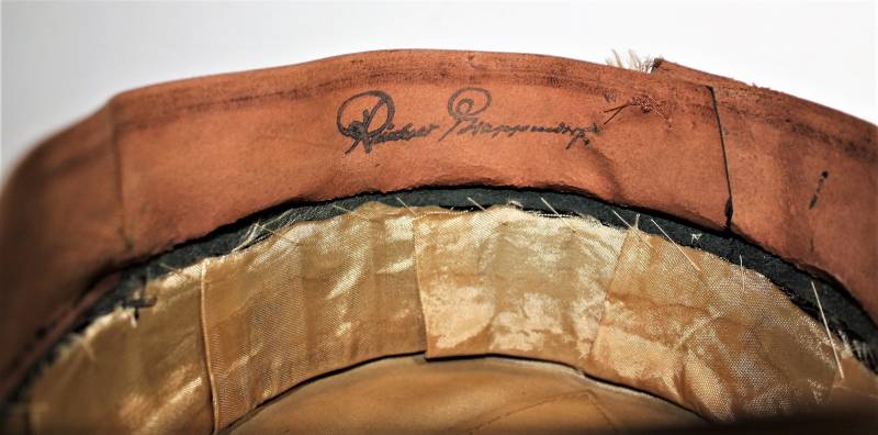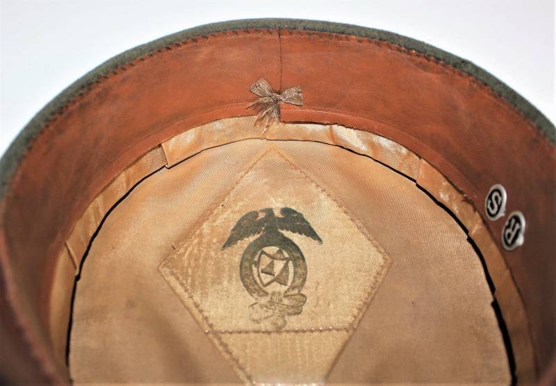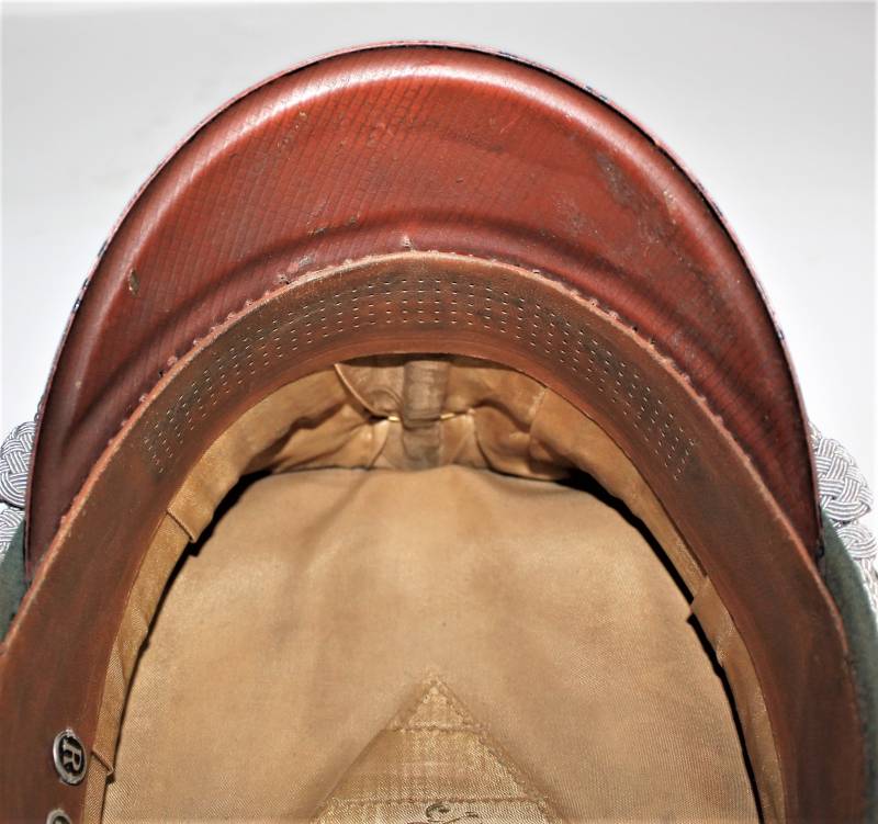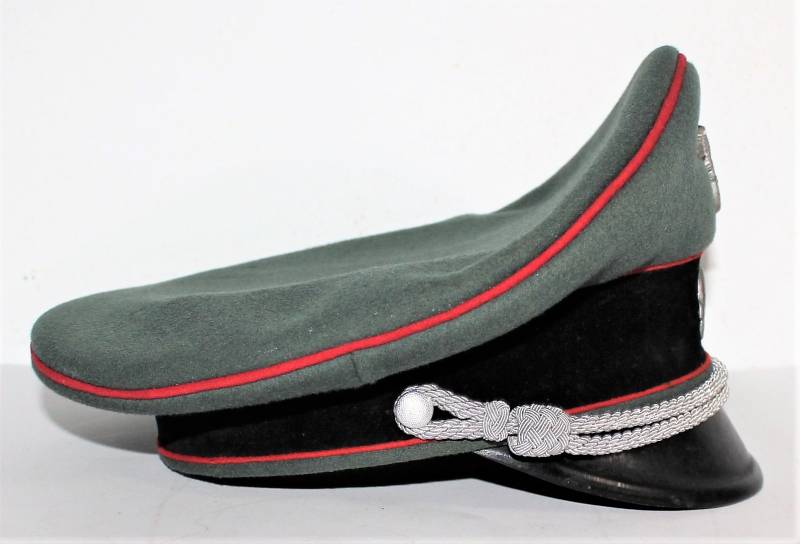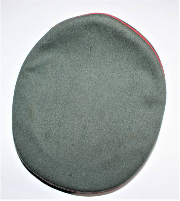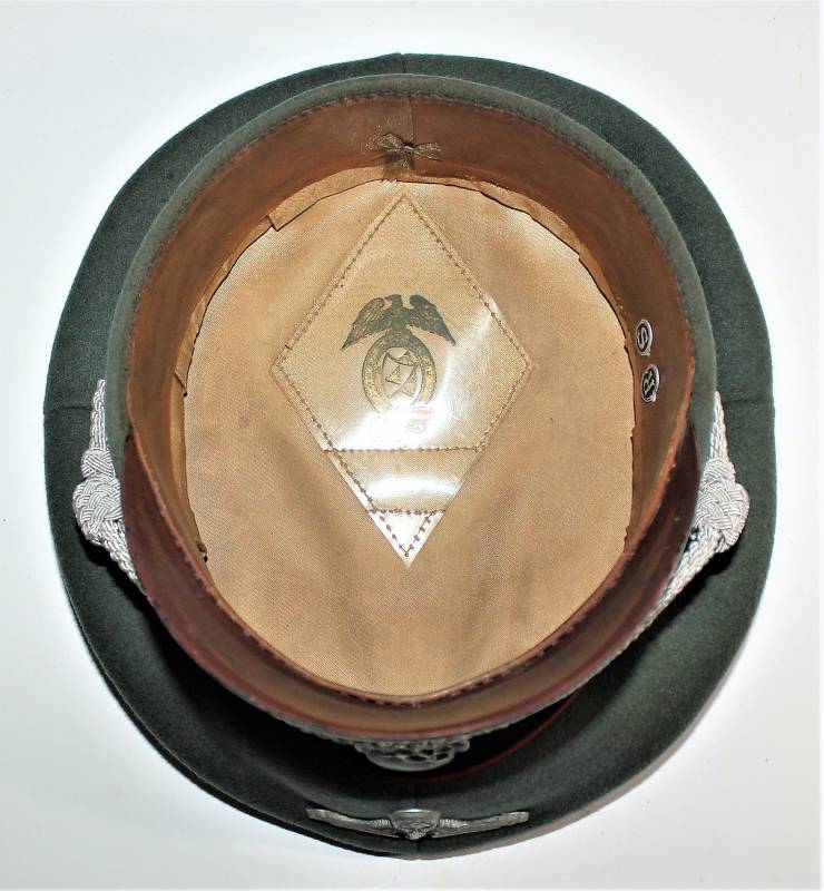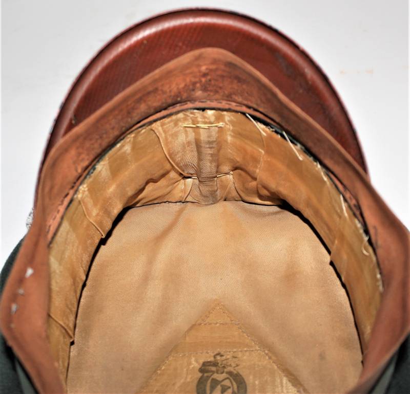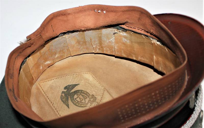 Stupendo schirmmutze da Ufficiale W.SS Artiglieria, waffenfarbe rosso, condizioni ottime, con segni del tempo e dellŽuso, non restaurato o riparato, completo in ogni sua parte, con fregi montati in epoca, allŽinterno diamante di celluloide con logo fabbricante, iniziali del nome in lamierino sul parasudore, taglia circa 56. Originale 100% WWII periodo.