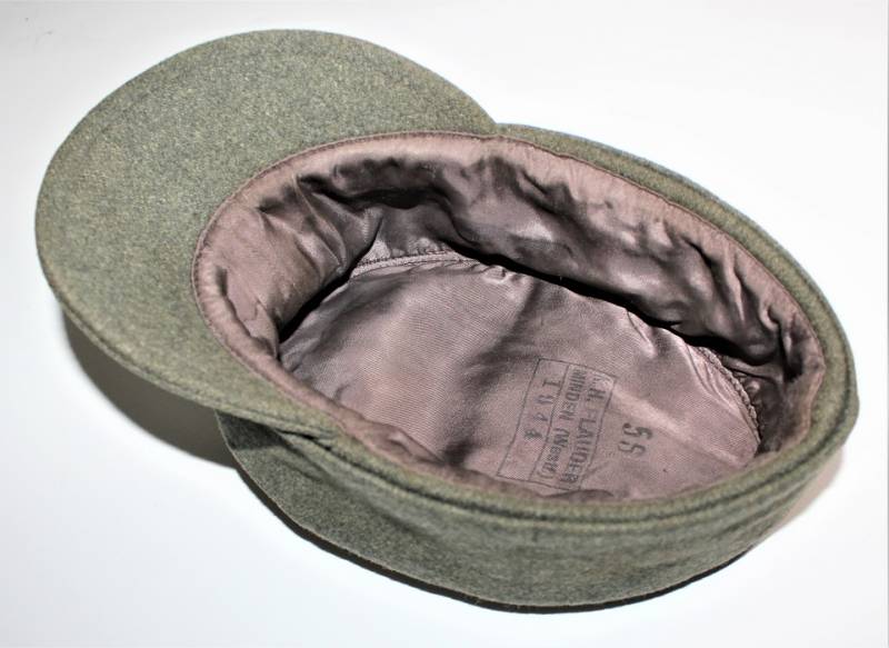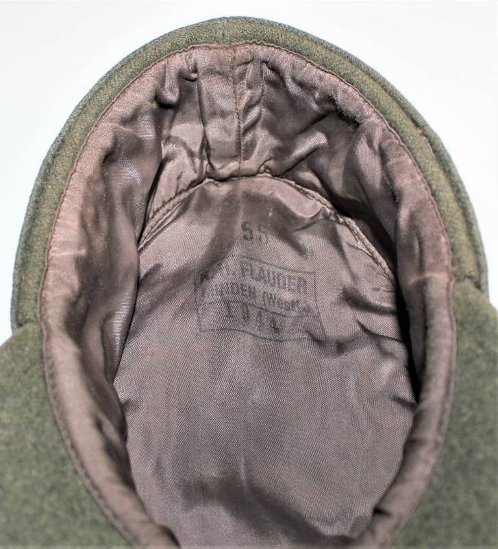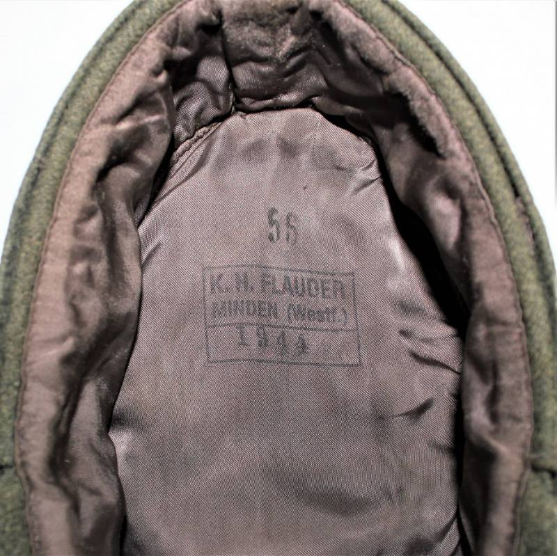 Berretto M43 da Truppa della Luftwaffe reparti Field Division e Hermann Goering, nato in panno di lana verde con fregio Luftwaffe sottopannato in tela verde montato in epoca, condizioni genarali molto buone, solo leggera patina del tempo e dellŽuso, non restaurato o riparato, senza buchi e strappi, cuciture perfette, marcato internamente con taglia 56, nome fabbricante e data 1944. Originale 100% WWII periodo.