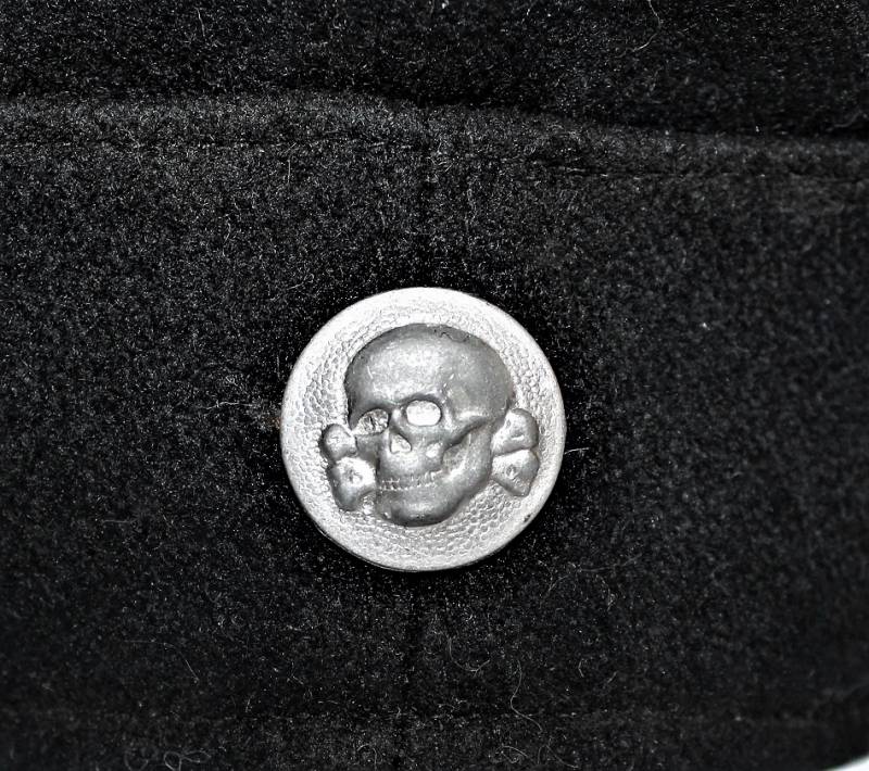 Bellissima e rara bustina M34 Allgemeine SS-VT, nata in panno di lana nero, perfetta e completa in ogni sua parte, quasi pari al nuovo, non restaurata o riparata, non camolata senza buchi o strappi, cuciture perfette, fregio montato in epoca cucito a macchina, allŽinterno etichetta dŽaccettazione RZM SS.. cucita in epoca, marcatura VA 1938 e taglia 57. Originale 100% WWII periodo.