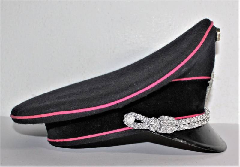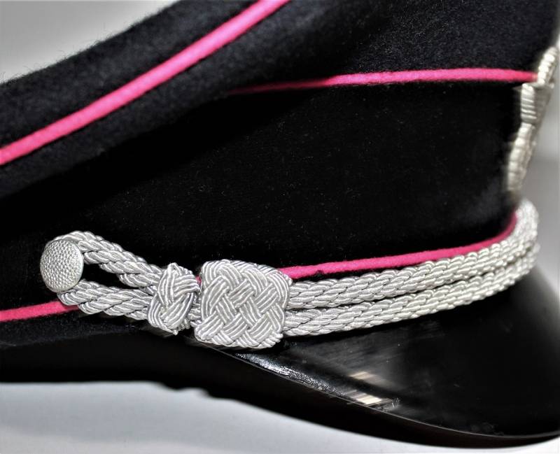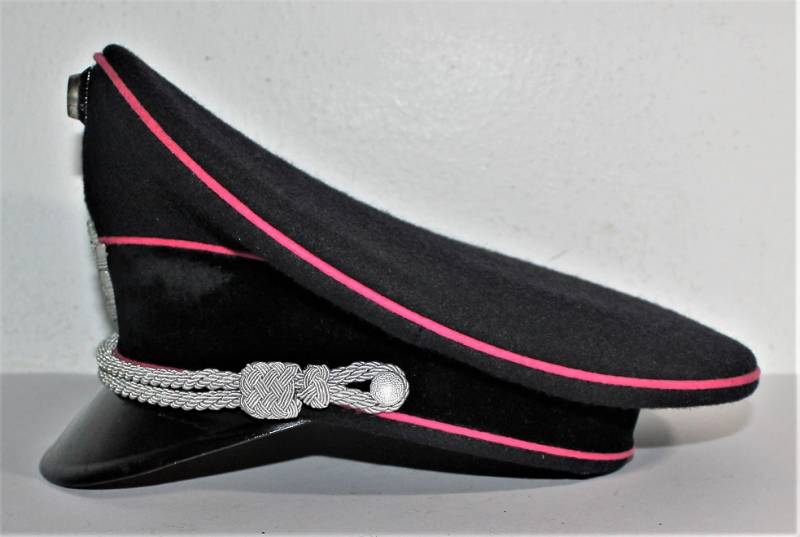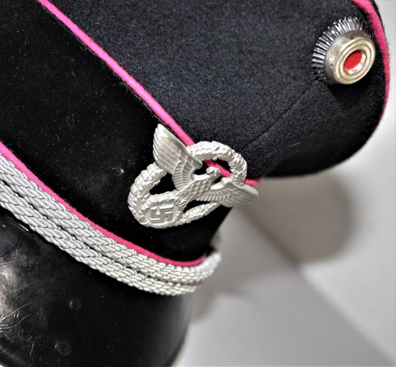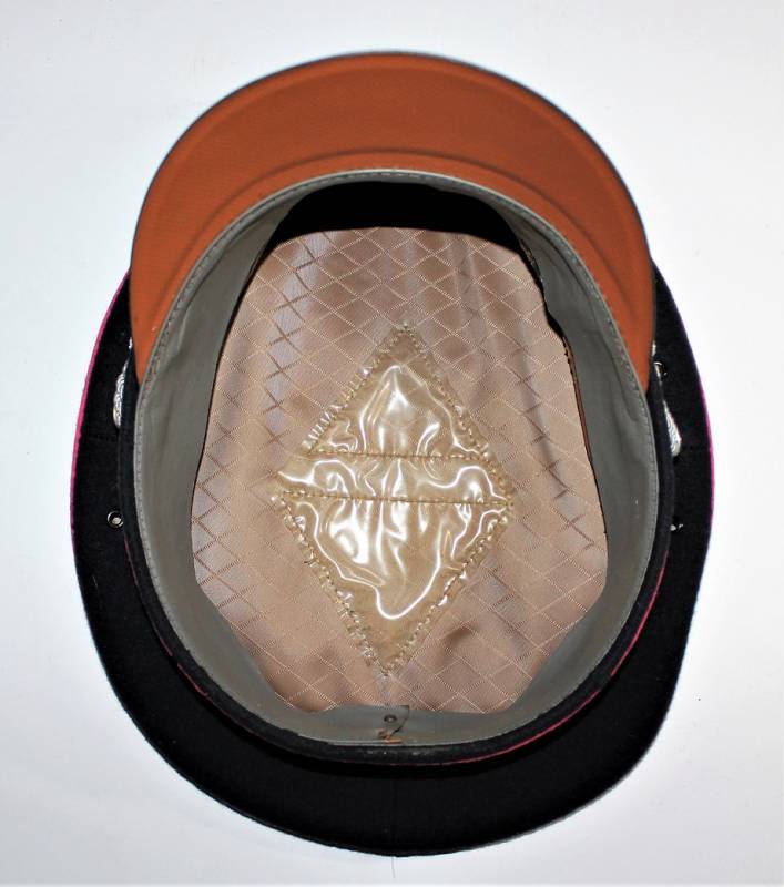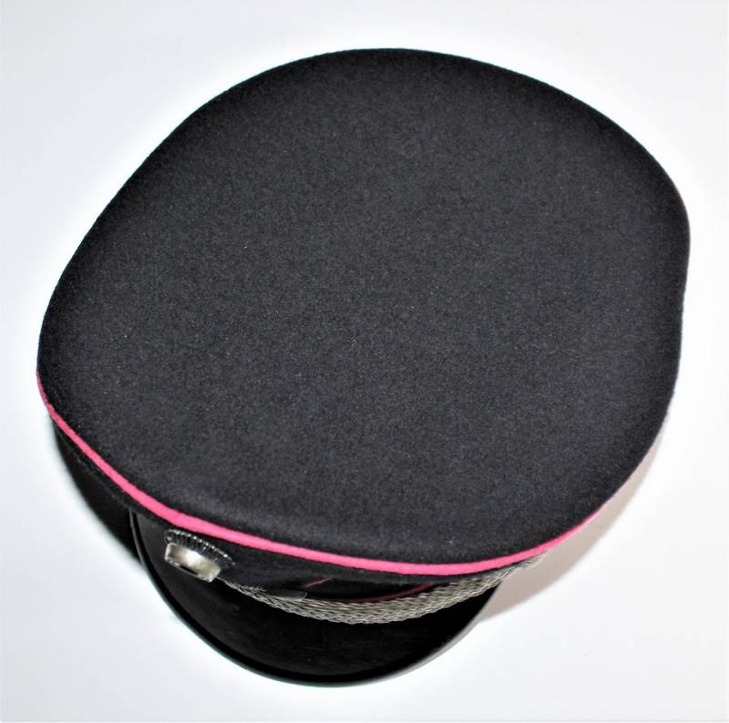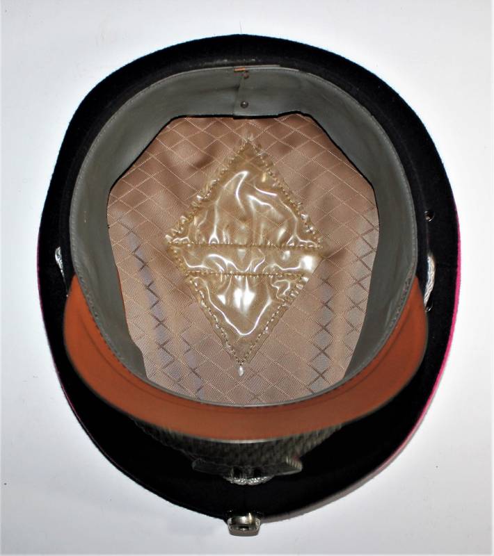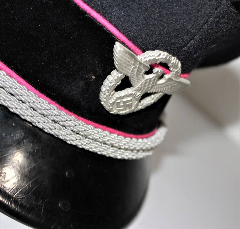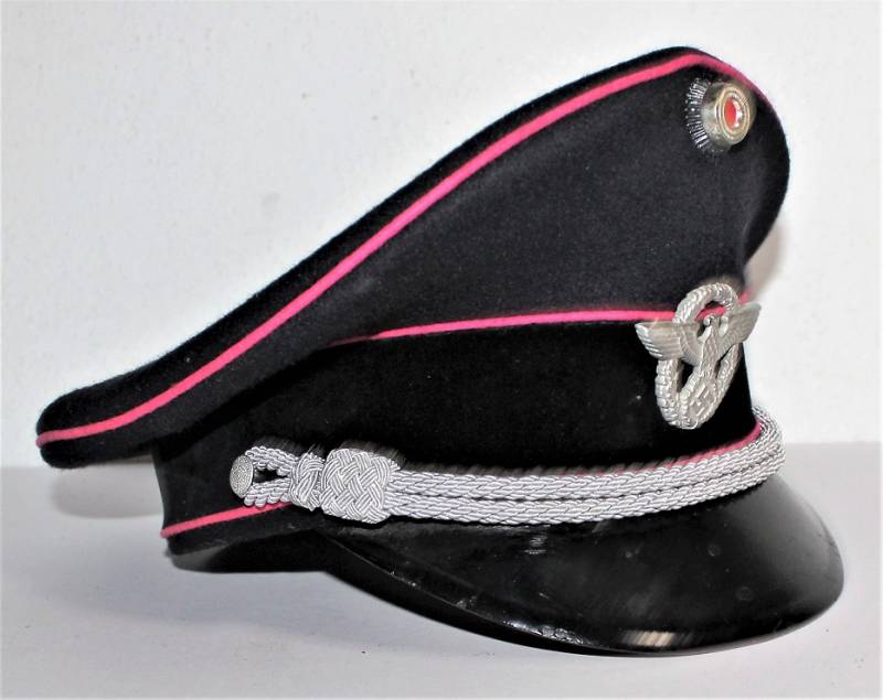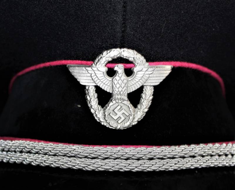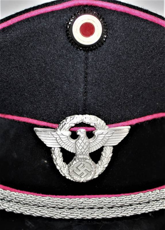 Bellissimo berretto da Ufficiale della Polizia, condizioni ottime quasi pari al nuovo, nato in elegante panno di lana blu, non restaurato o riparato, completo in ogni sua parte, senza buchi o strappi, tutte le cuciture sono perfette e integre, il tutto con leggerissima patina del tempo e dellŽuso, waffenfarbe rosso, fregi mai smontati montati in epoca, allŽinterno diamante di celluloide. Taglia circa 57.
