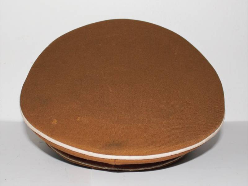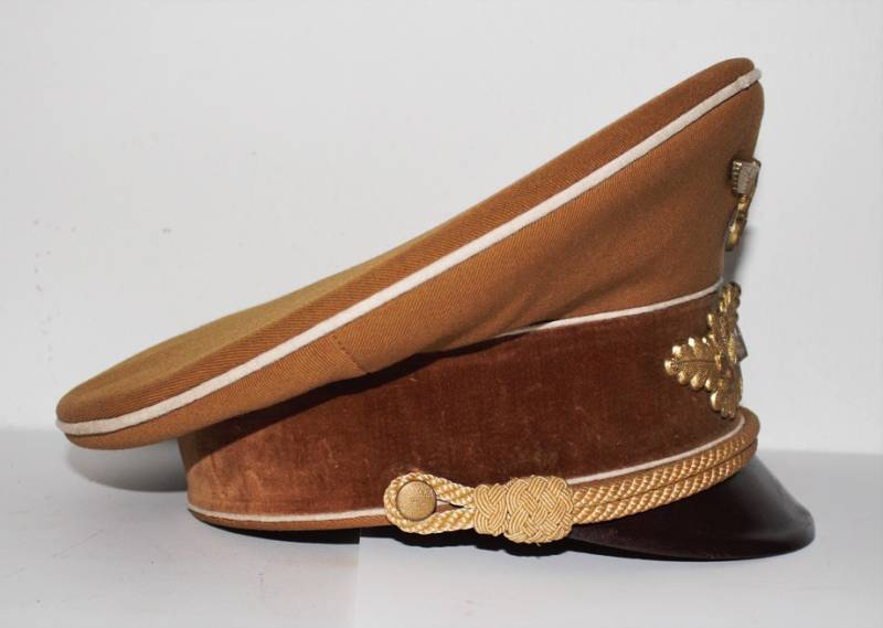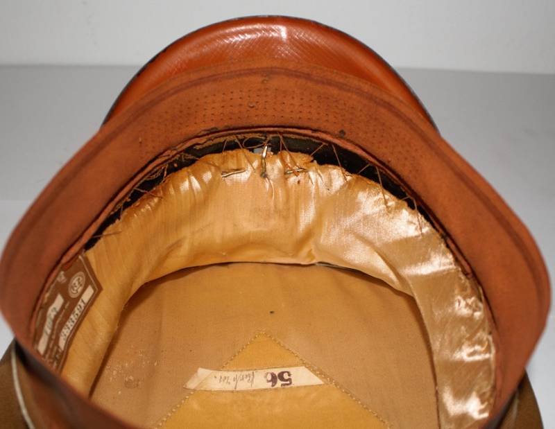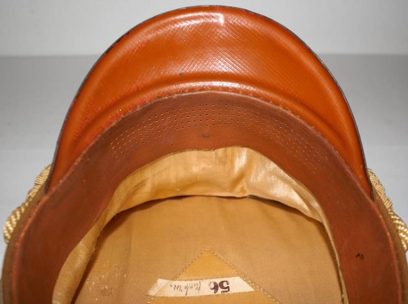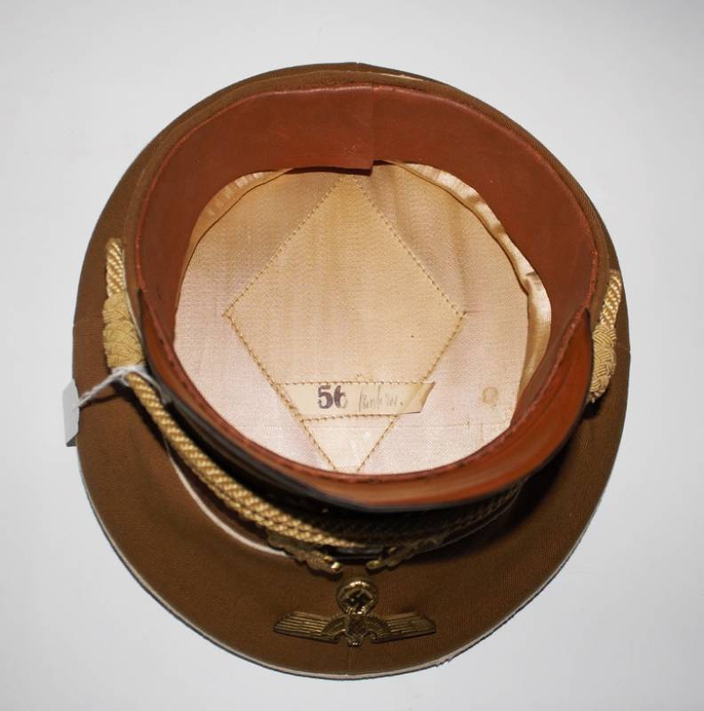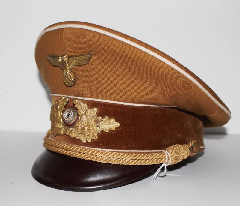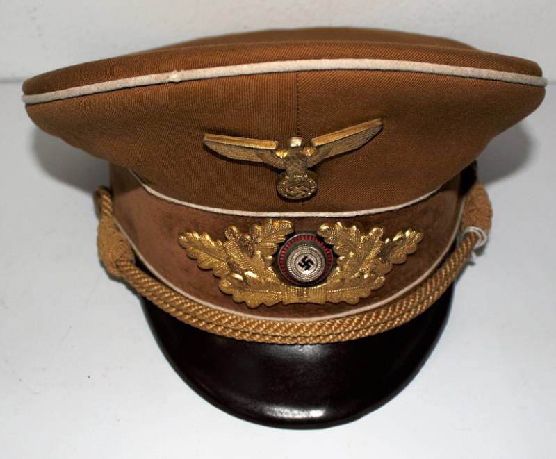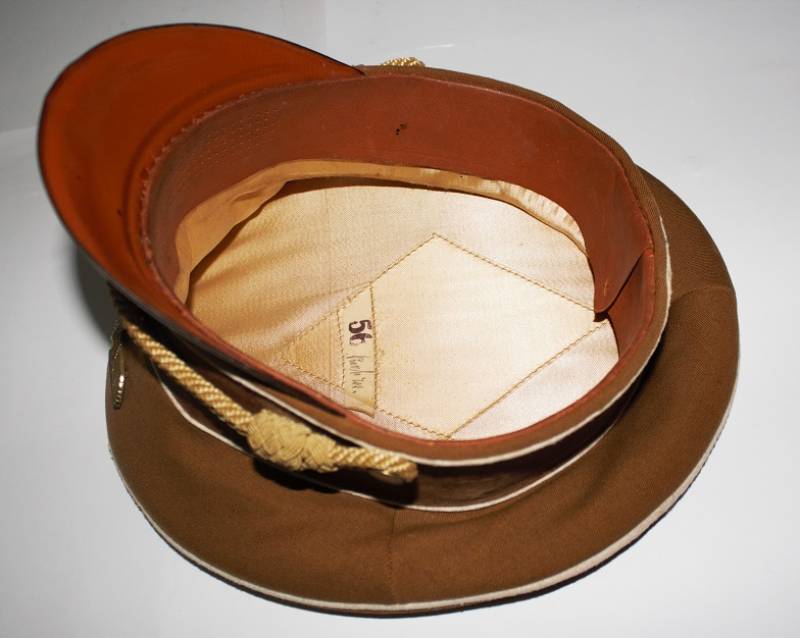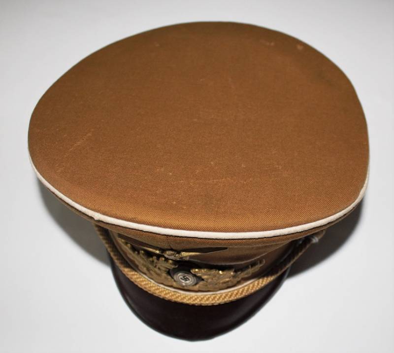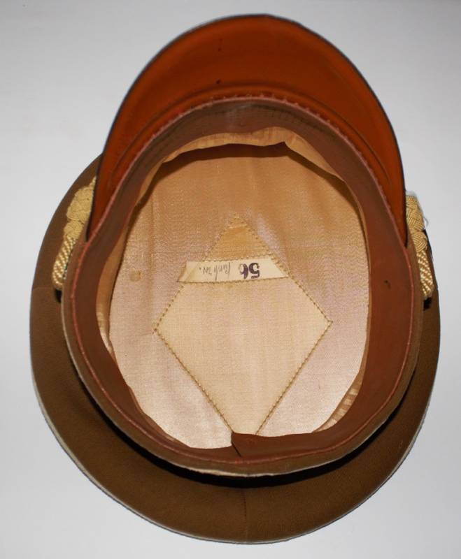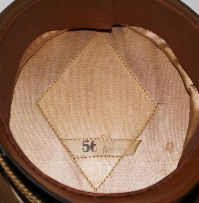 Raro schirmmutze N.S.D.A.P. Kreisleiter leader politico waffenfarbe bianco, ottime condizioni leggeri segni del tempo e dellŽuso completo in ogni sua parte, fregi mai rimossi con patinatura, realizzato in gabardina diagonale colore marrone tipico N.S.D.A.P. Internamente con diamante di celluloide, taglia 56 e nome scritto dellŽufficiale, cartellino "tuchmutze RZM" cucito sotto il parasudore. Originale 100%. WWII periodo.